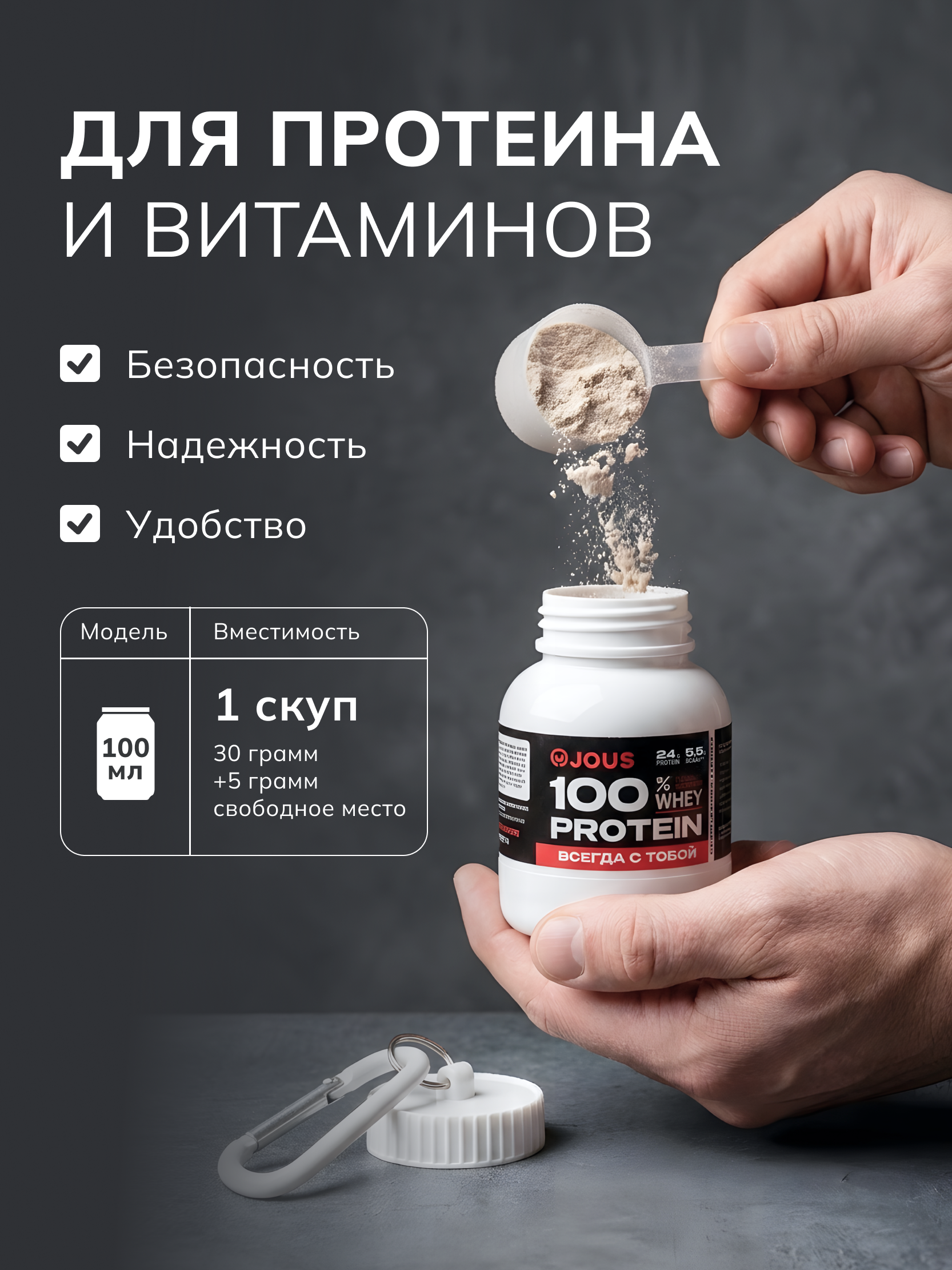 Объем: 100 мл — идеальный размер для удобного хранения спортивного питания, витаминов и сухих продуктов.