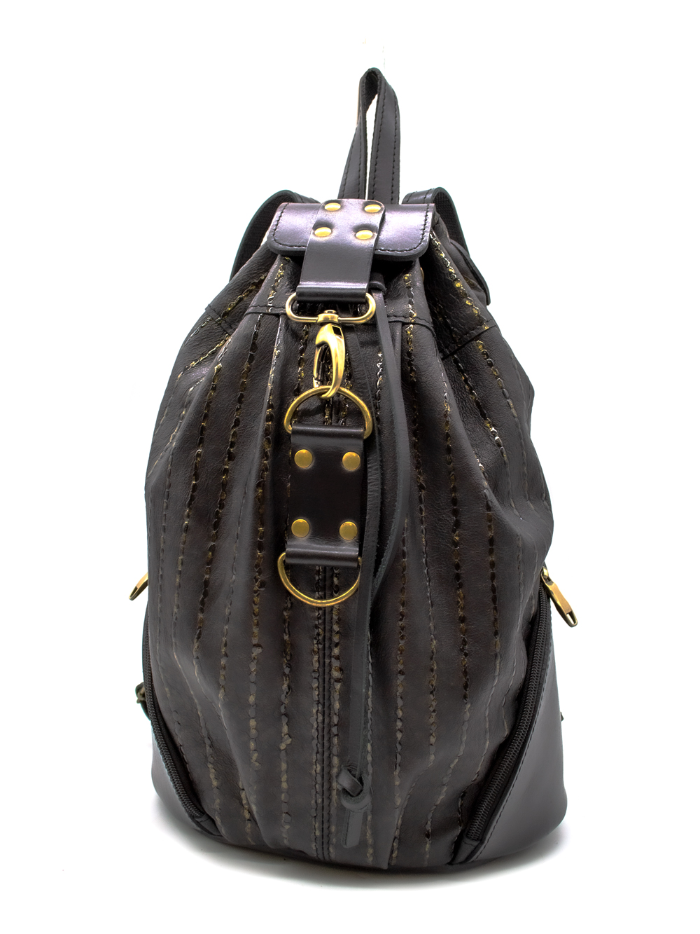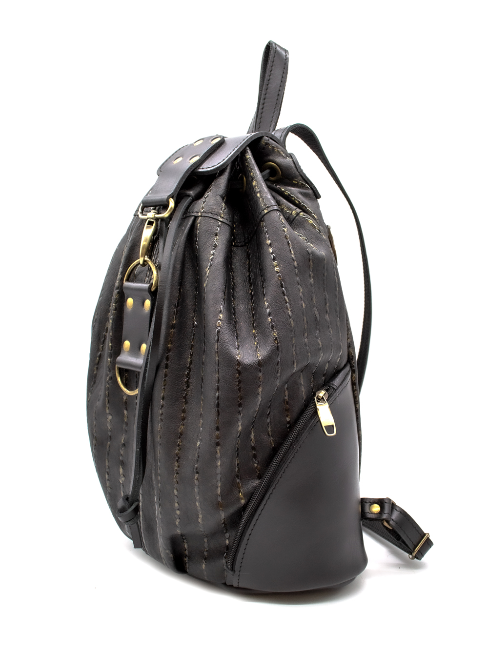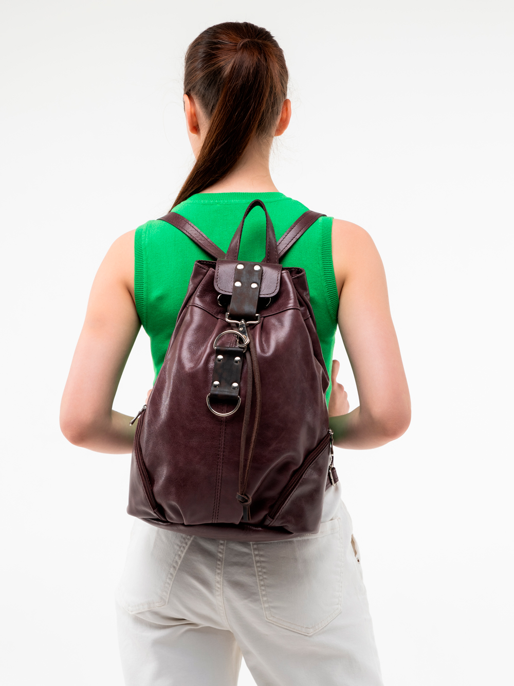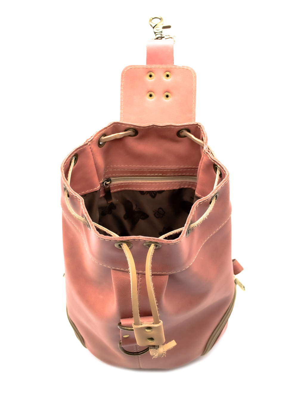 Женский кожаный рюкзак "Скиппи" - стильный женский аксессуар средних размеров. Сшит из натуральной европейской кожи и будет радовать хозяйку своей компактностью и удобством! Внутри одно вместительное отделение для всех необходимых вам вещей, карман на молнии для документов карман на задней стенке. Наружные (боковые) карманы можно приспособить под разные мелочи, а карман на спинке отлично подойдет для телефона, закрывается на молнию. Внутри рюкзак "Скиппи" на подкладке. Сверху затягивается на кожаный шнурок и закрывается на карабин.