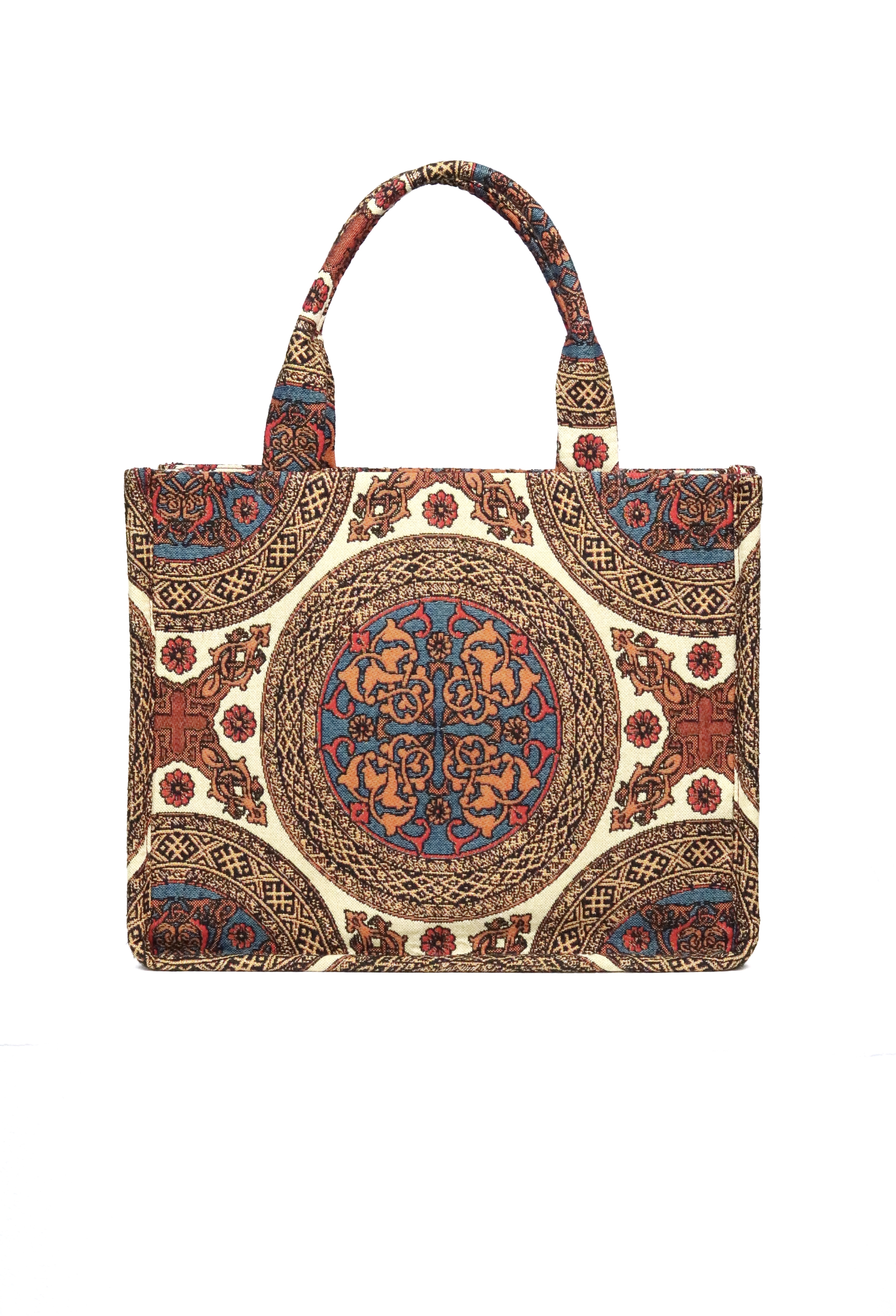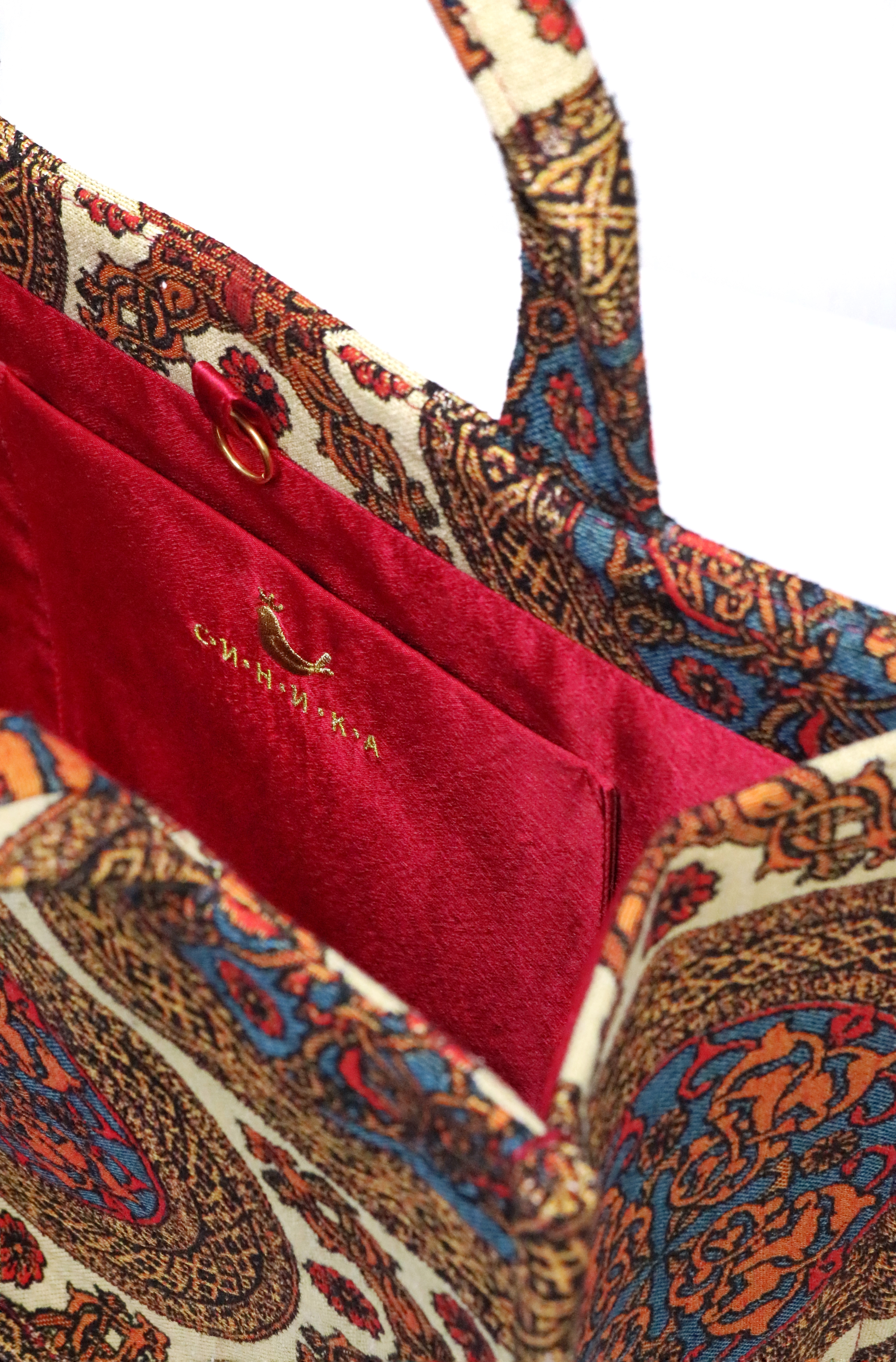 Модель из гобеленовой ткани имеет основное отделение с внутренним карманом, украшенным фирменной золотой вышивкой – коронованной птичкой. Сумка имеет золотистую застежку – карабин и кольца на ременных карабинах для крепления съемного ремня с логотипом Синика. Ремень включен в комплект сумки.