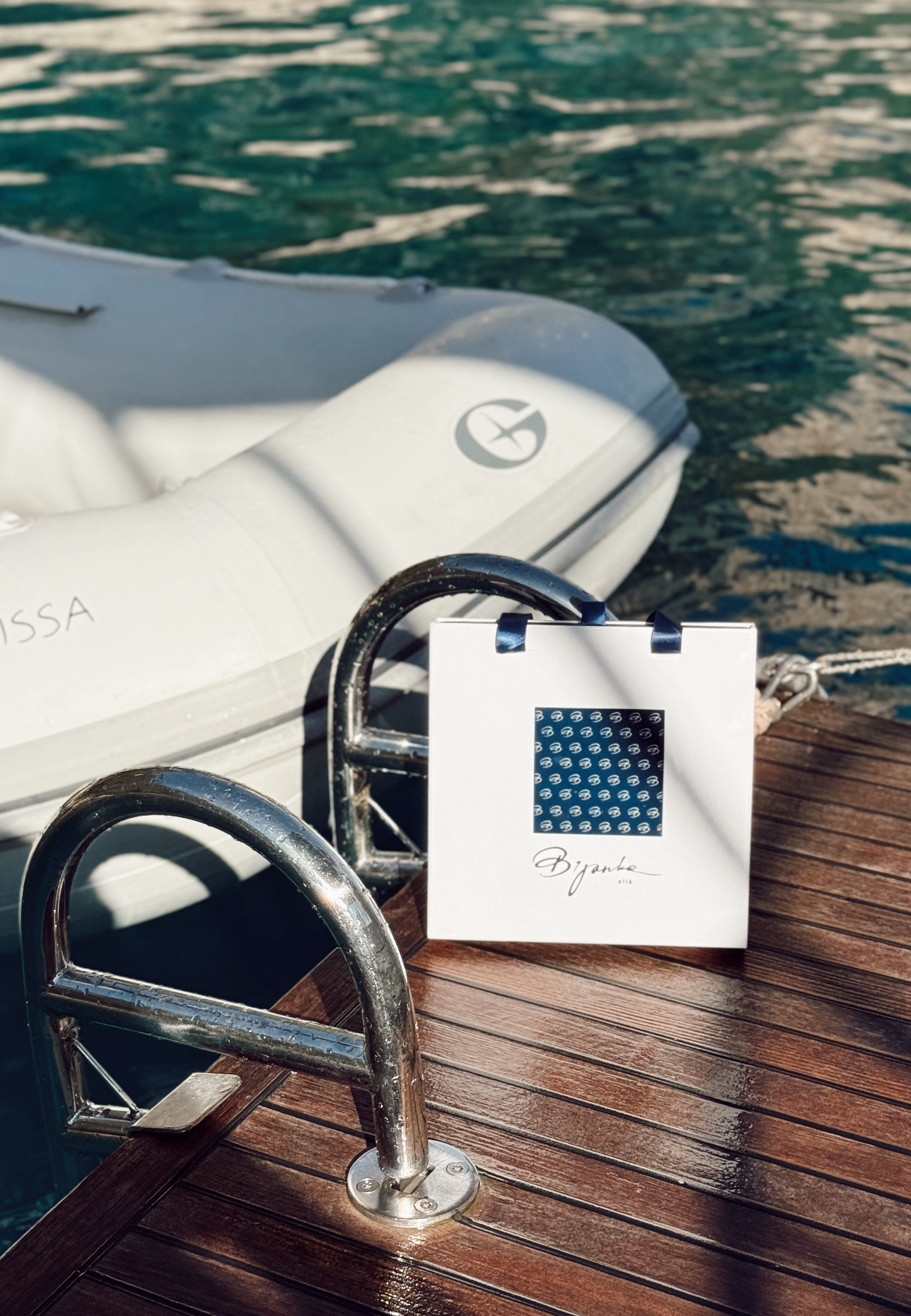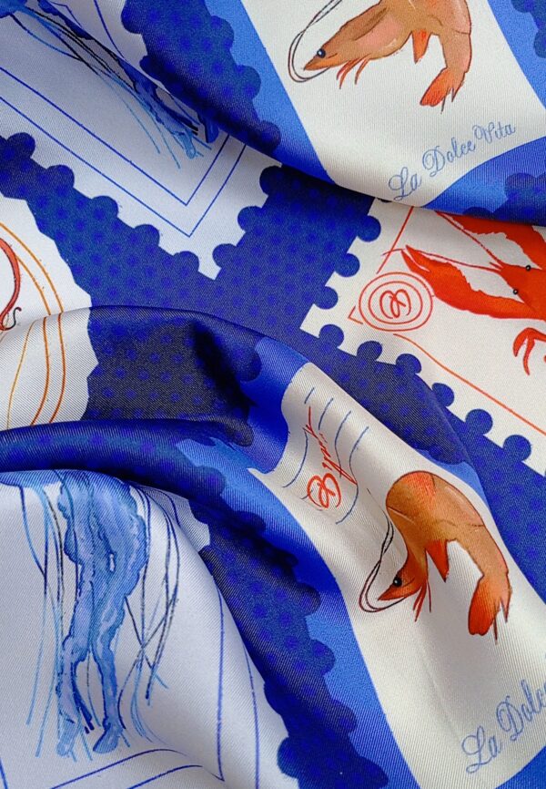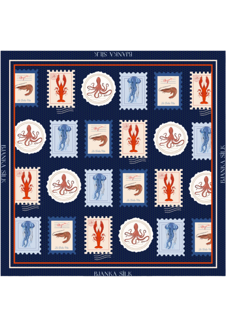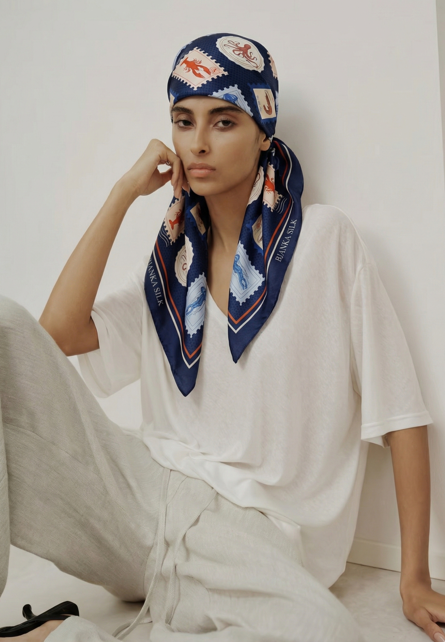 Коллекция «Письма с Капри» — морская открытка из Италии. Шелковый платок на голову BJANKA SILK — это не просто аксессуар, а настоящая история. Коллекция вдохновлена эстетикой средиземноморских каникул, яркими марками с морскими обитателями и духом итальянской dolce vita. Каждый платок выполнен из 100% натурального шелка с ручной подгибкой. Тонкая работа, яркий принт и мягкий блеск шелка превращают его в коллекционный предмет. Дизайн сочетает в себе: Ретро-открытки и морскую тематику: осьминоги, медузы, креветки и лобстеры в стилистике винтажных марок. Мягкую, но выразительную палитру: оттенки кораллового, морского синего и кремового. Идеальные пропорции: 90×90 см — универсальный размер для стильных образов. Каждый платок выполнен из 100% натурального шелка с ручной подгибкой. Тонкая работа, яркий принт и мягкий блеск шелка превращают его в коллекционный предмет.