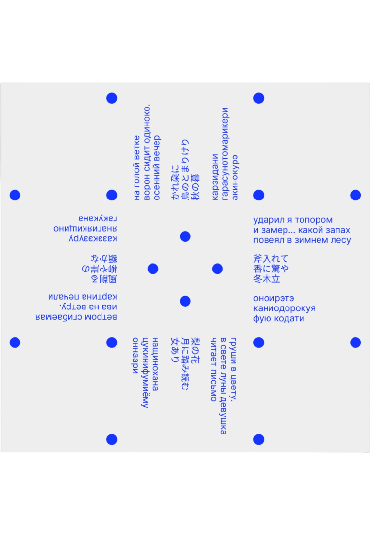 Традиционное хокку — это строгая система ритма для описания переживаний и мыслей человека через сезонность в природе. Семнадцать слогов в три строки в порядке пять / семь / пять. ‎Важно понимать, что «рифма» здесь воспринимается именно за счёт ритма, а не окончаний слов. Чтобы это прочувствовать нанесли транскрипцию на кириллице, помимо оригинала и поэтического перевода.