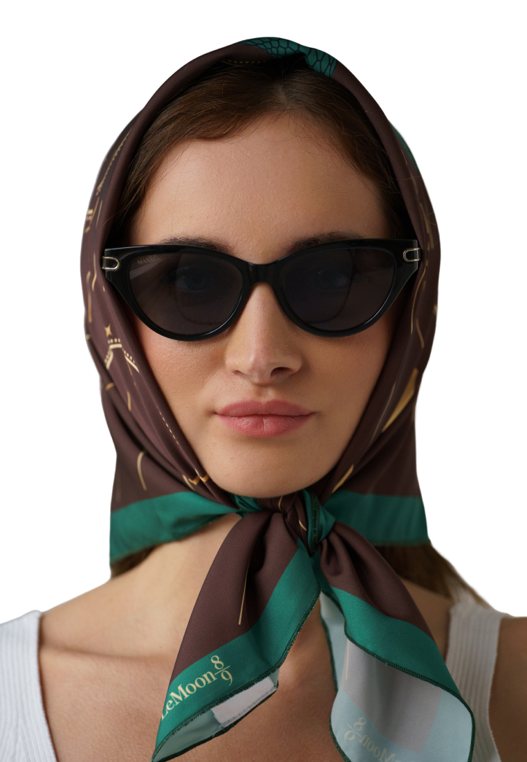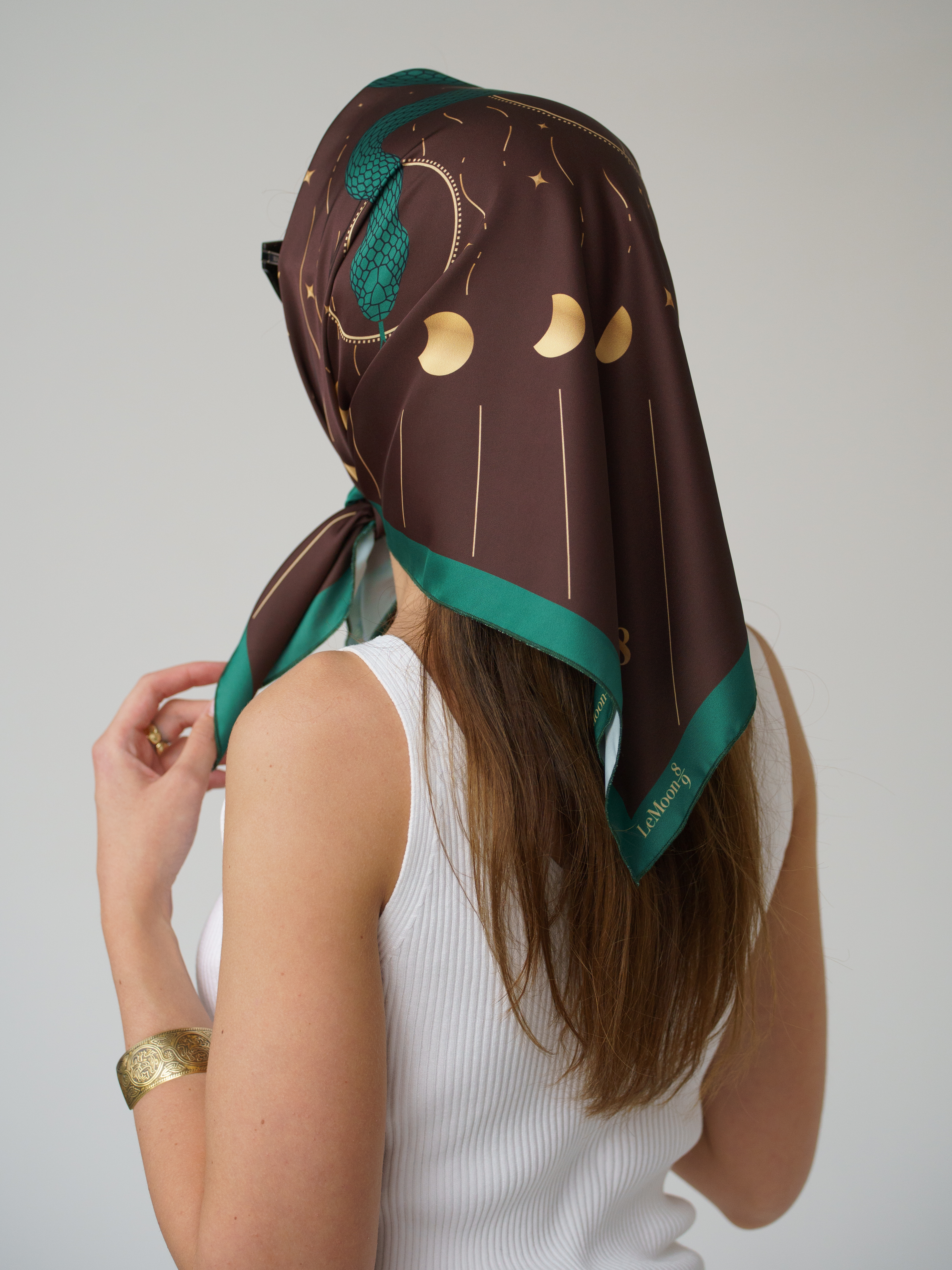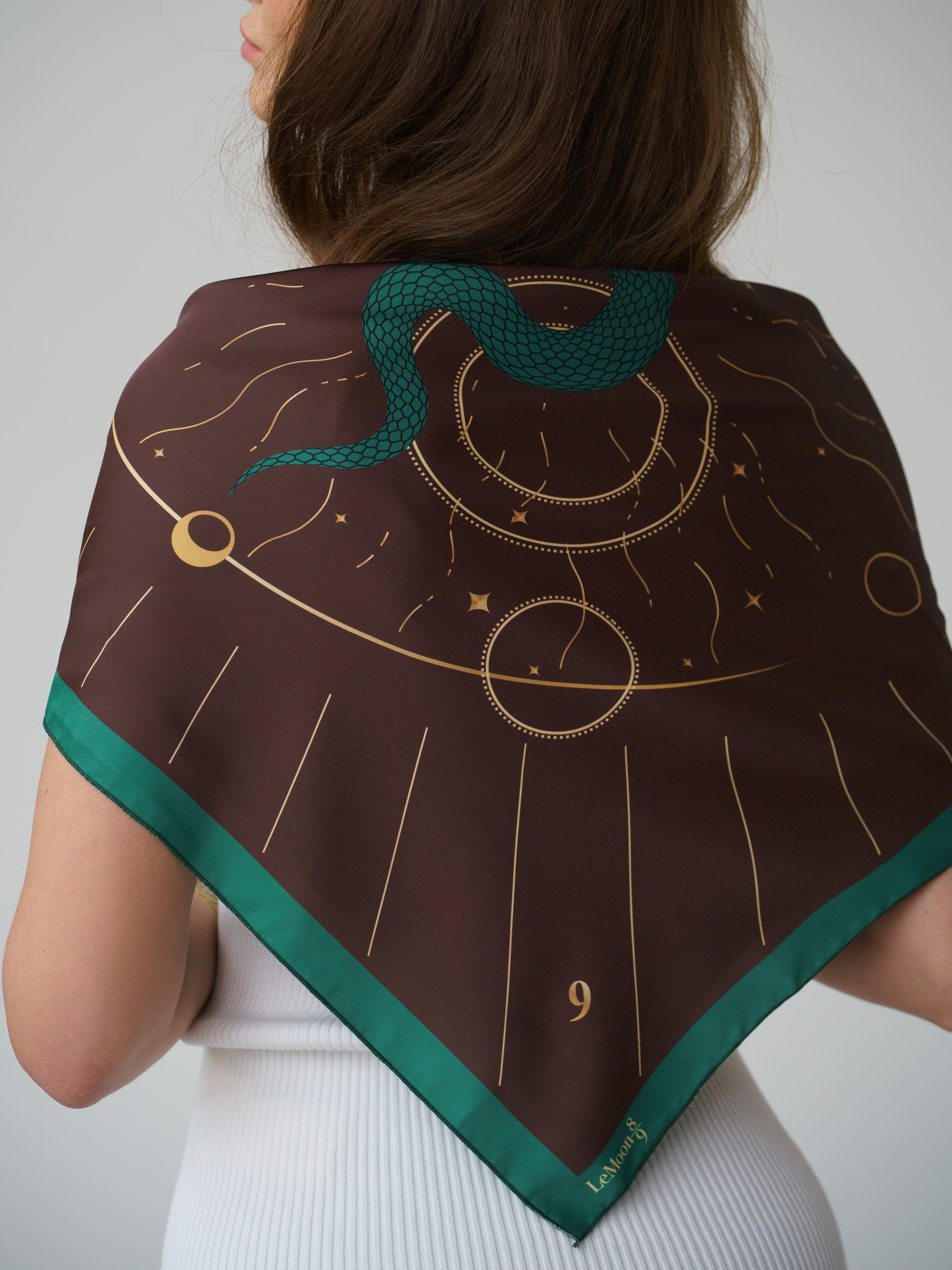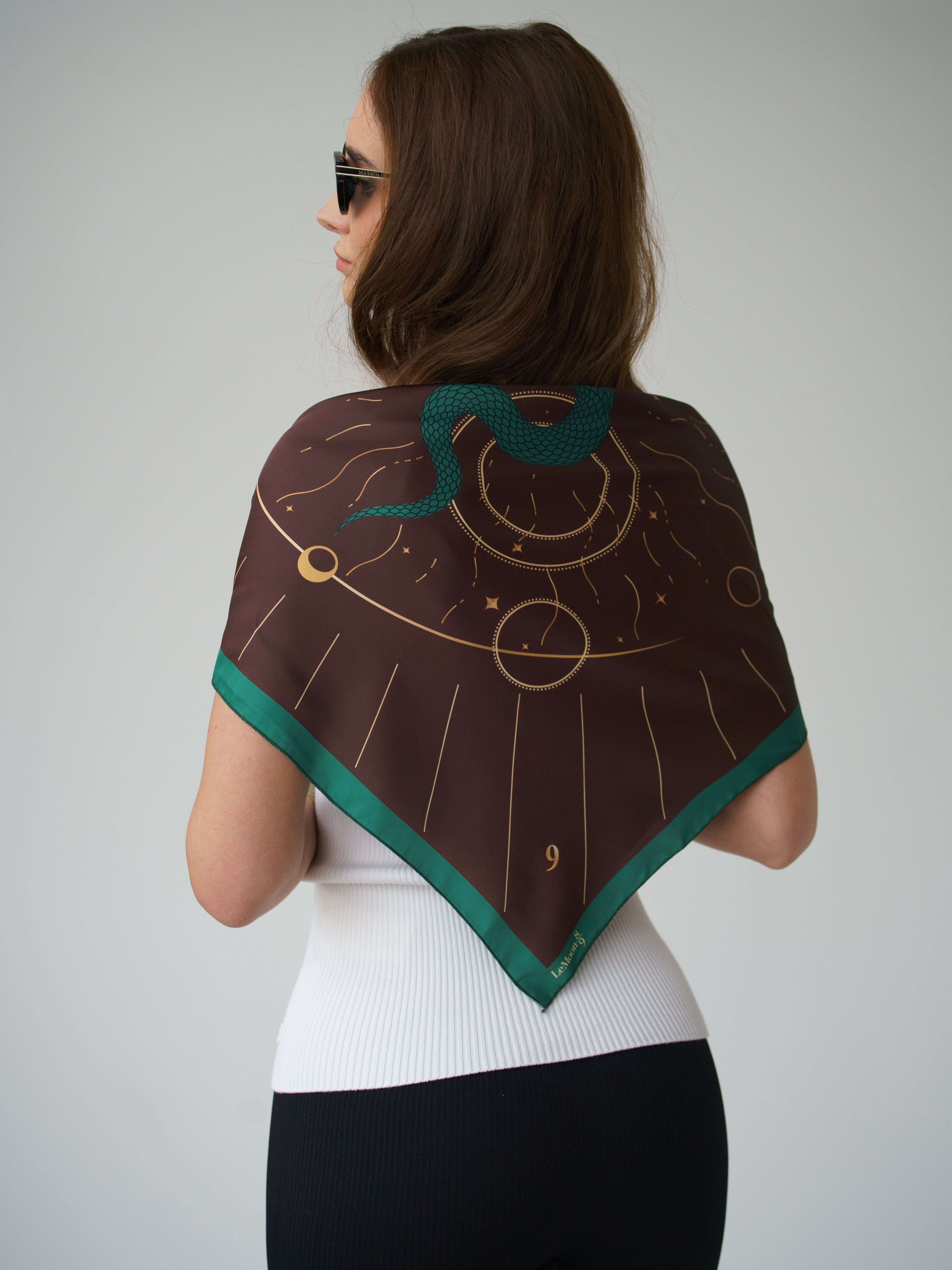 Лёгкий шёлк, благородные коричневые и зелёные оттенки, загадочный узор из чисел — это аксессуар, который выглядит дорого, ощущается приятно и подходит к любому стилю.