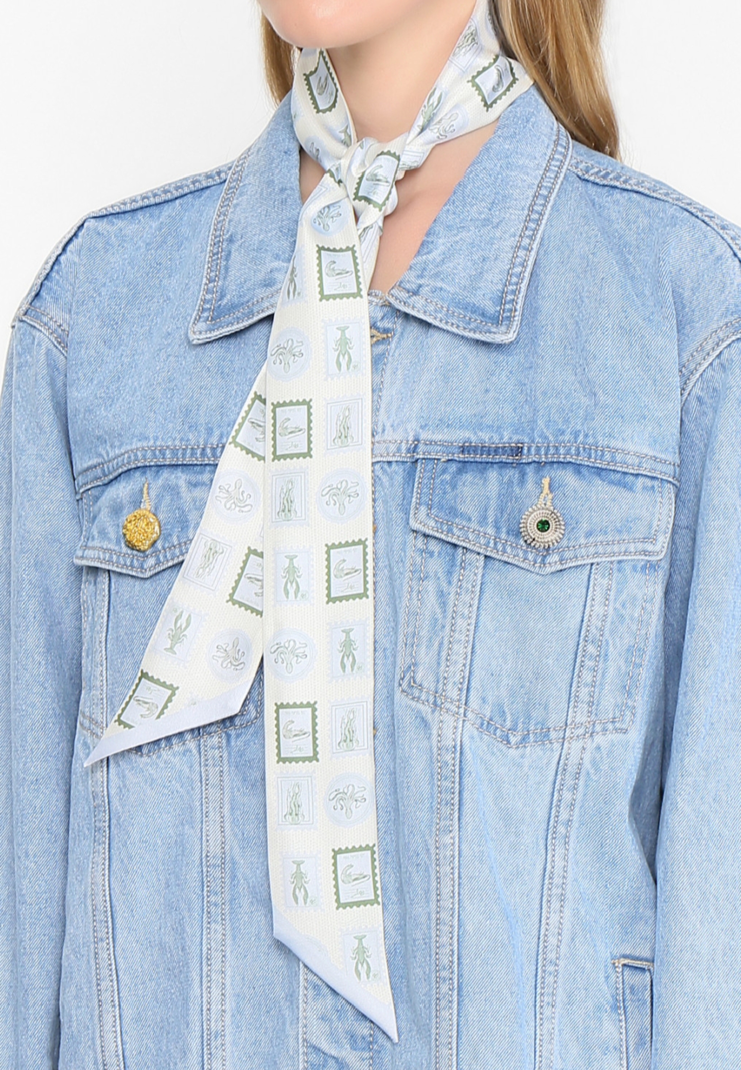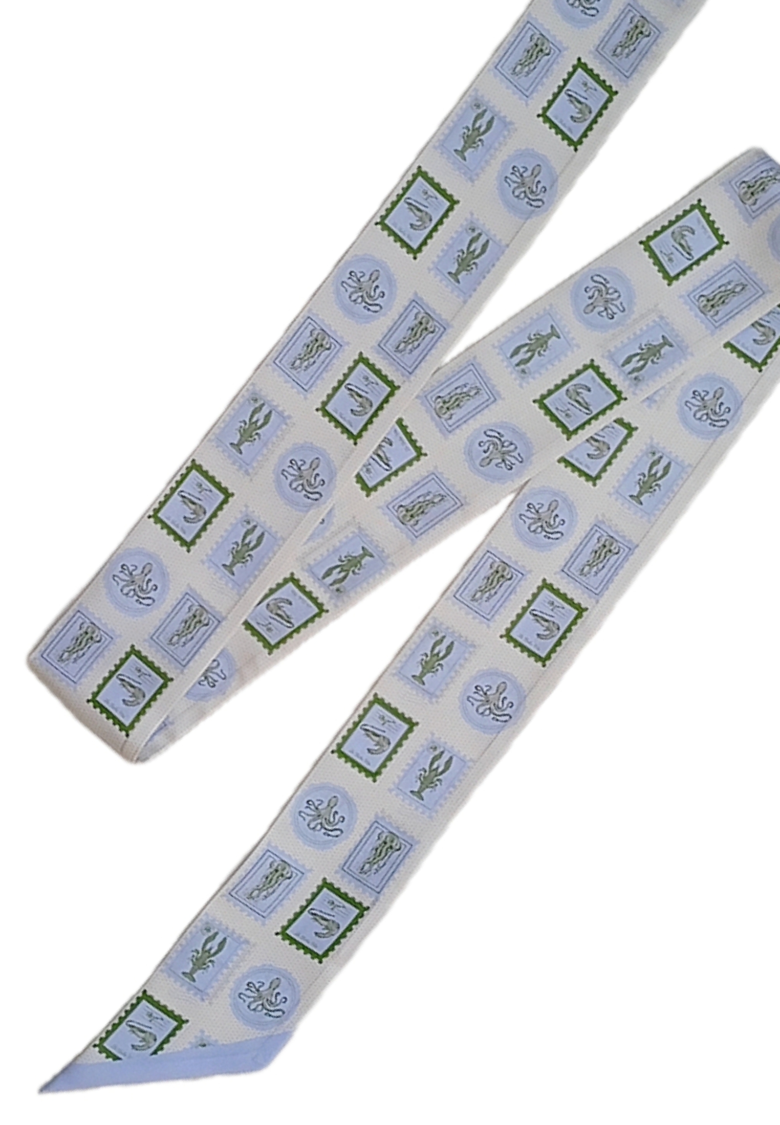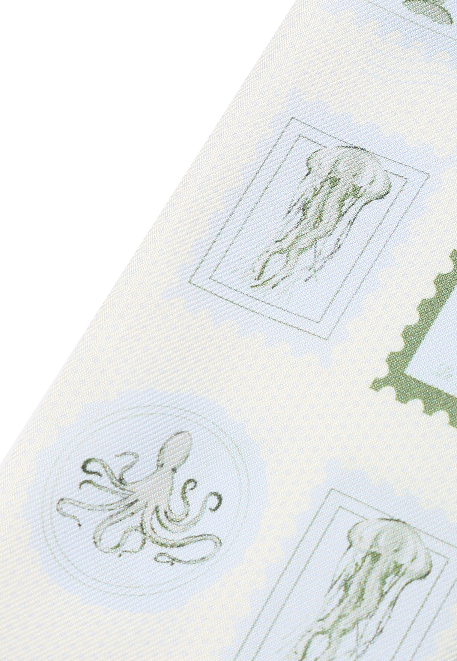 Каждый шарф твилли выполнен из 100% натурального шелка. Тонкая работа, яркий принт и мягкий блеск шелка превращают его в коллекционный предмет. Дизайн сочетает в себе ретро-открытки и морскую тематику: осьминоги, медузы, креветки и лобстеры в стилистике винтажных марок.