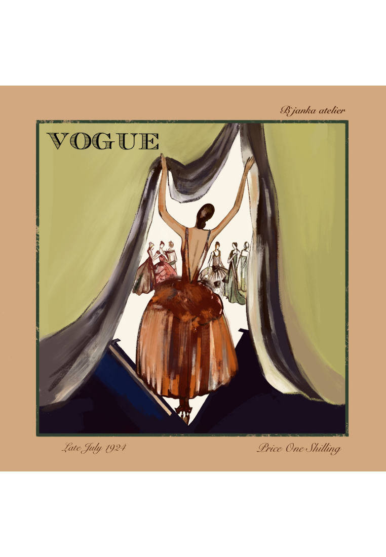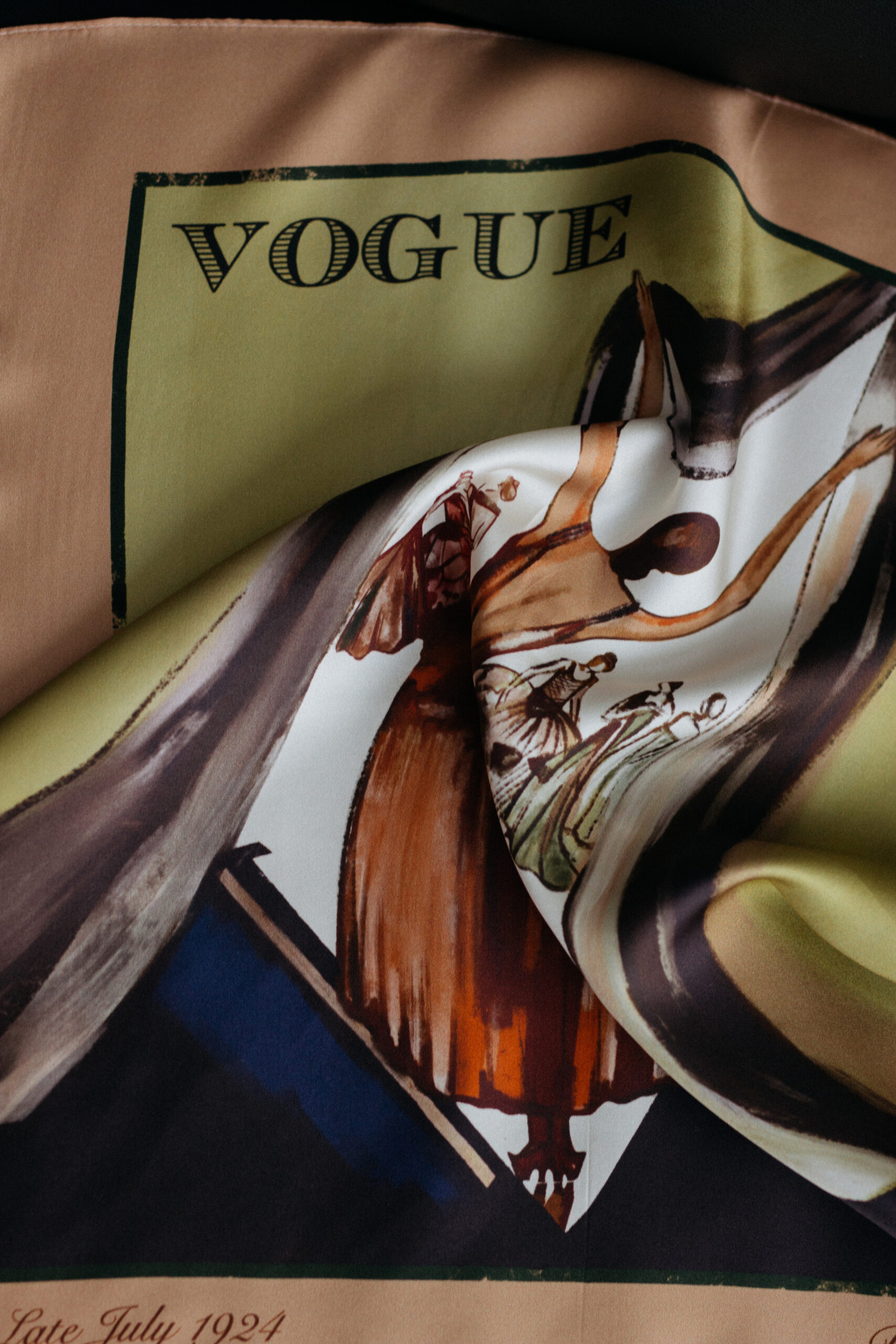 Шейный платок из коллекции "Golden Vogue 20th", которая вдохновлена "Золотыми двадцатыми" прошлого столетия. Это время бурного развития культурной и социальной жизни после Первой мировой войны, символом которого стал журнал "Vogue". Коллекция воссоздает обложки этого легендарного журнала, что придает платку особую атмосферу и уникальность. Изготовлен из 100% натурального шелка Mulberry, самого ценного вида шелковых волокон. Для печати используются экологически чистые пигменты.