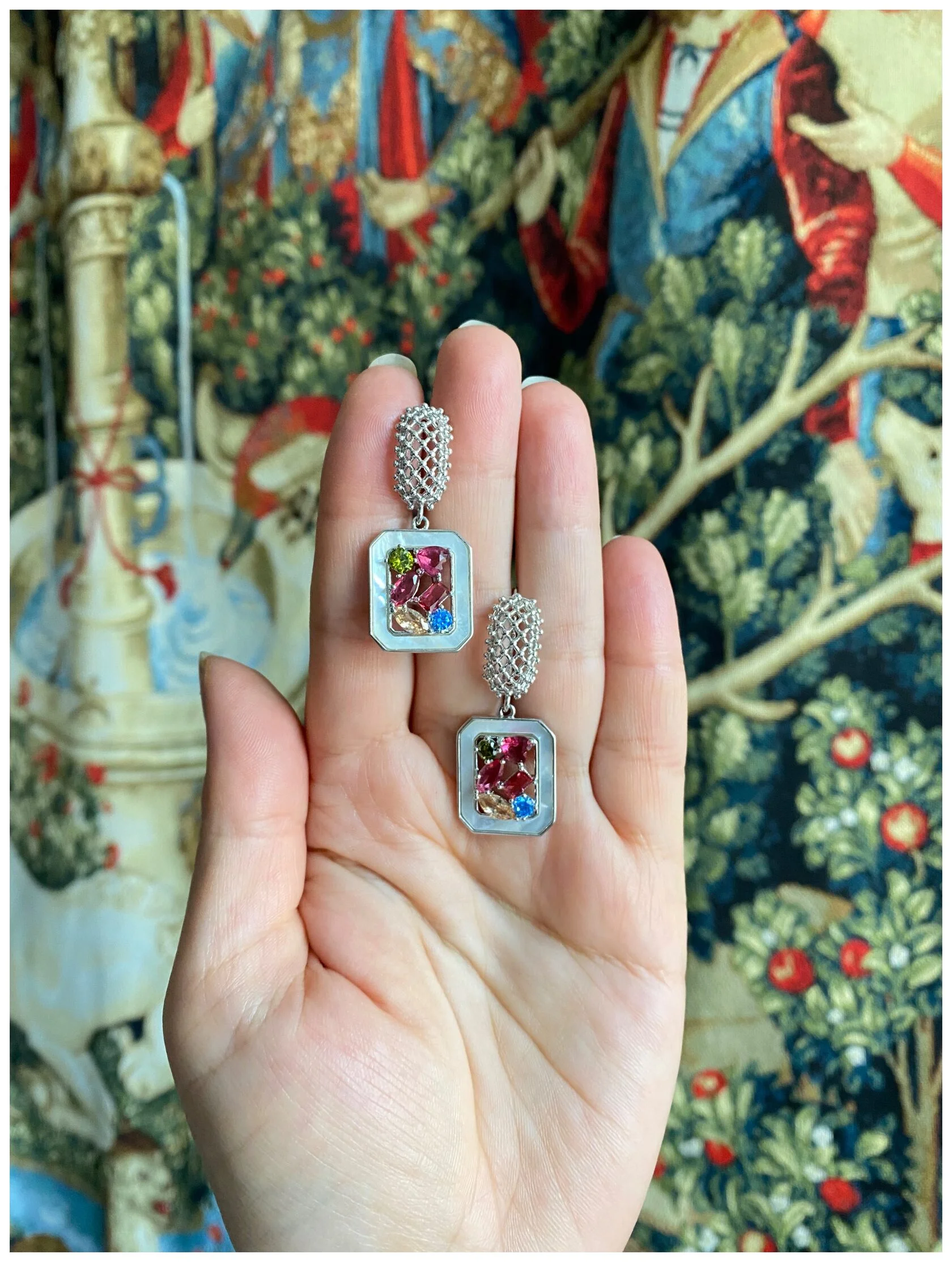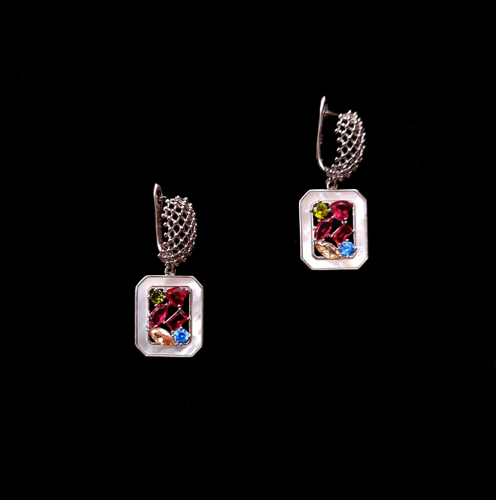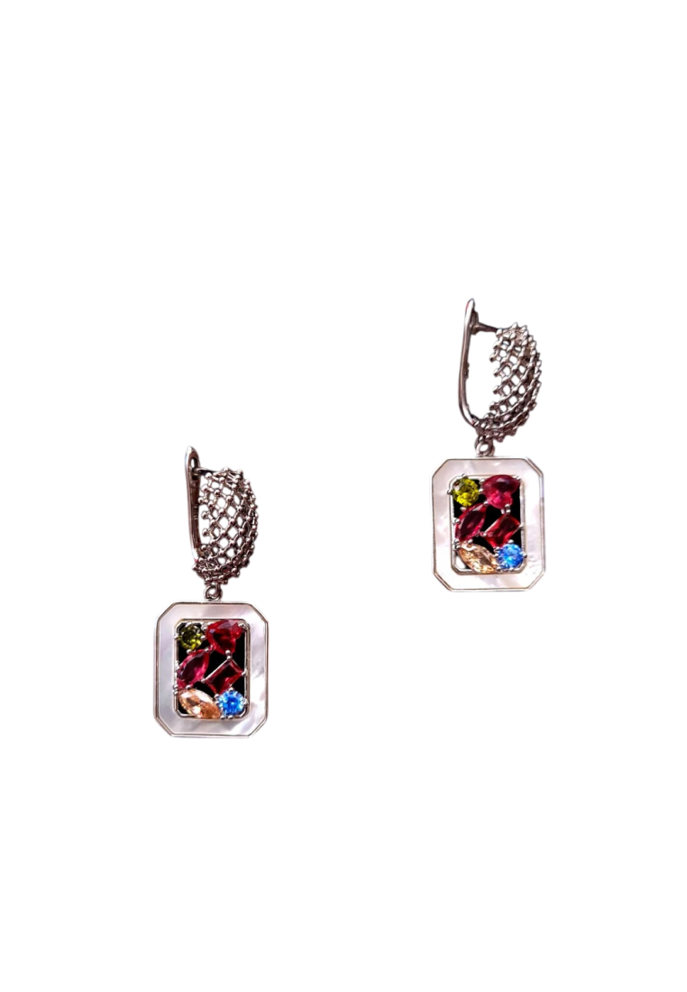 Классические серьги украшены подвесками натурального перламутра и разноцветными фианитами. Английский замок
