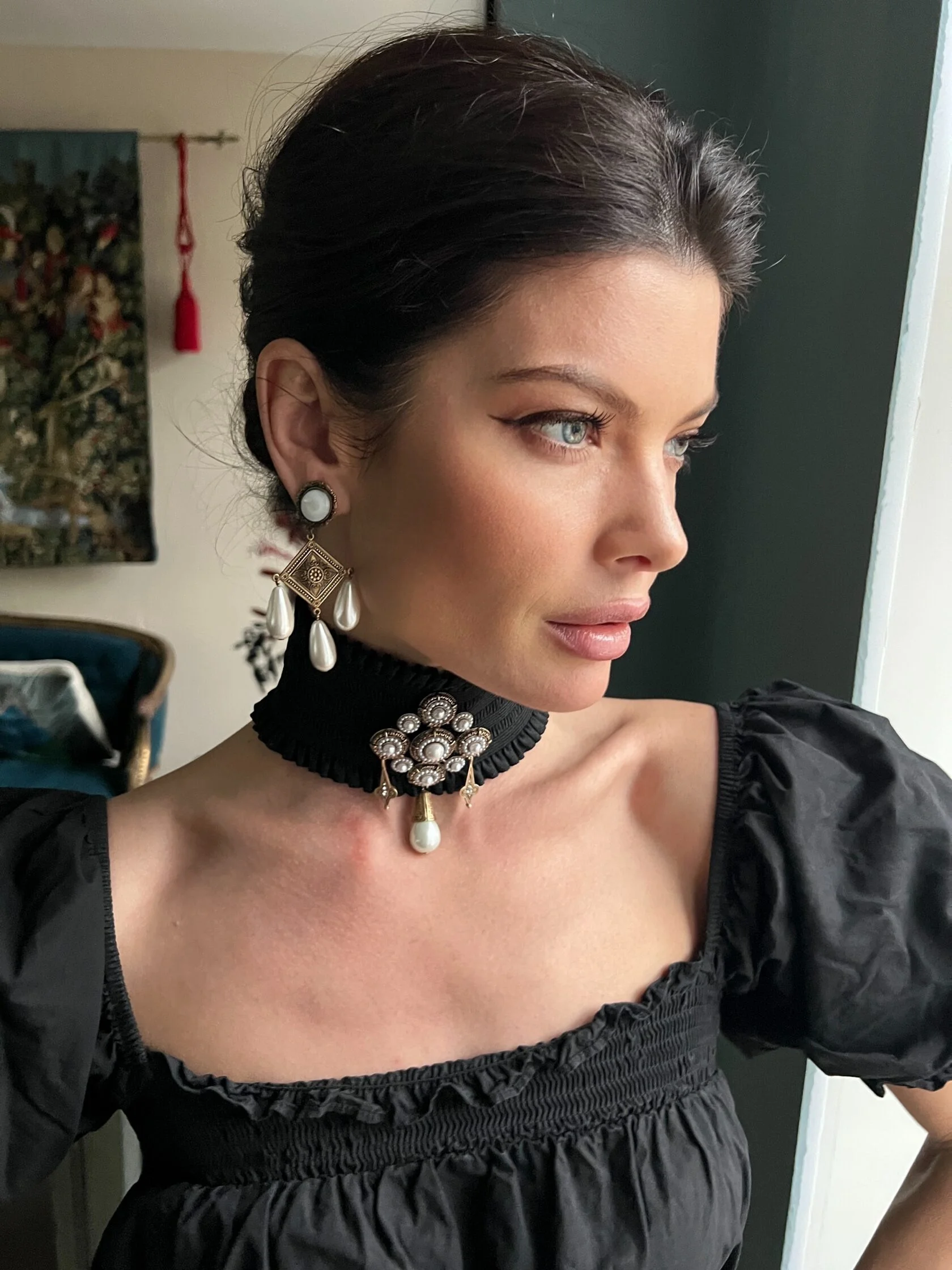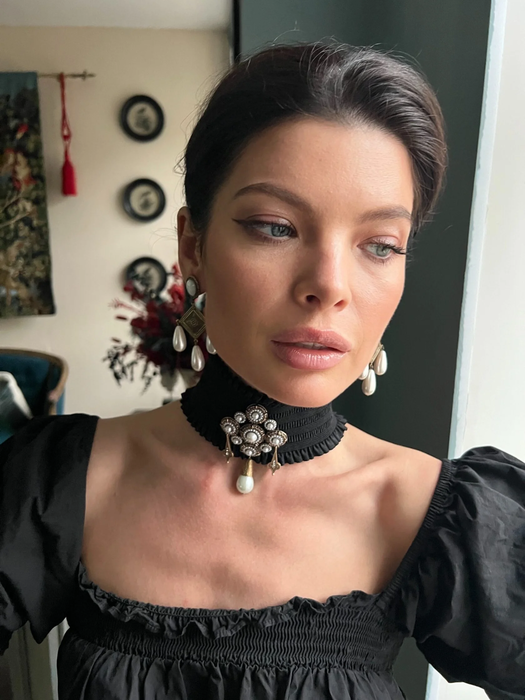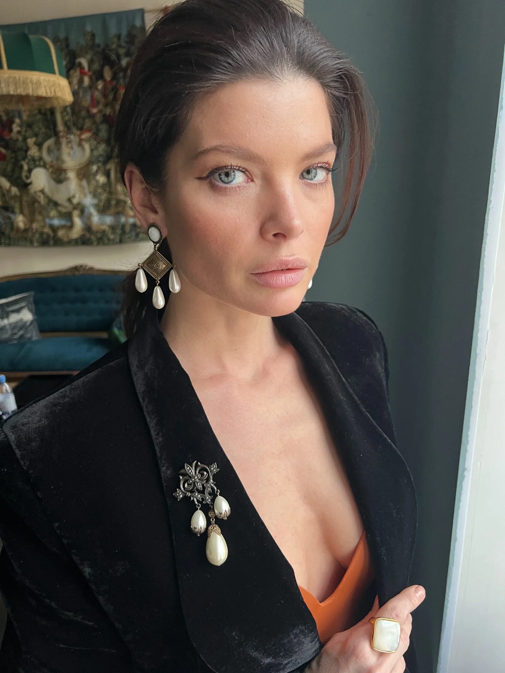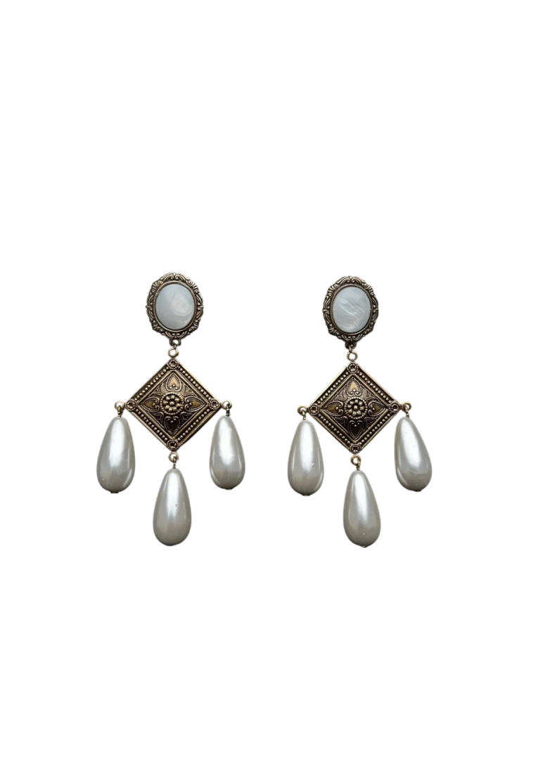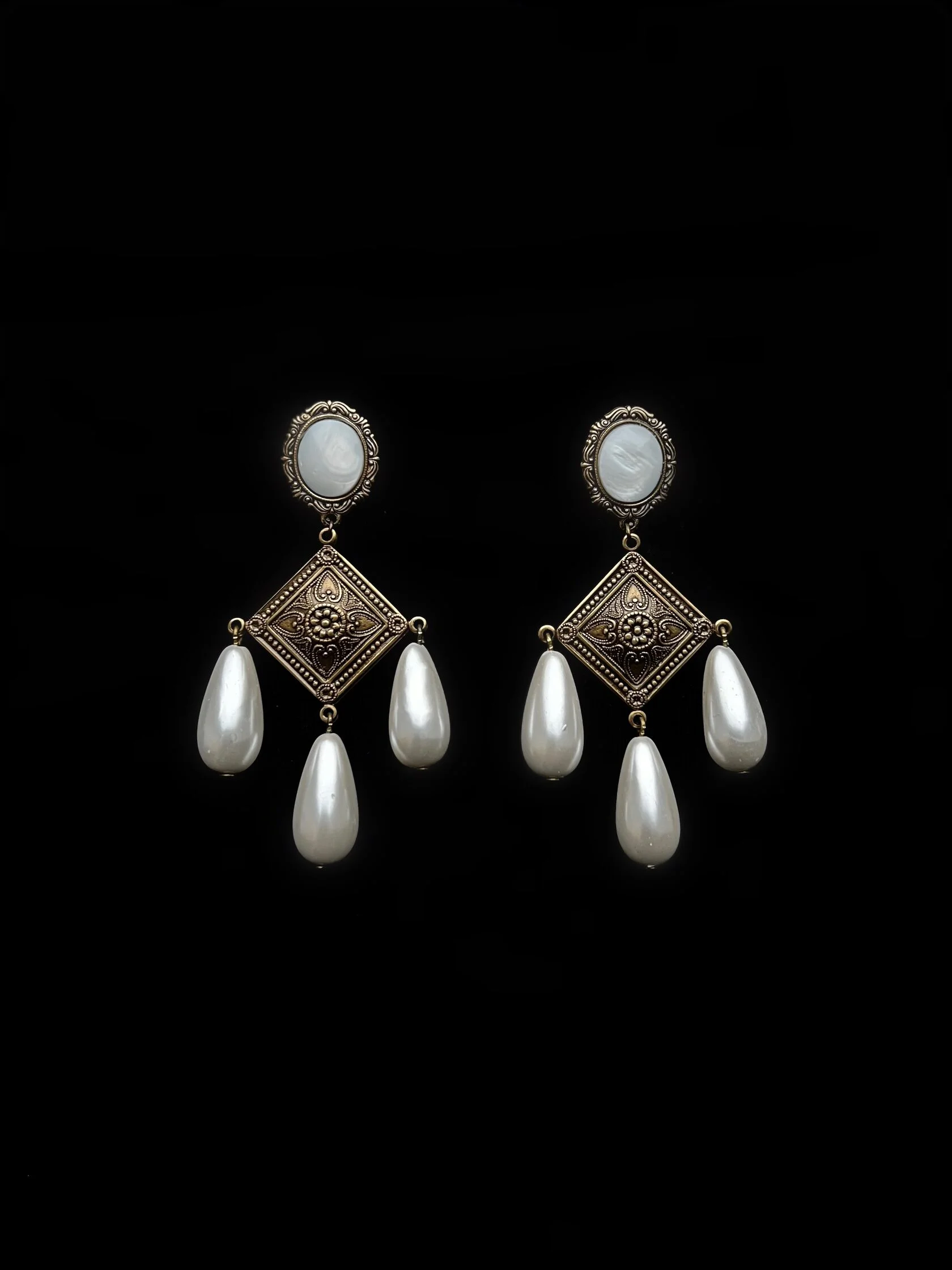Коктейльные серьги украшены кабошонами натурального перламутра и дополнены подвесками-каплями жемчуга майорка.