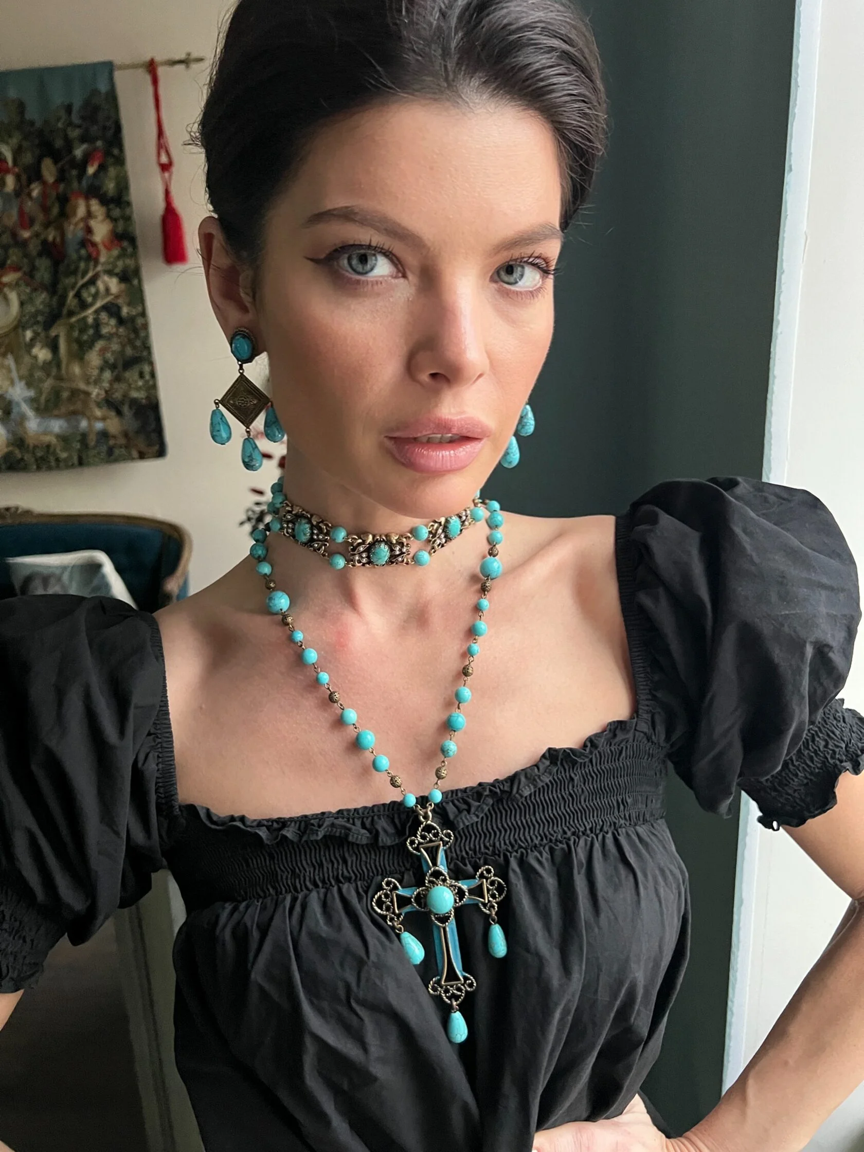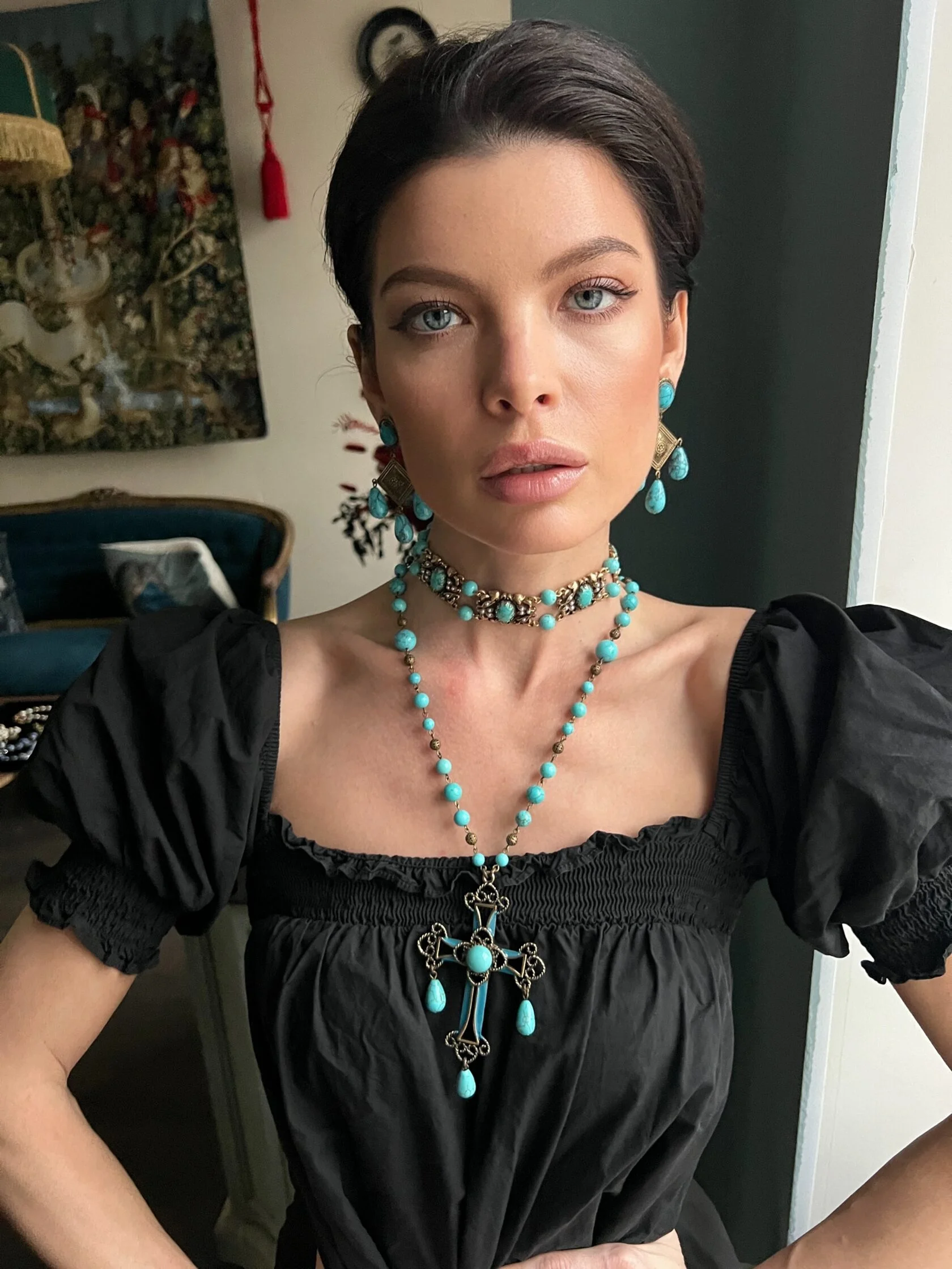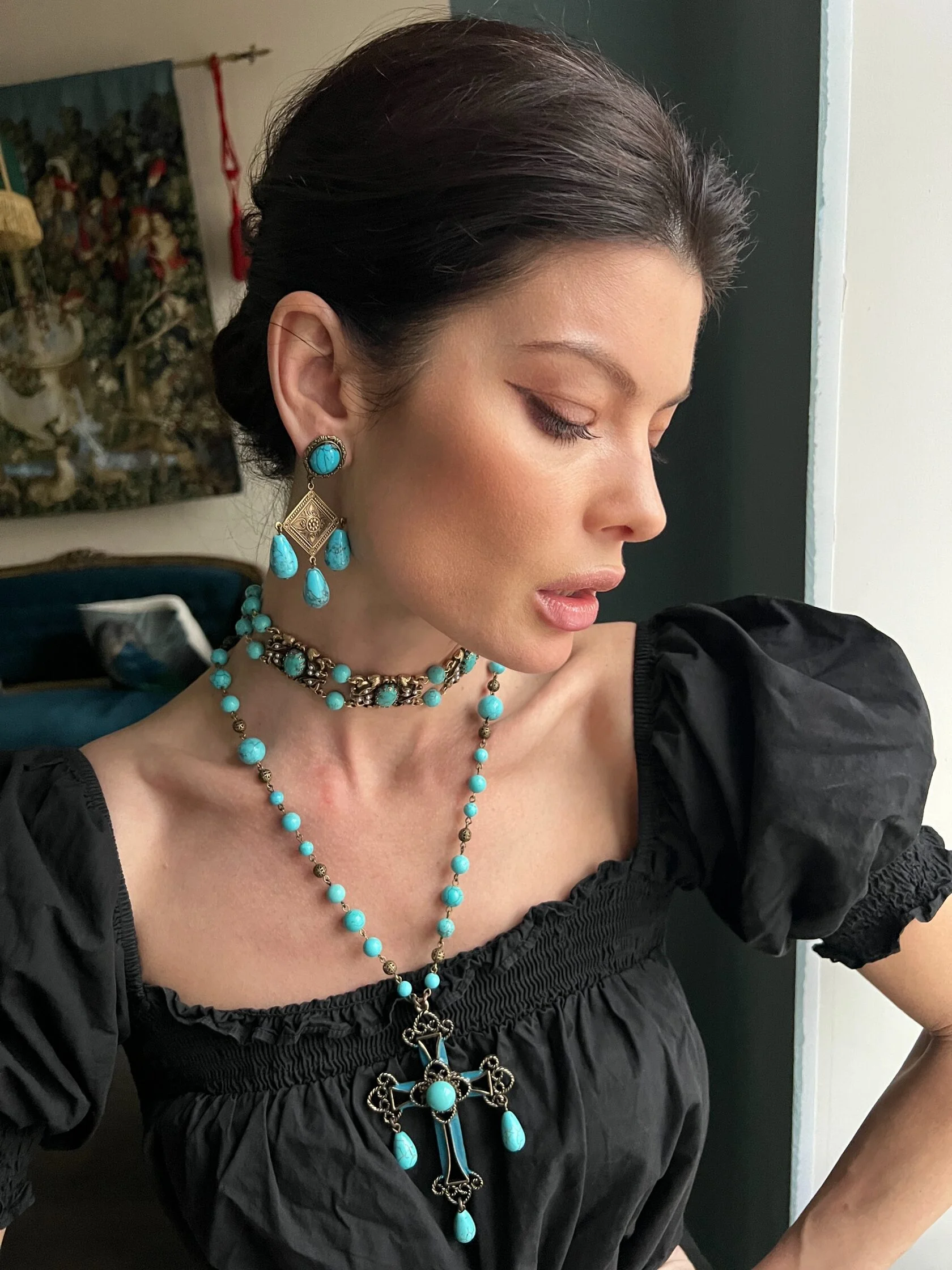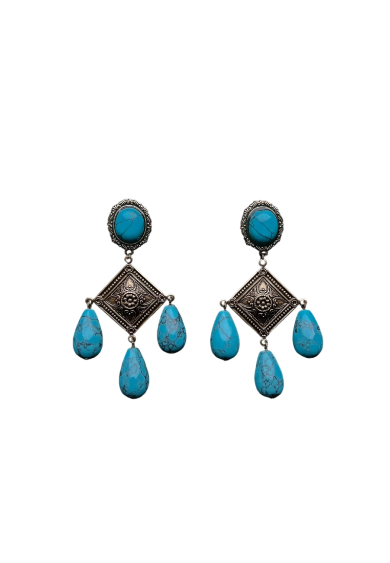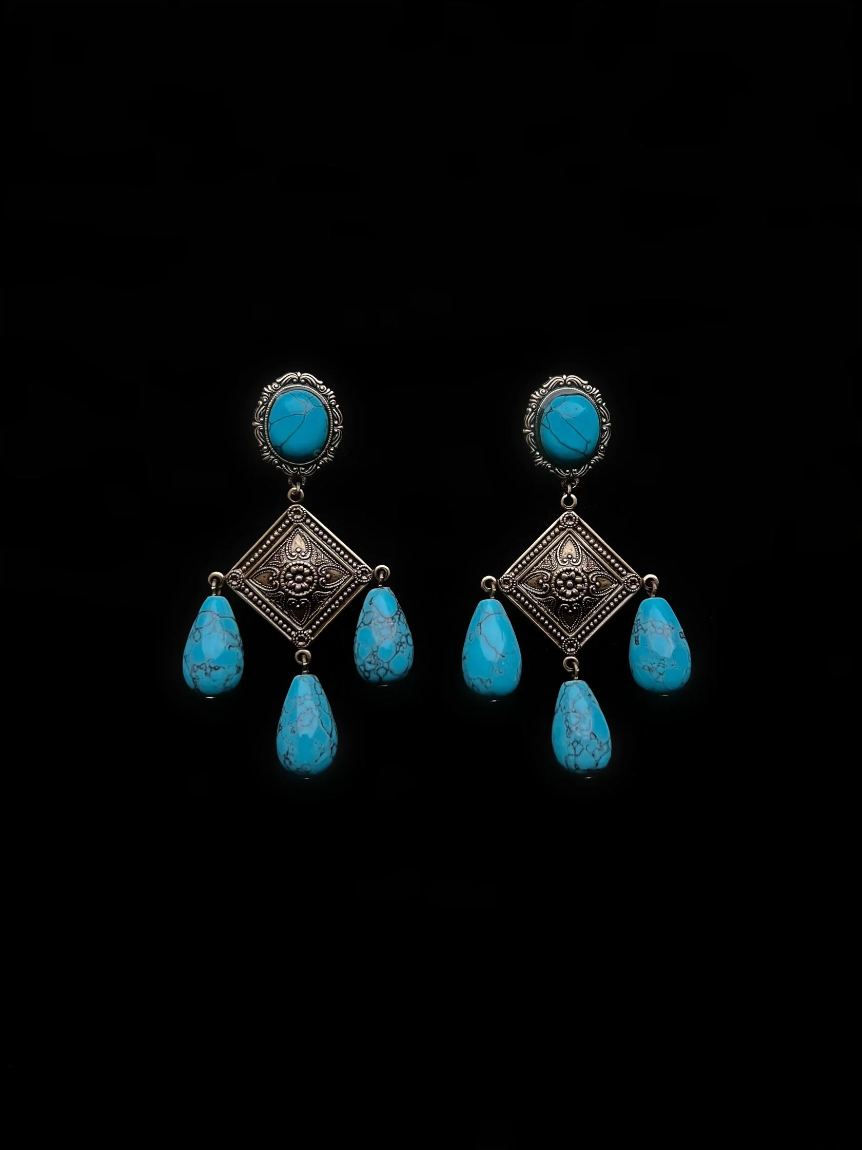 Коктейльные серьги украшены кабошонами и подвесками-каплями турквенита.