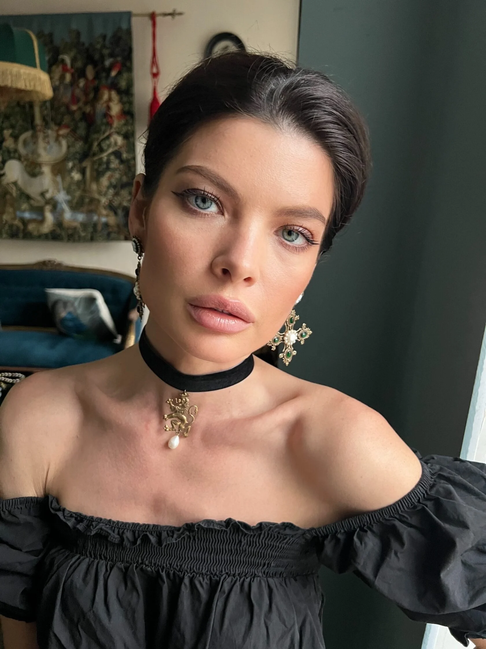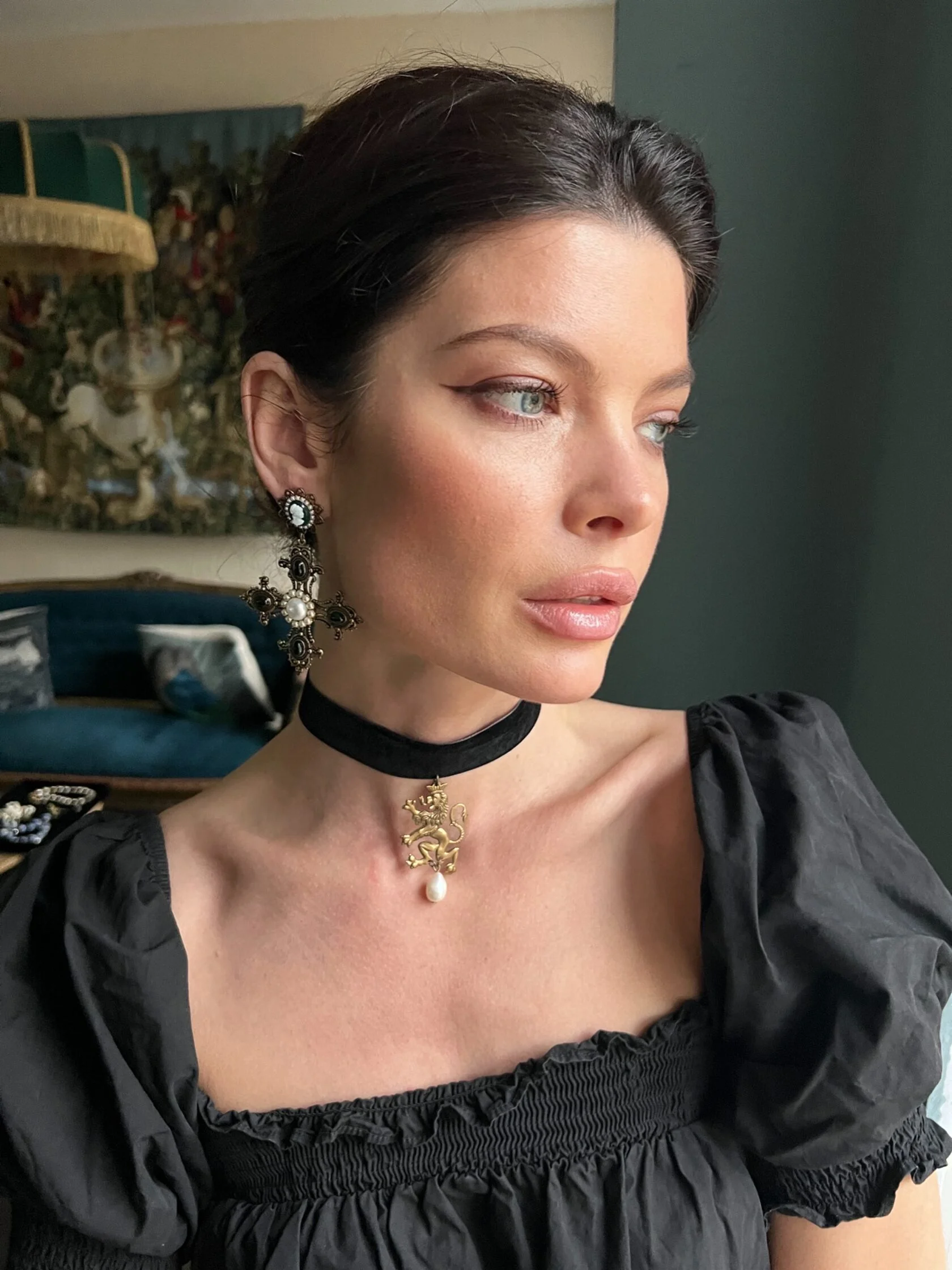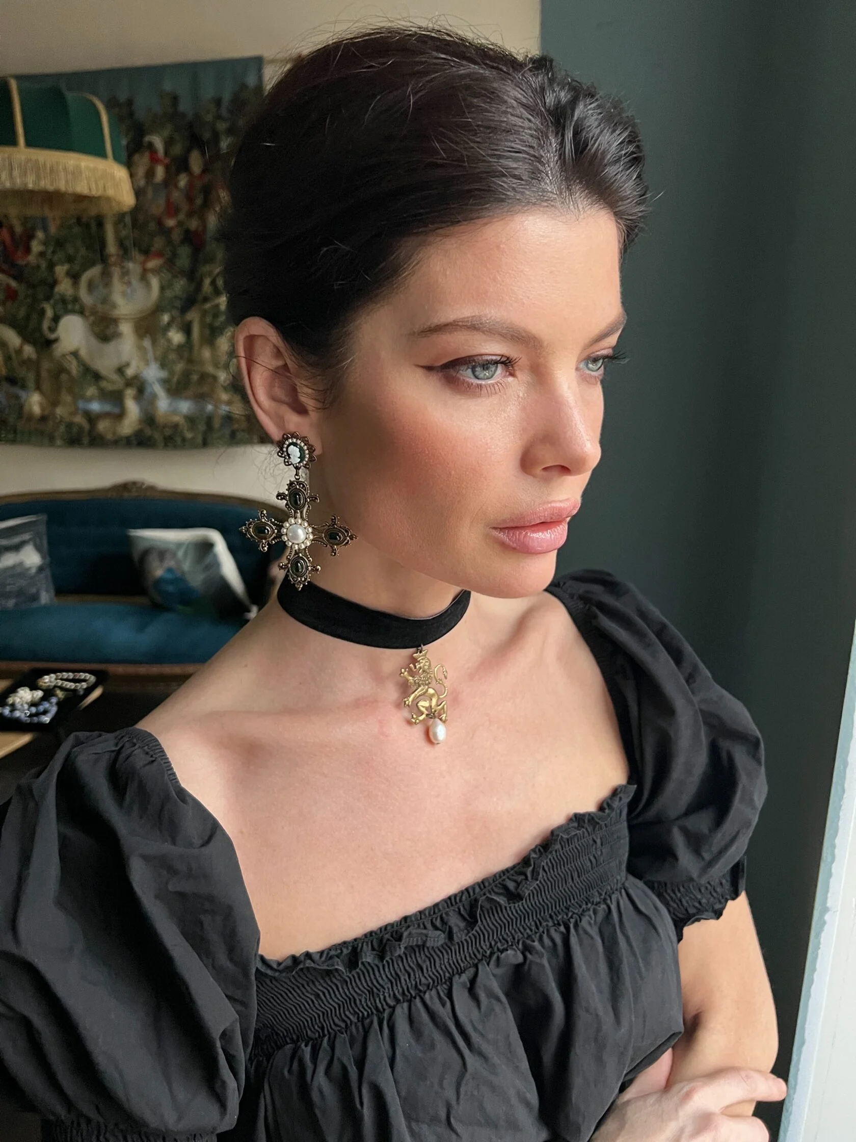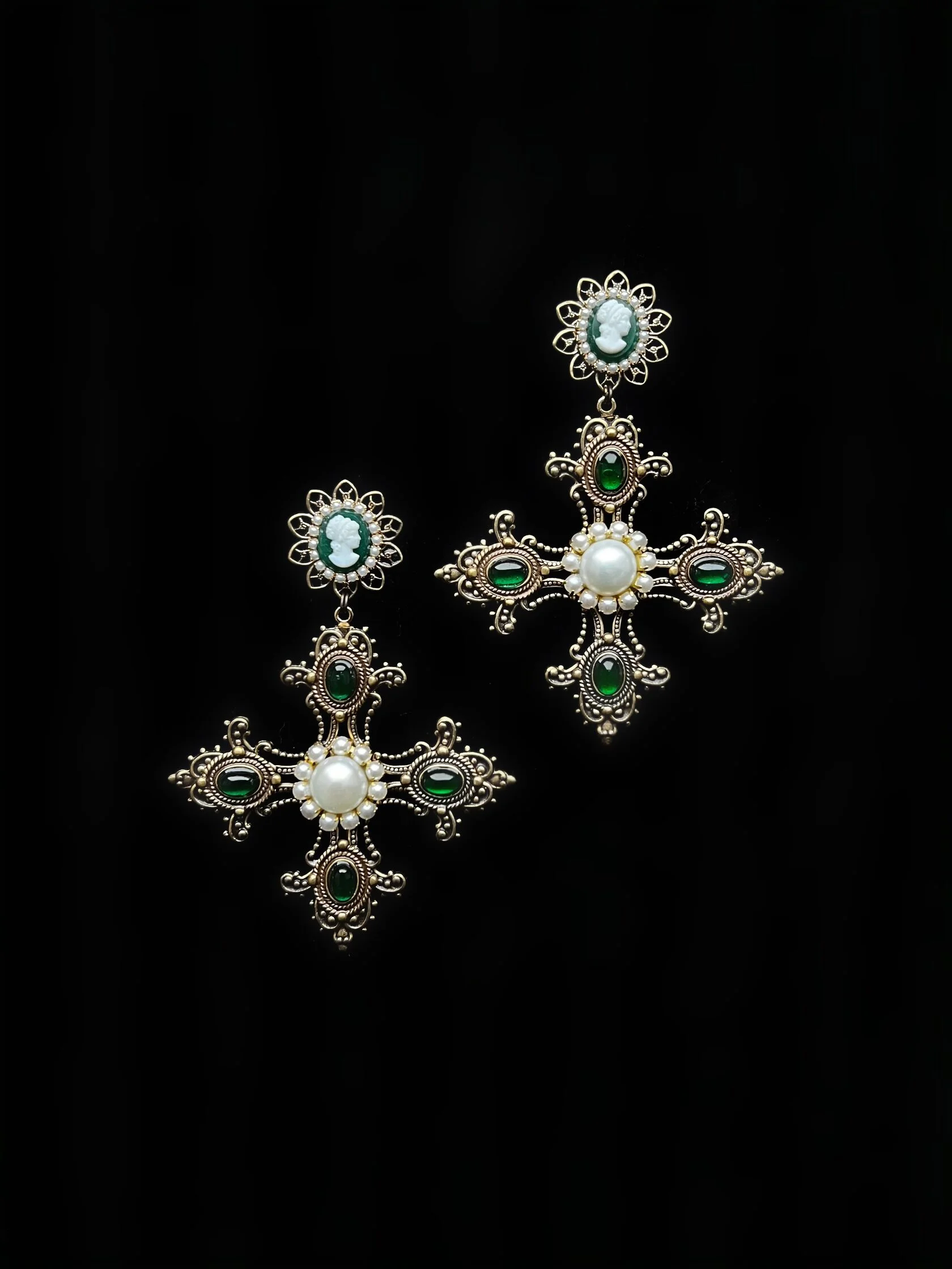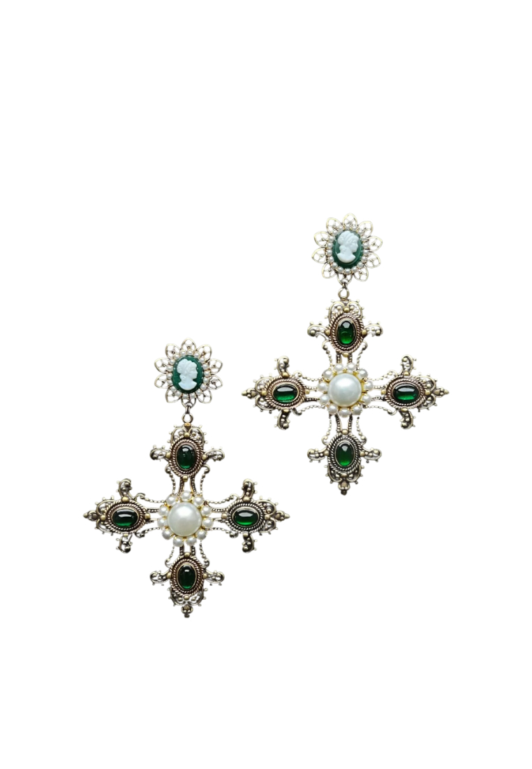Крупные (но легкие) барочные серьги в виде мальтийских крестов, богато украшены винтажными камеями (Яблонец, Чехия), цветными кабошонами декоративного стекла и натуральным жемчугом