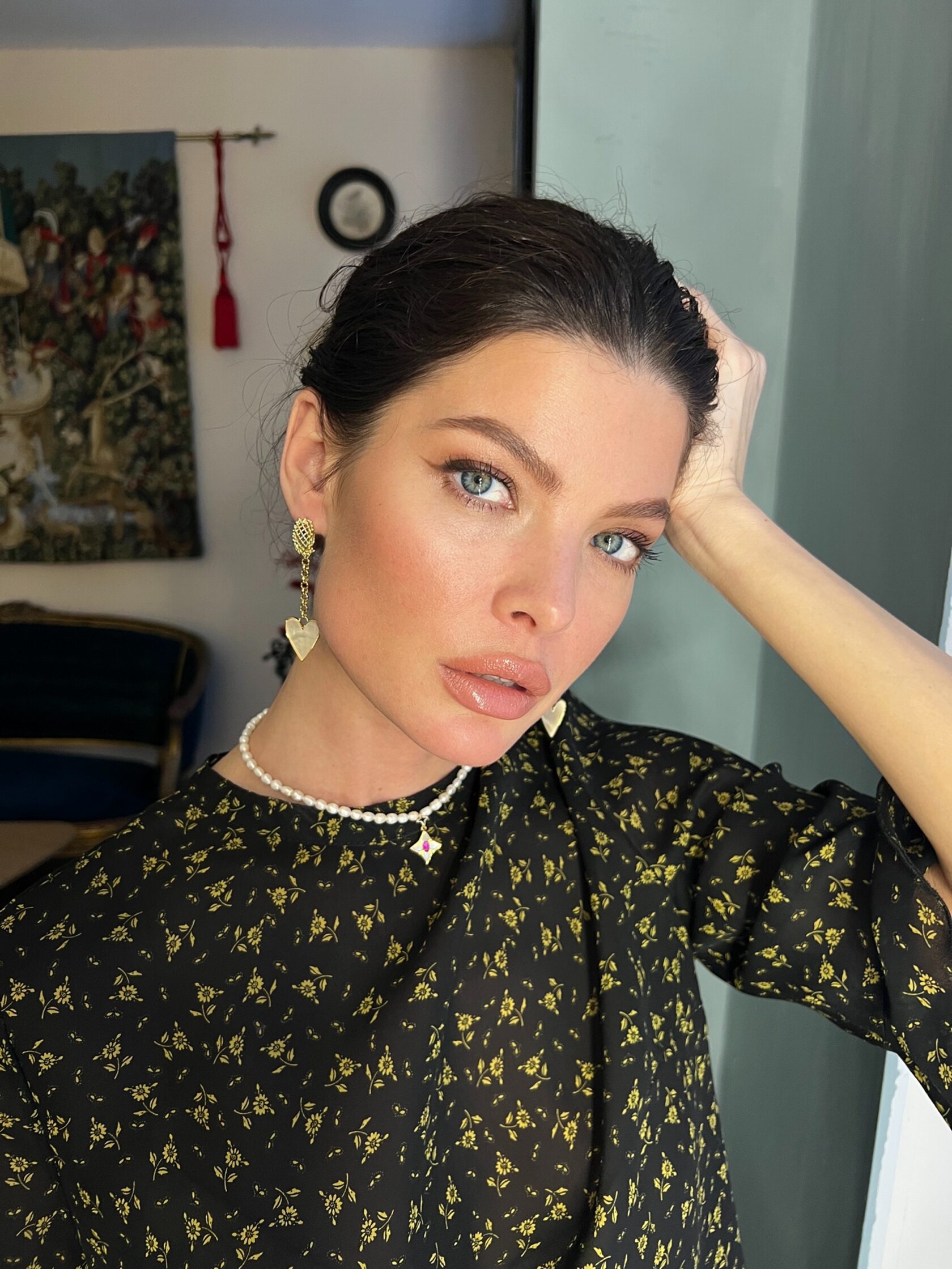 Изящные серьги украшены подвесками натурального перламутра в форме сердец на цепочках. Английский замок
