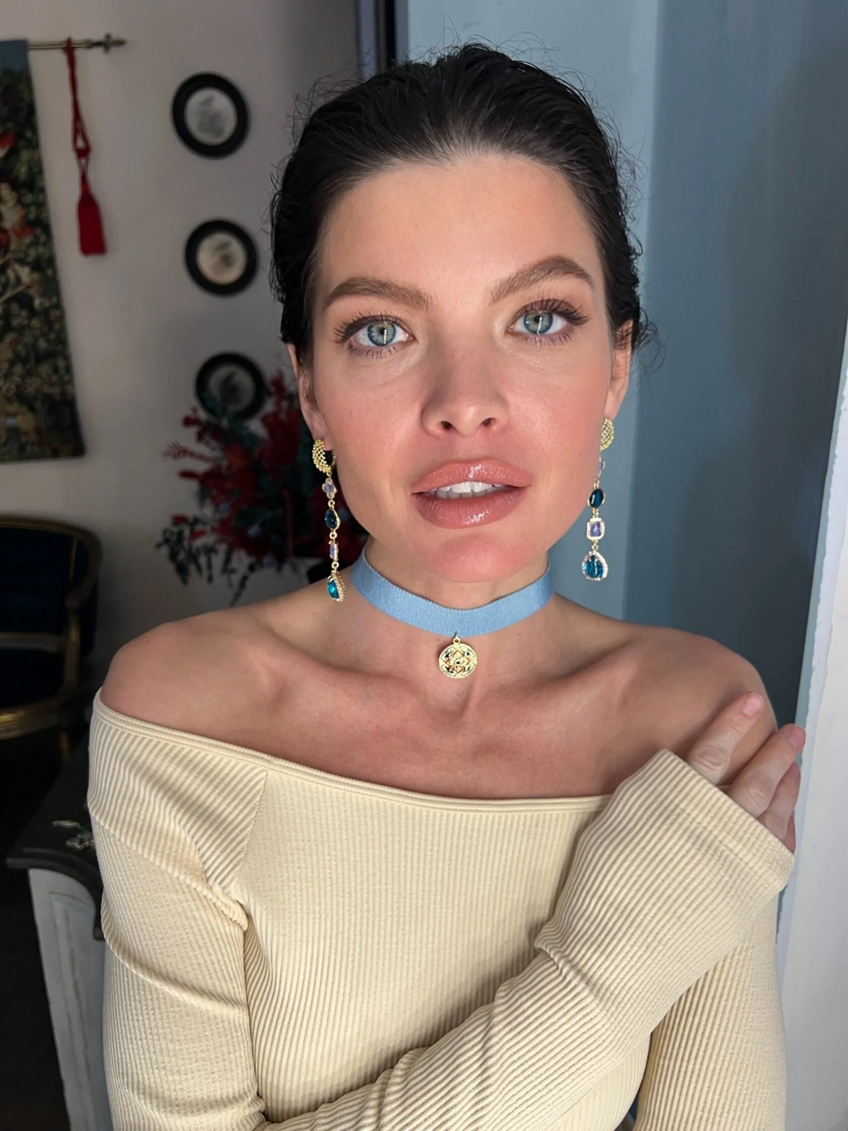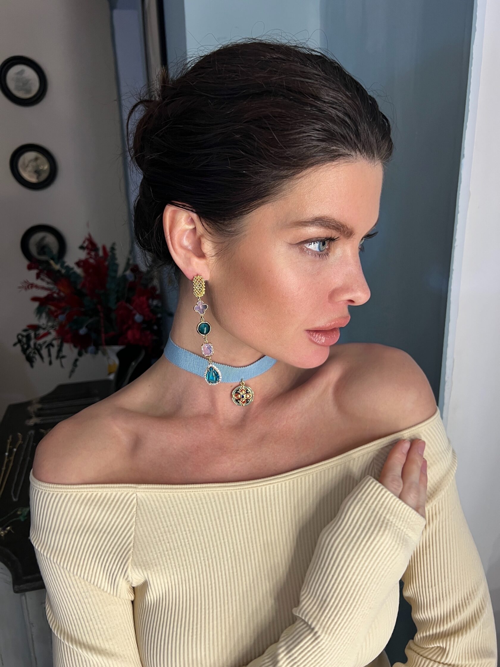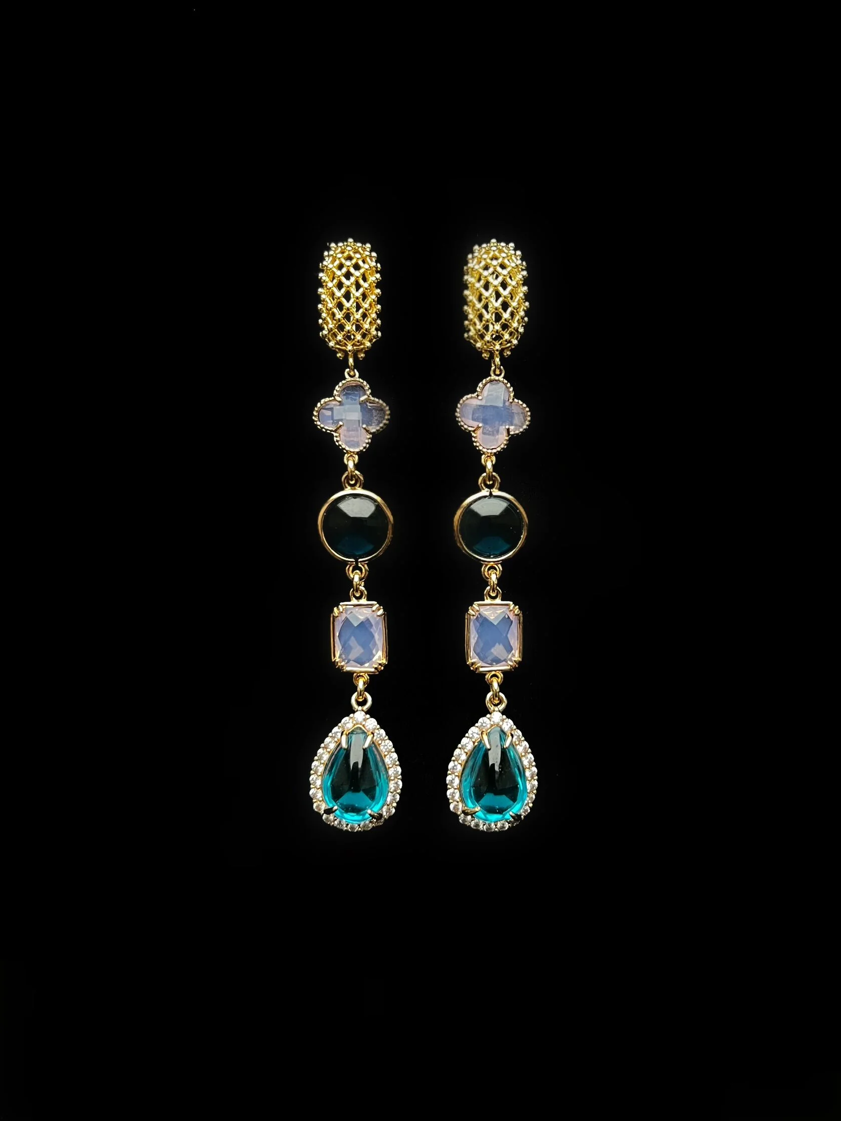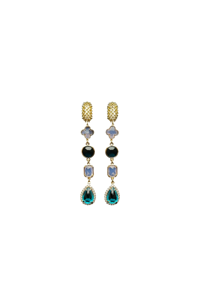 Коктейльные длинные серьги украшены различными декоративными вставками с цветным ювелирным стеклом. Английский замок