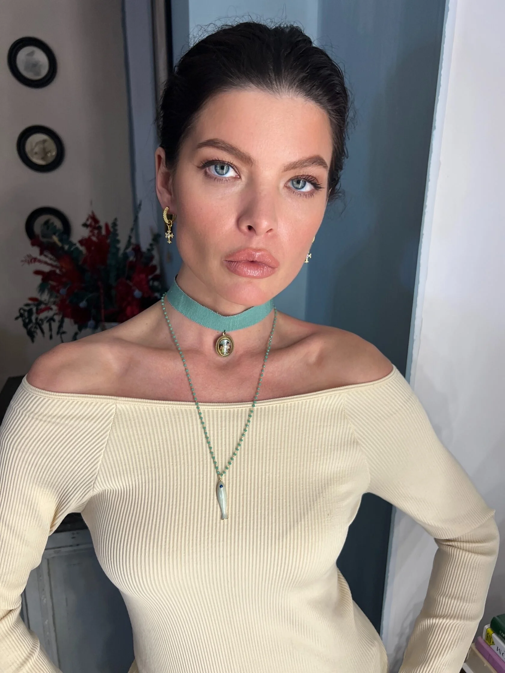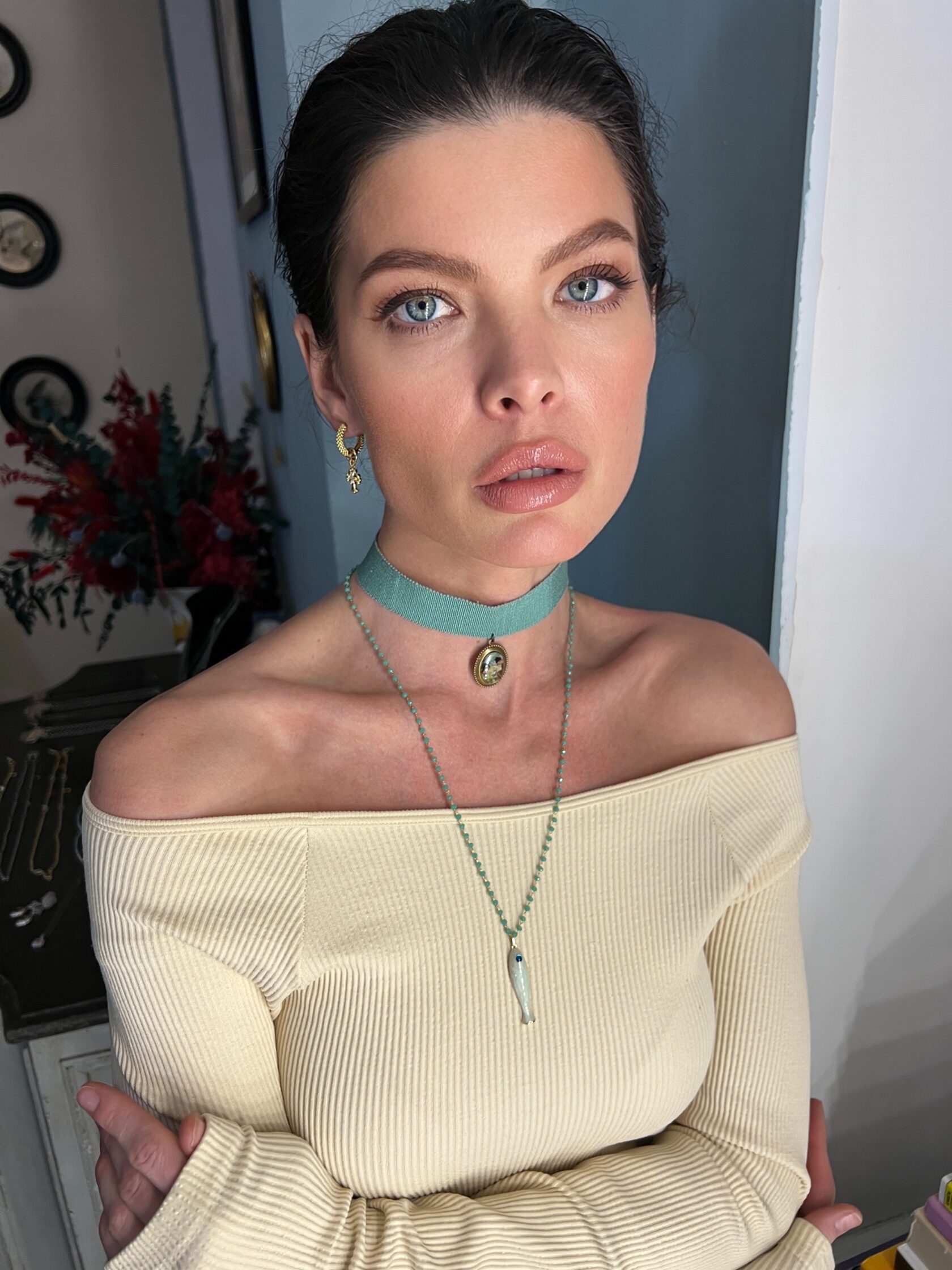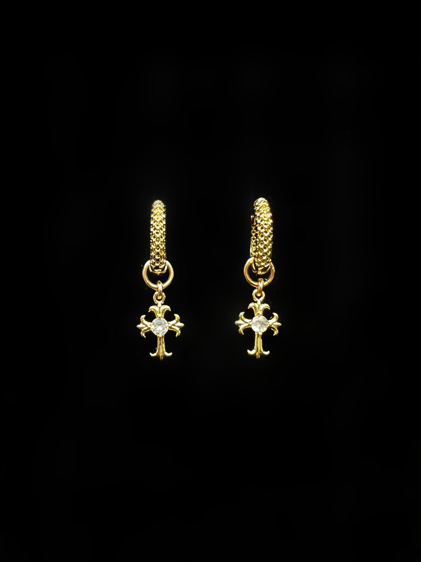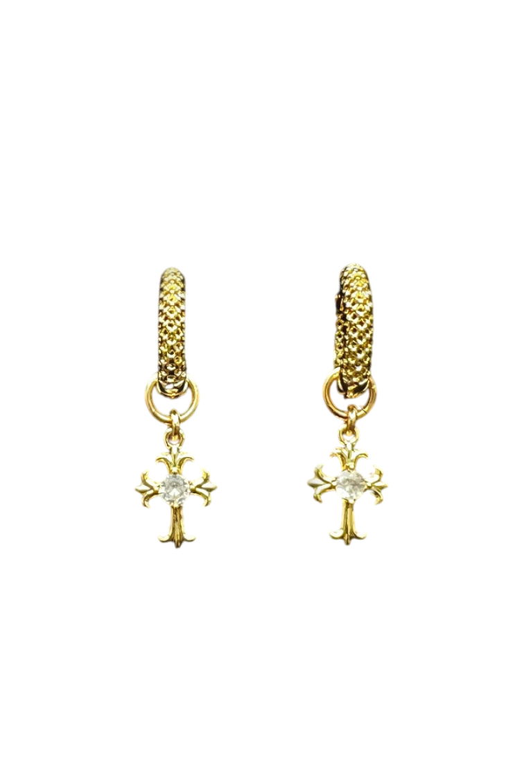 Миниатюрные серьги-кольца украшены съемными подвесками с готическими крестами. Замок-кликстер