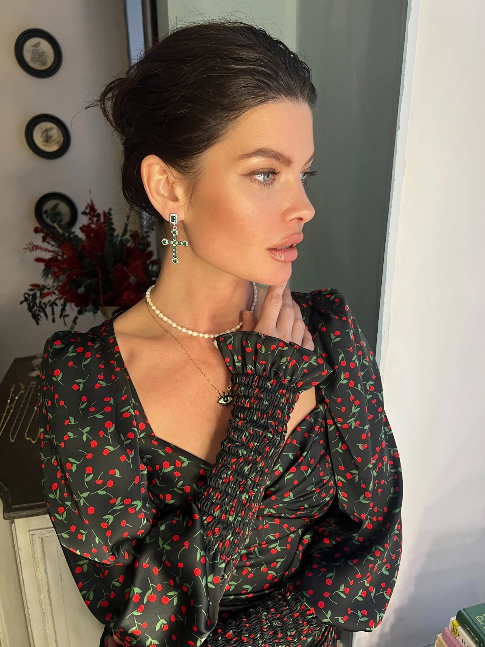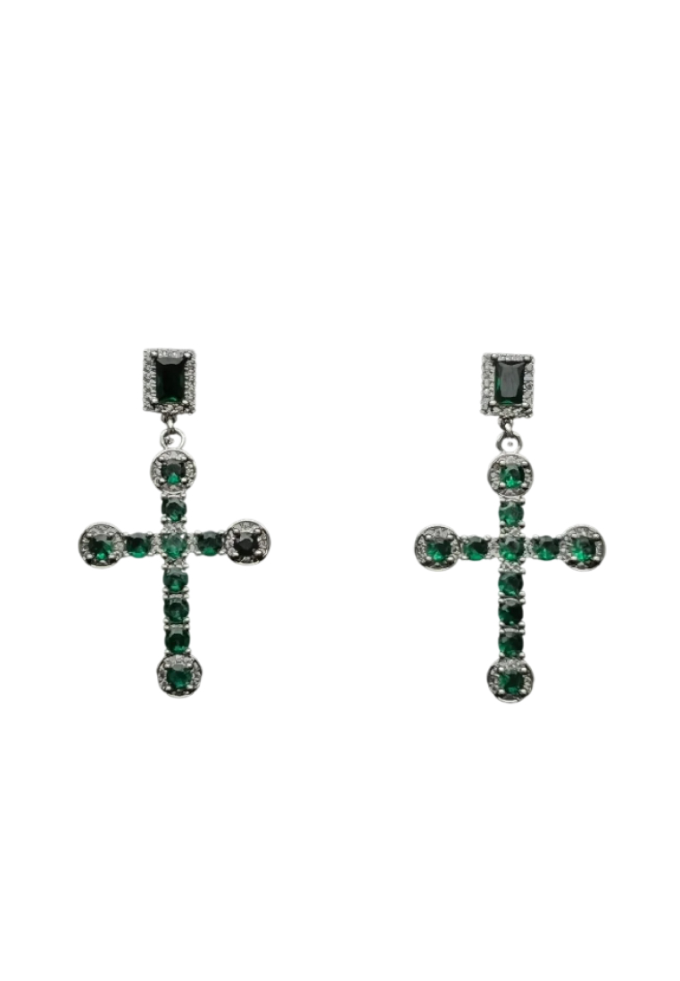 Коктейльные серьги украшены подвесками барочных крестов с кристаллами декоративного стекла изумрудных оттенков. Замки-гвоздики
