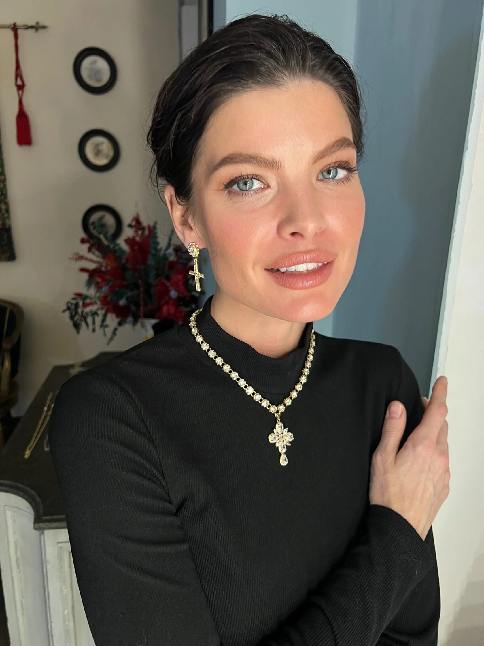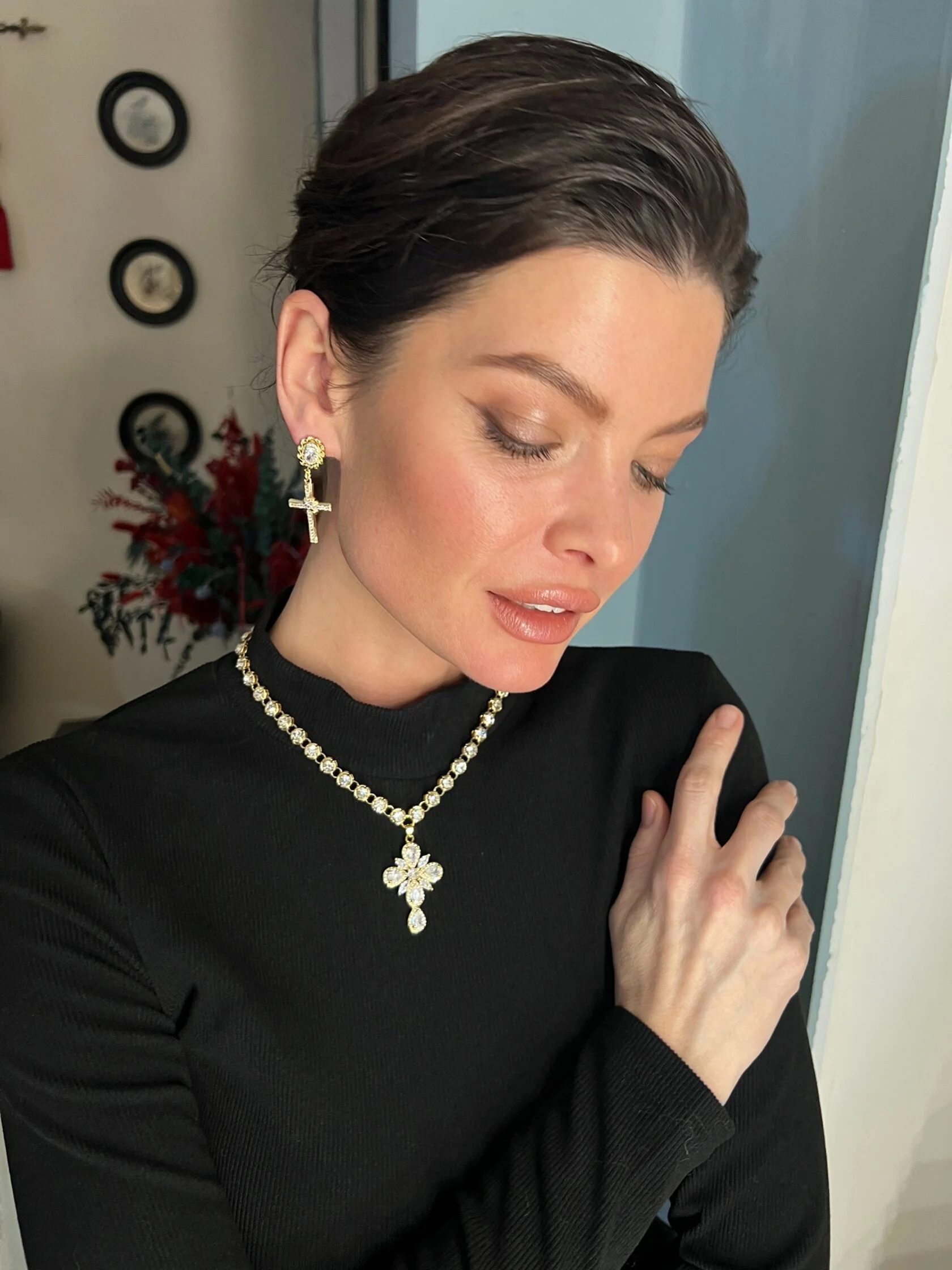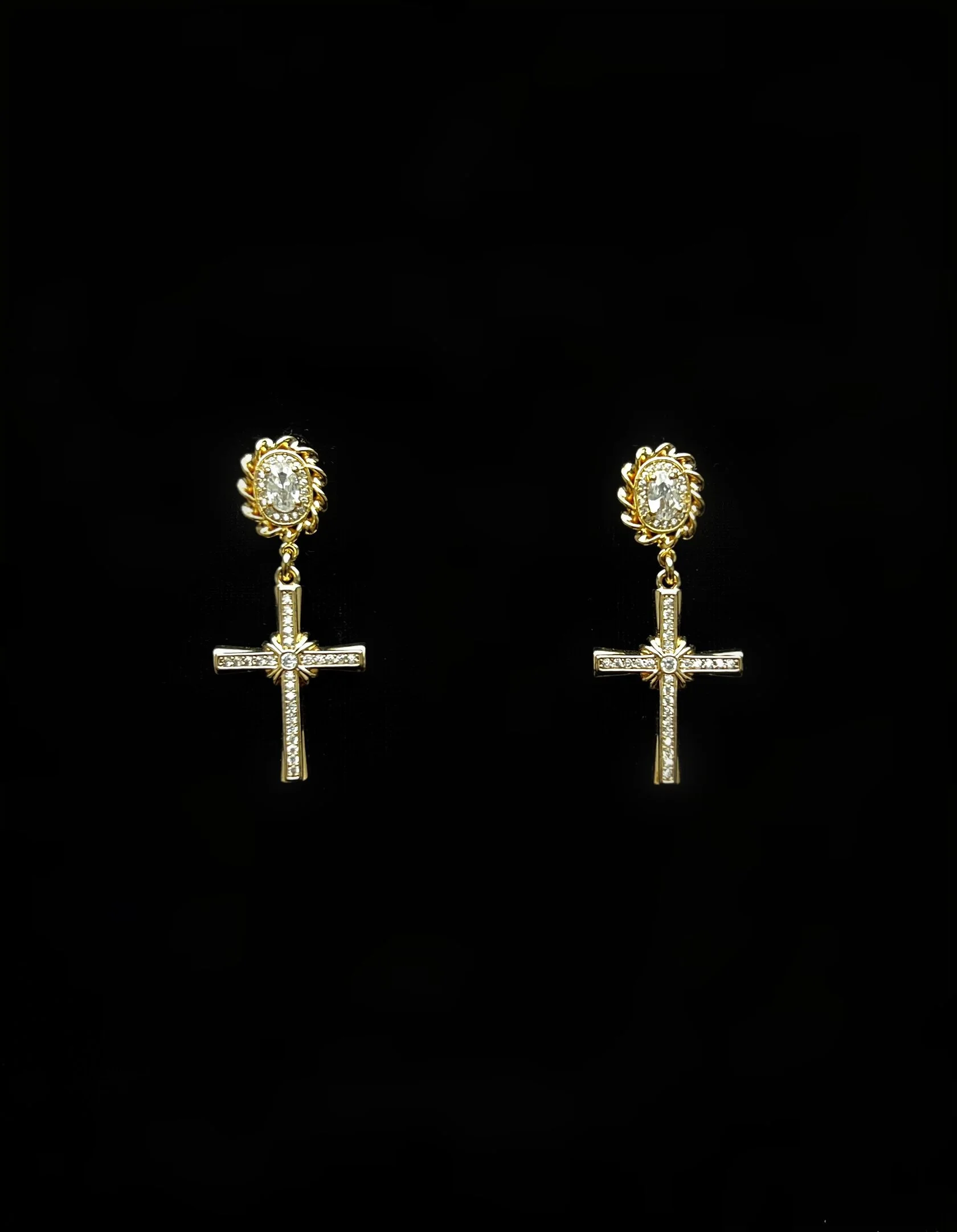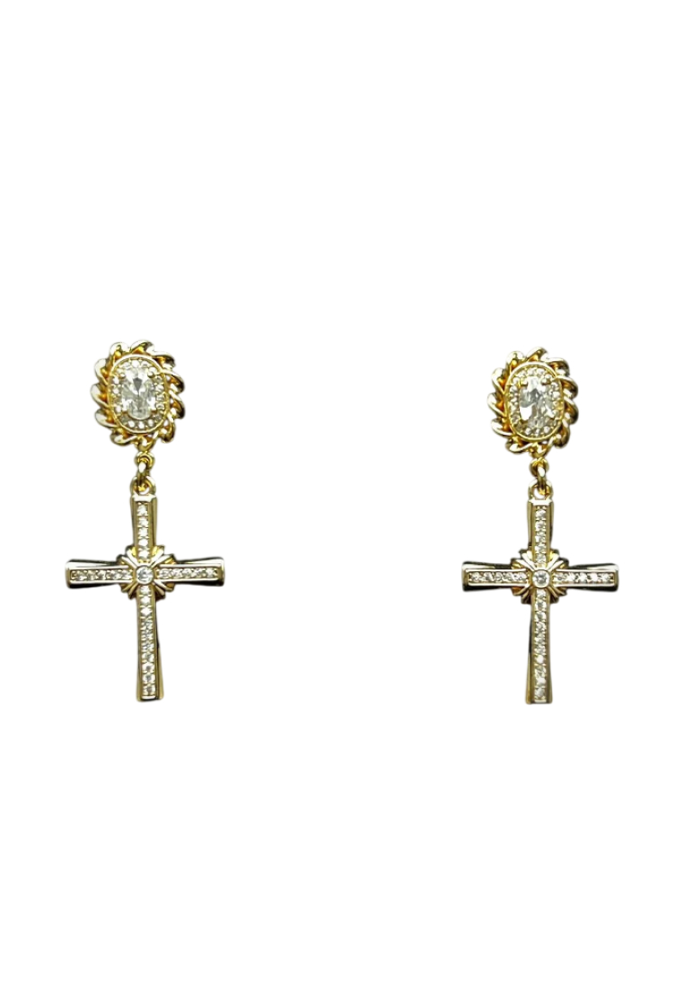 Изящные серьги украшены кристаллами «Swarovski» и дополнены подвесками декоративных крестов инкрустрированных мелкими цирконами. Замки-гвоздики