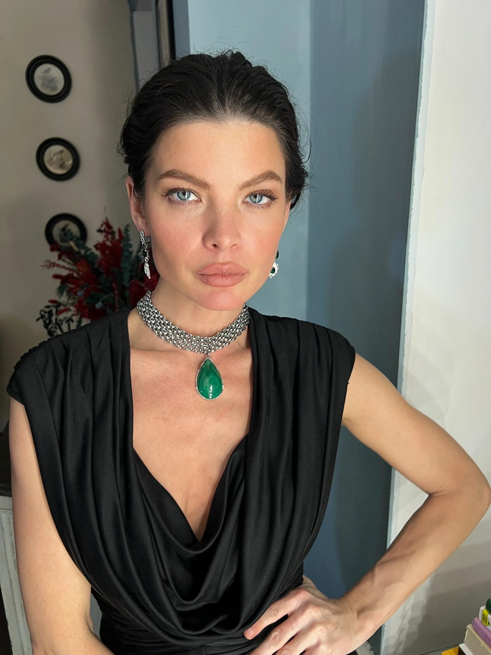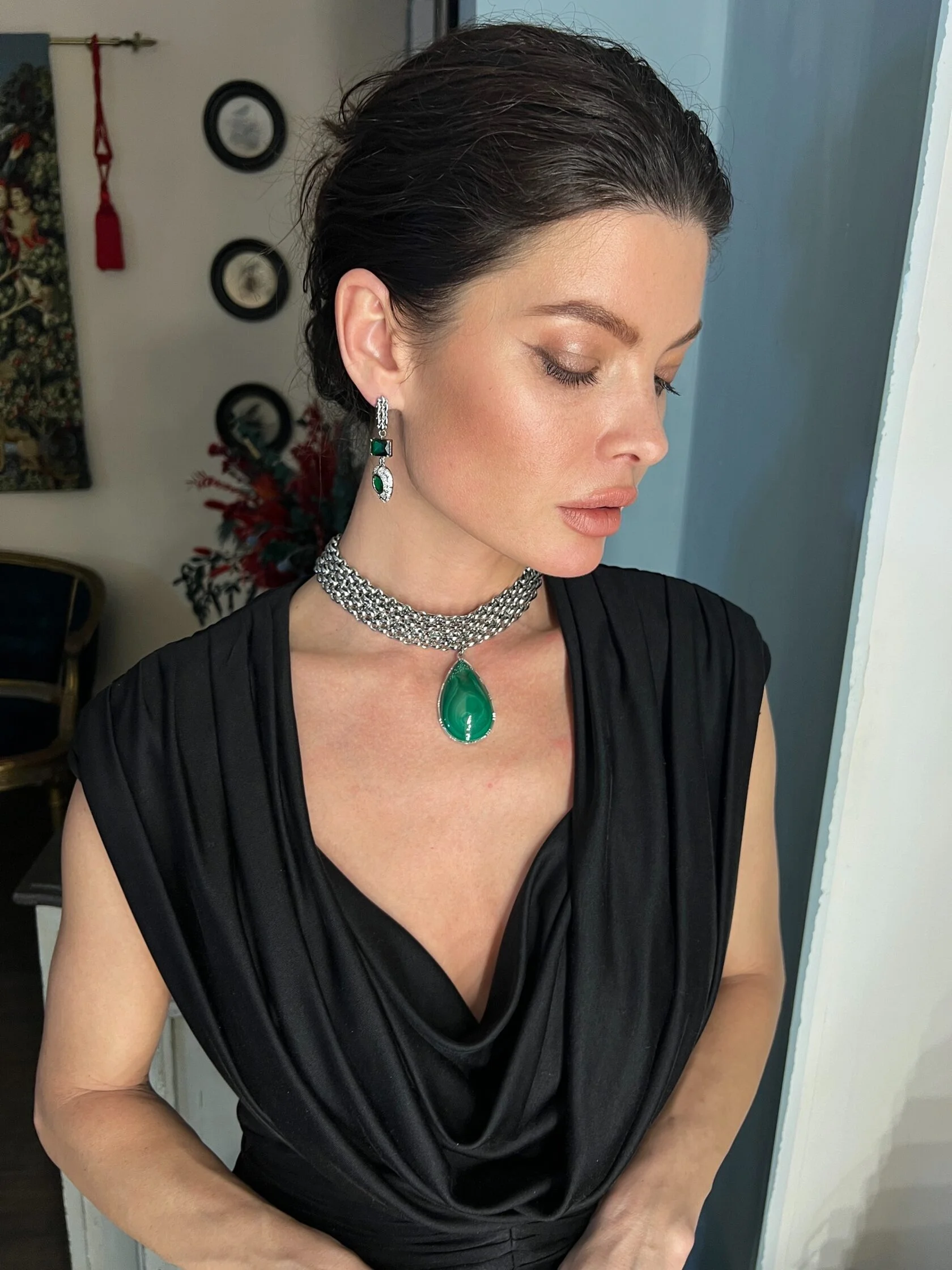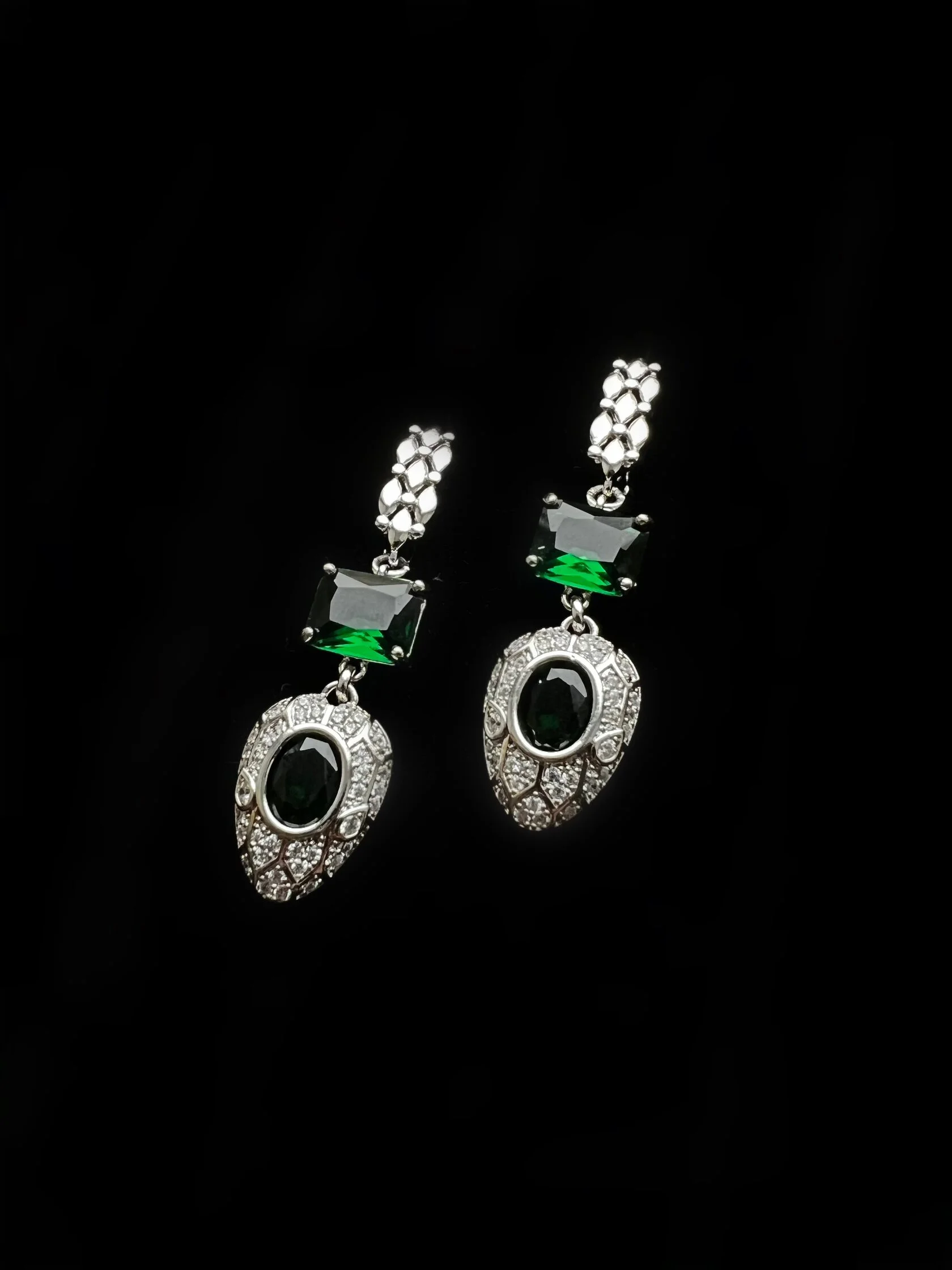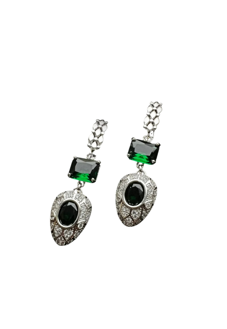 Коктейльные серьги украшены декоративными вставками с ювелирным стеклом и дополнены подвесками в виде голов змей с кристаллами «Swarovski». Английский замок