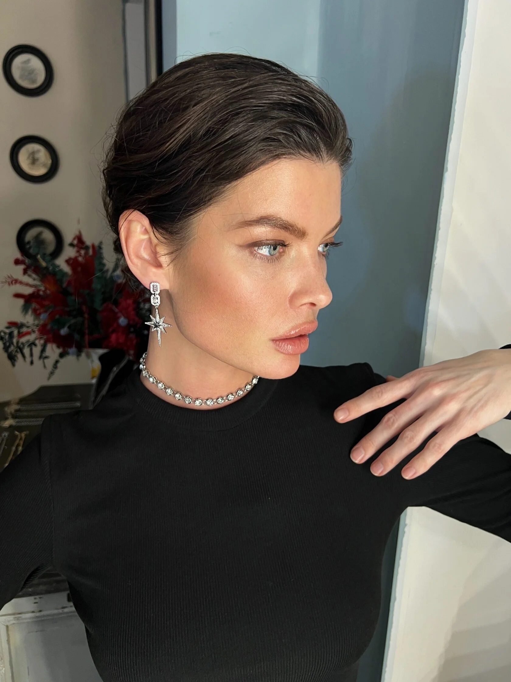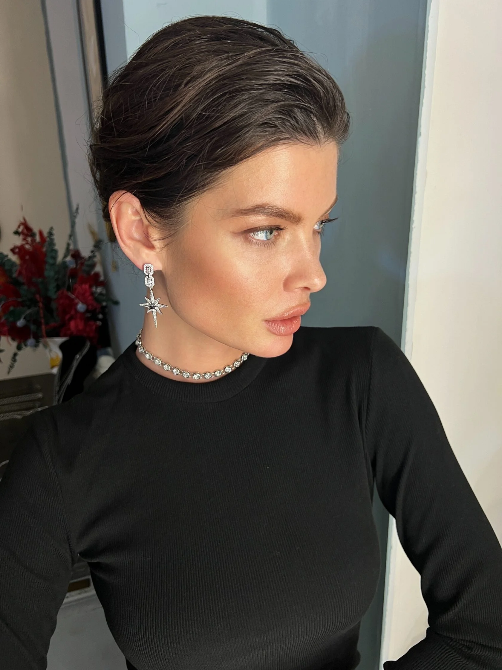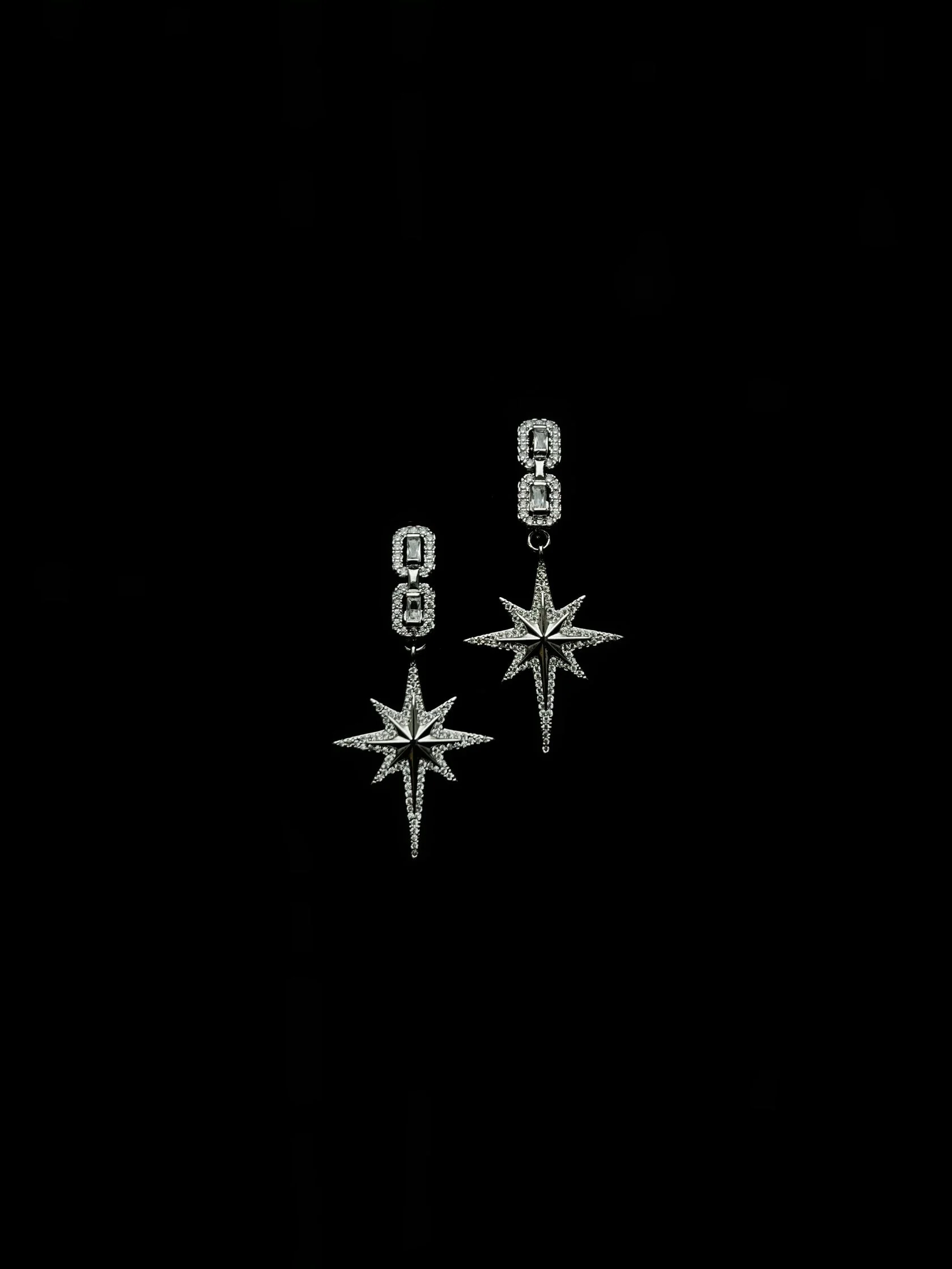 Акцентные серьги украшены крупными подвесками «Путеводные звезды», которые инкрустированы мелкими фианитами. Английский замок