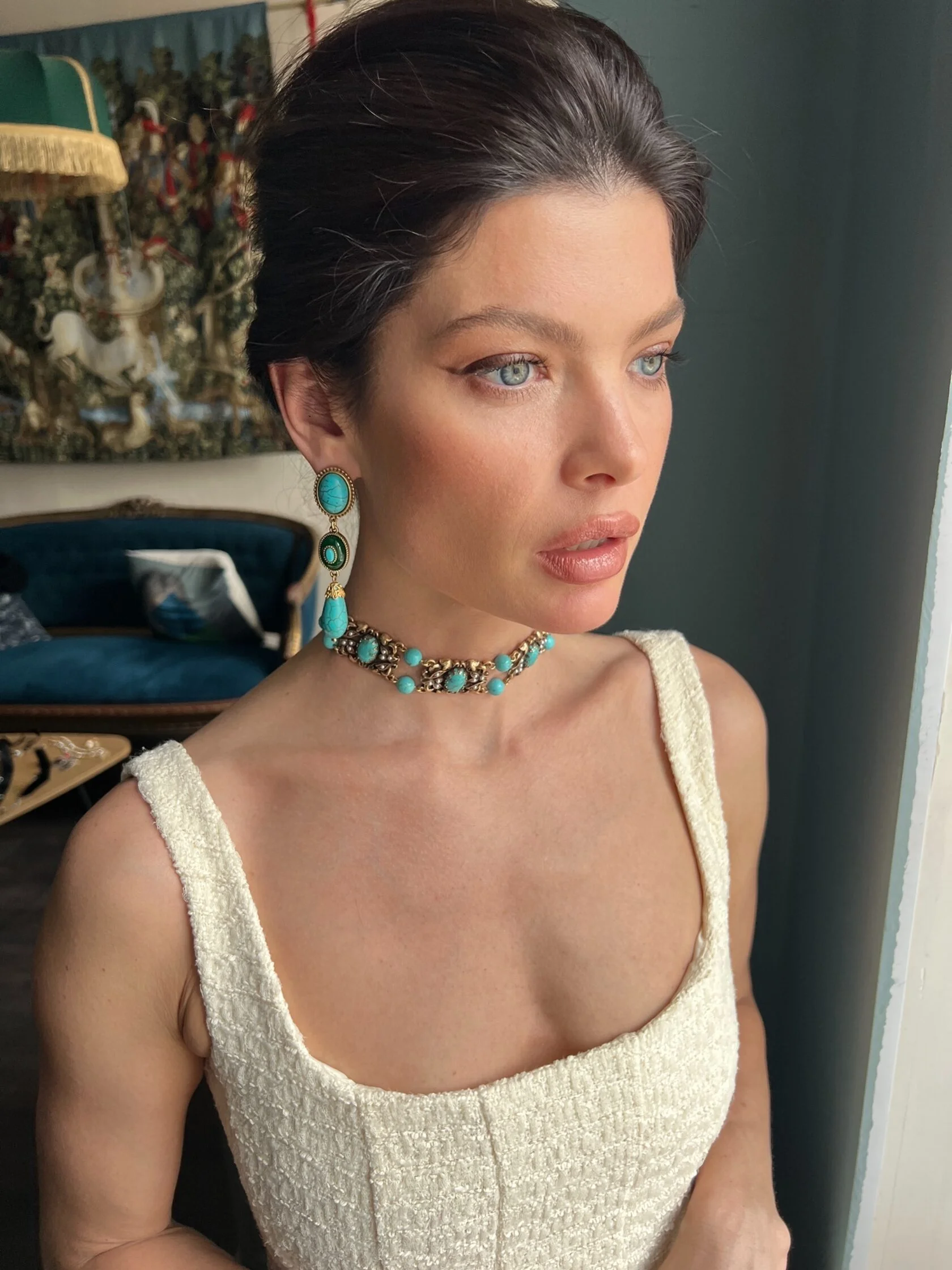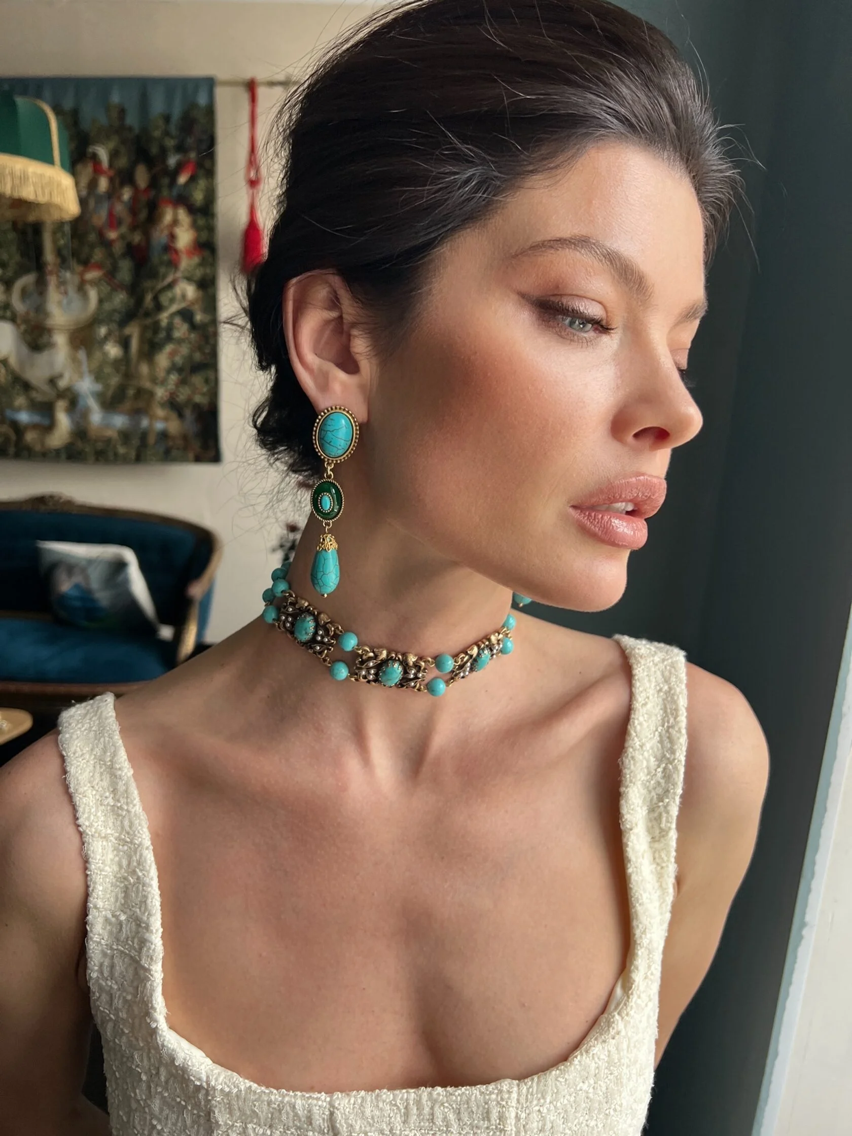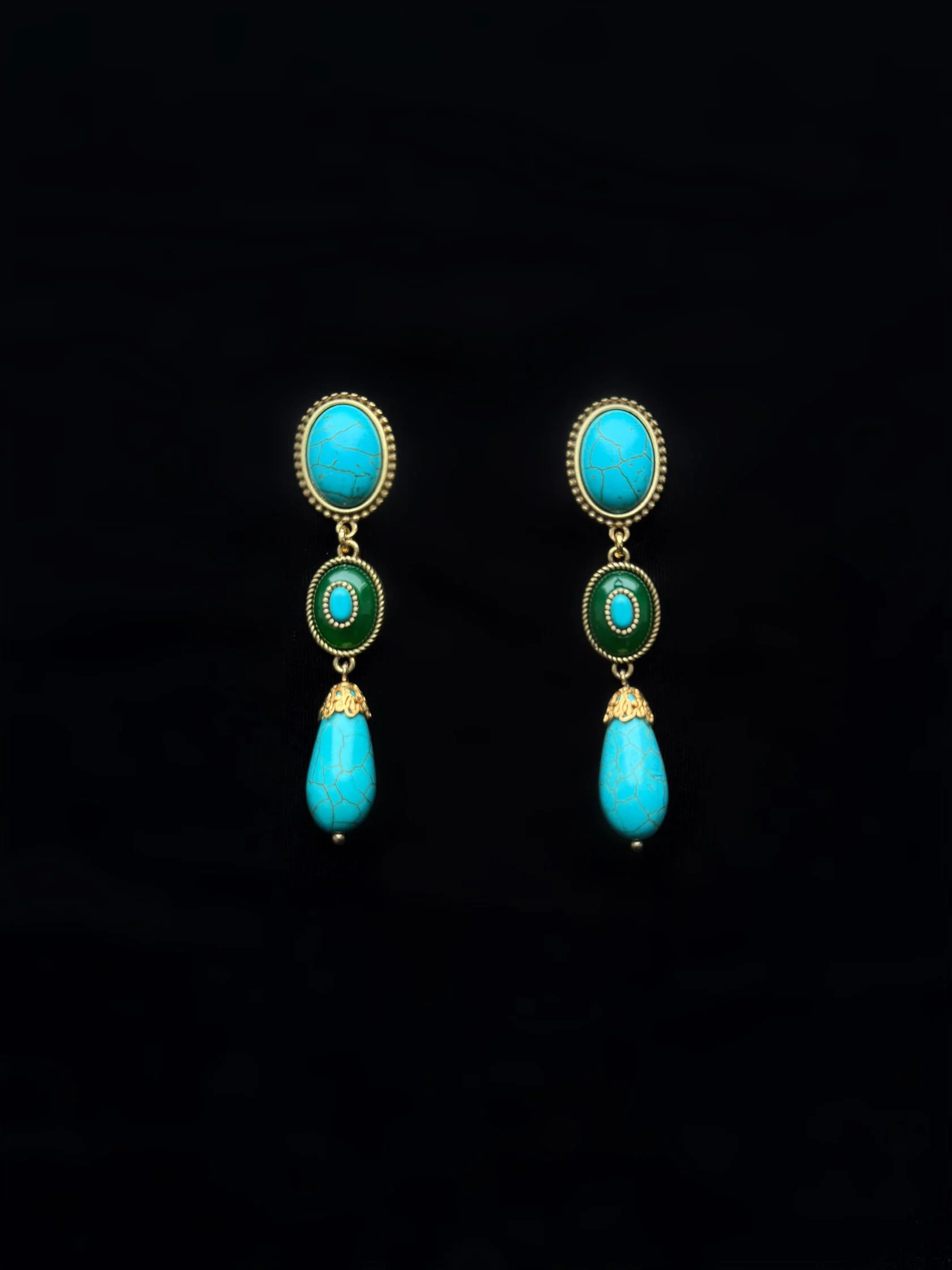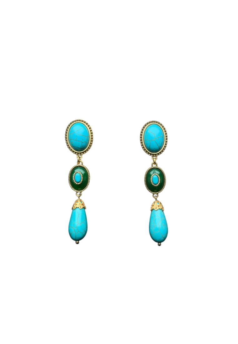 Акцентные серьги выполнены в стиле «Эпохи Возрождения», украшены кабошонами турквенита, вставками винтажного стекла и подвесок говлита.