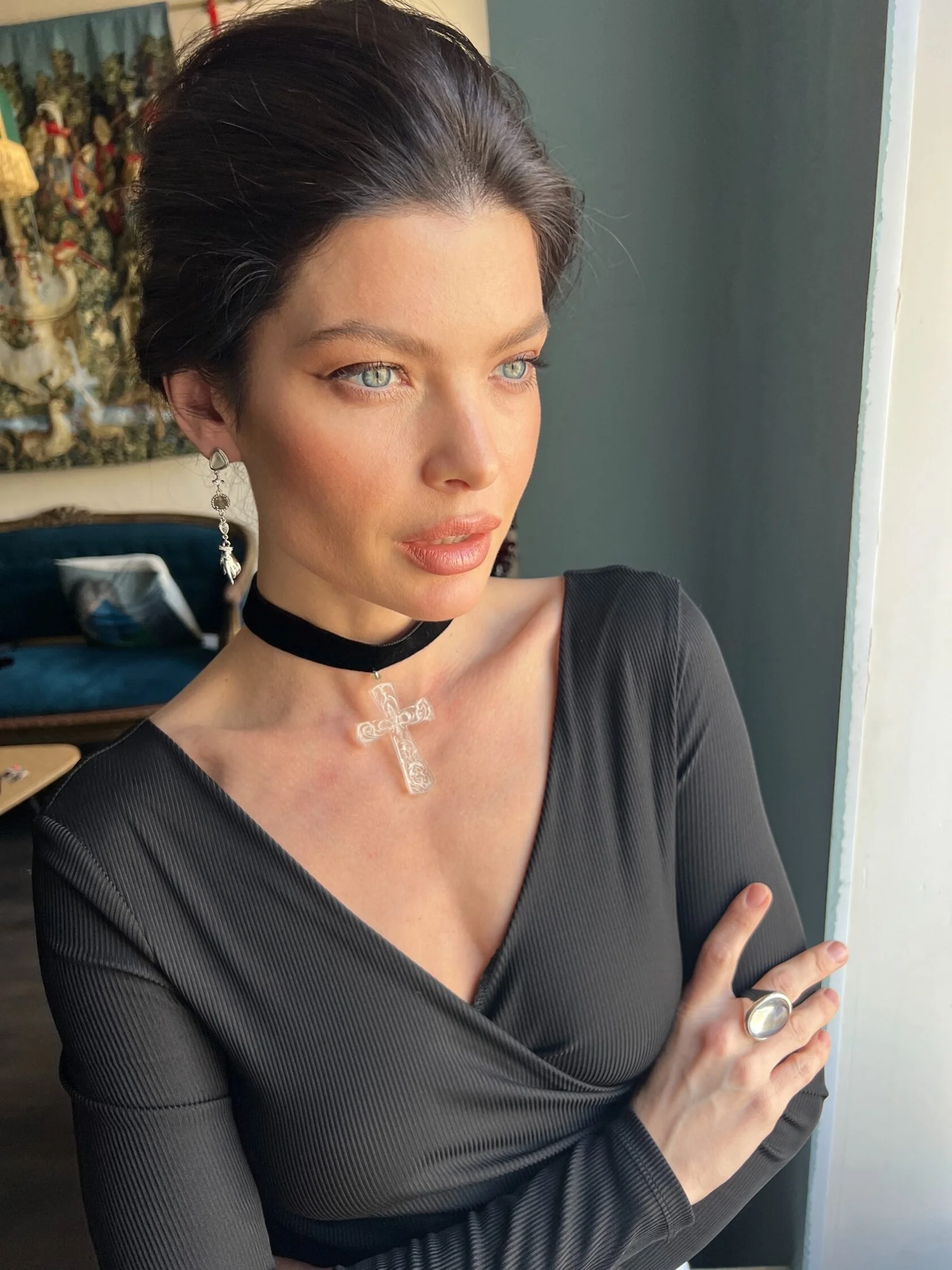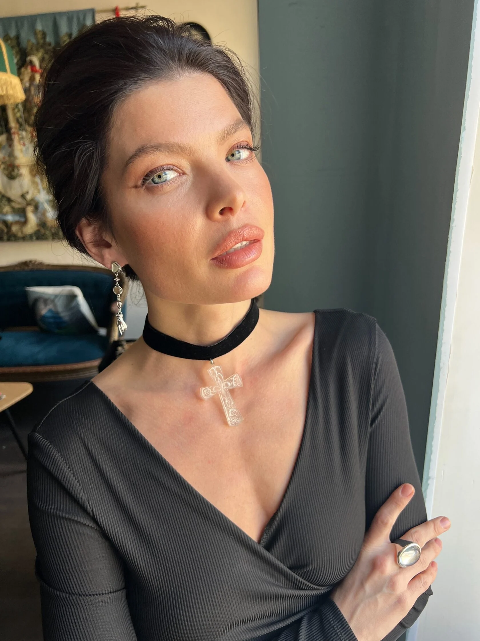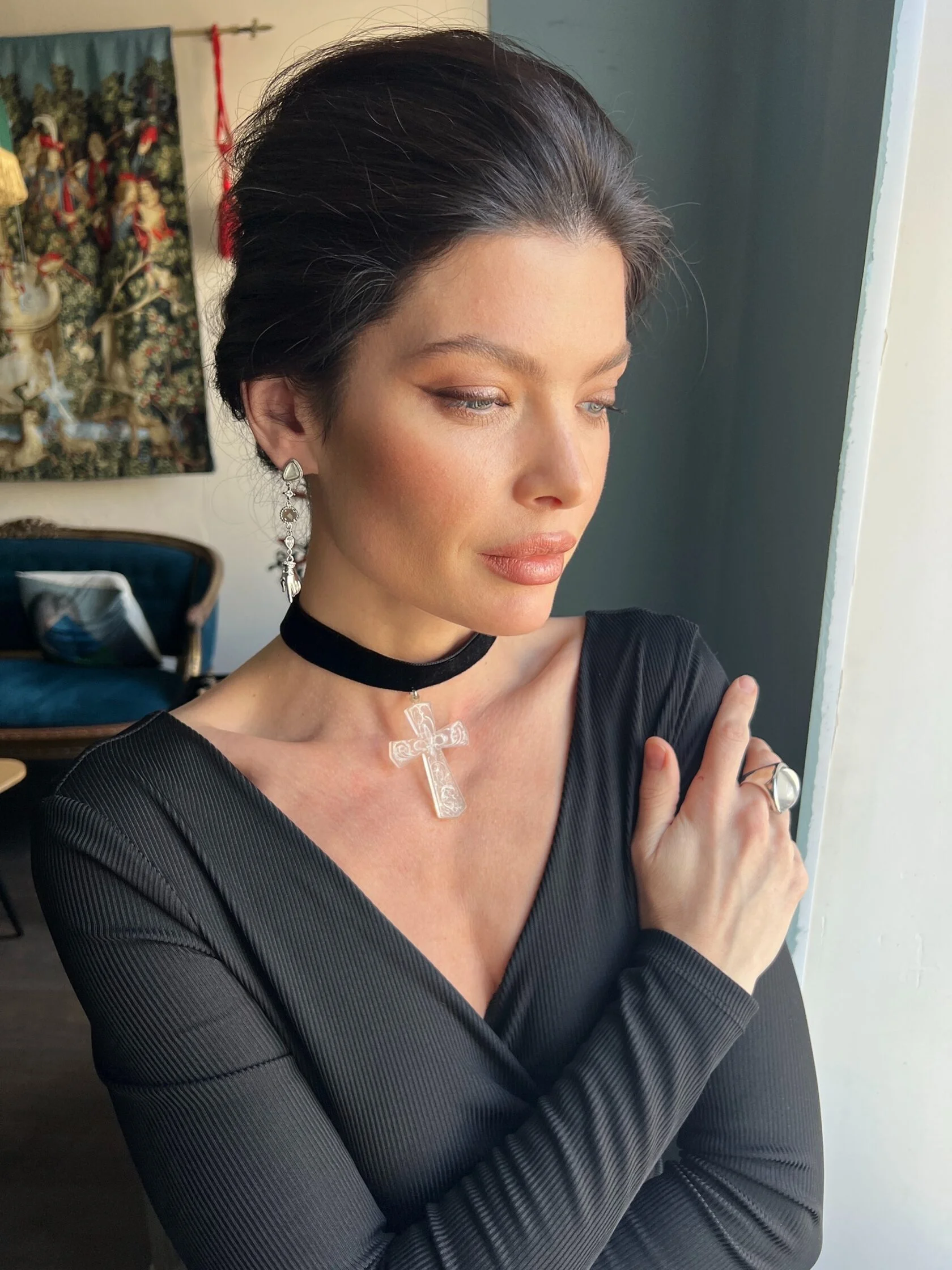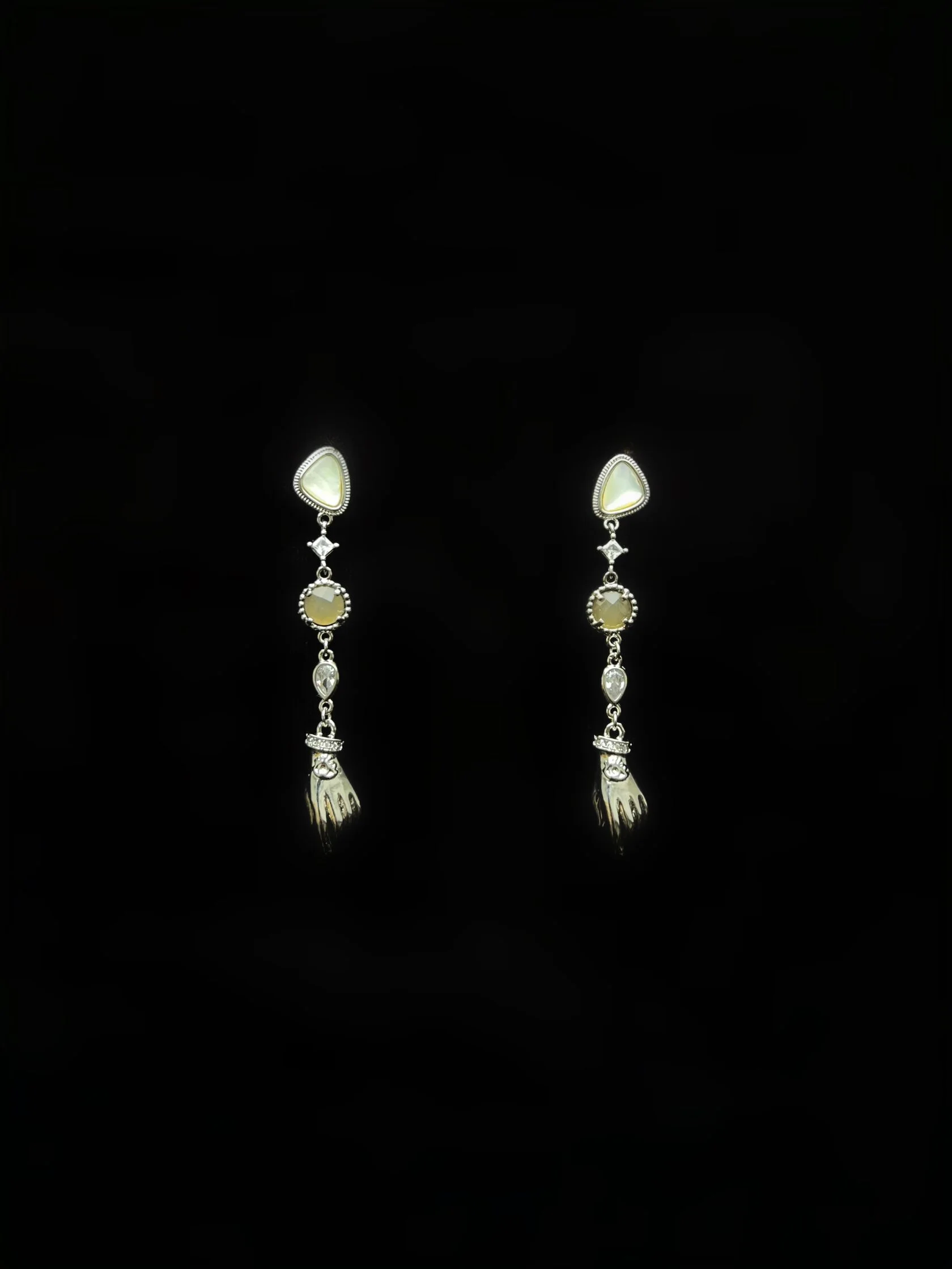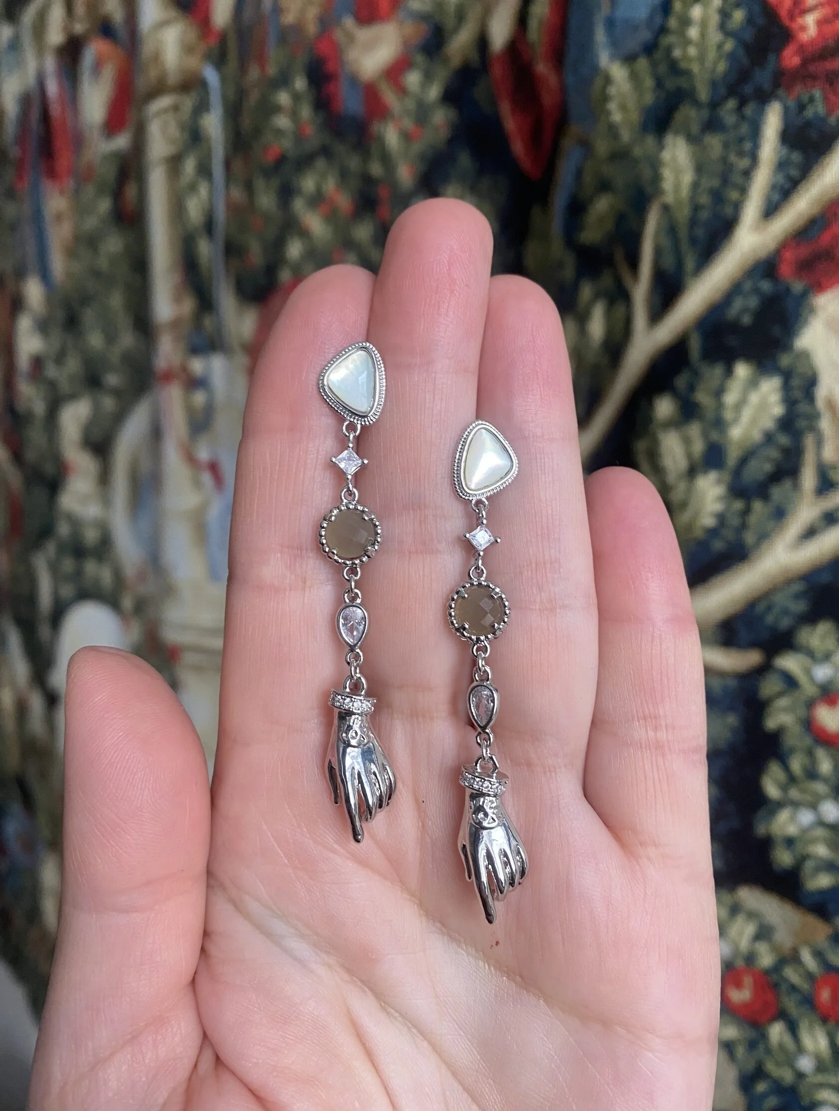 Изящные тонкие серьги украшены вставками декоративного стекла и дополнены подвесками в форме рук. Застежки-гвоздики