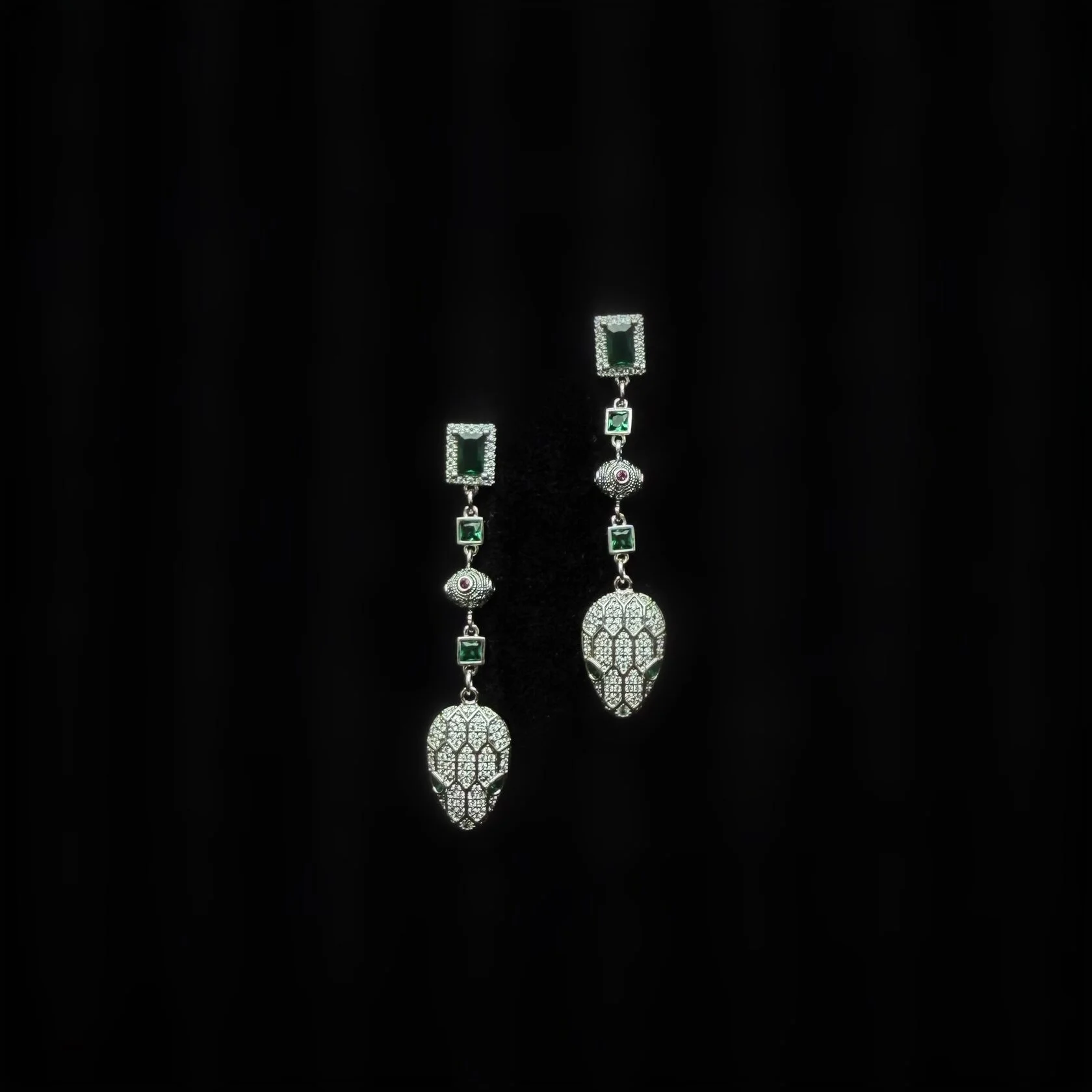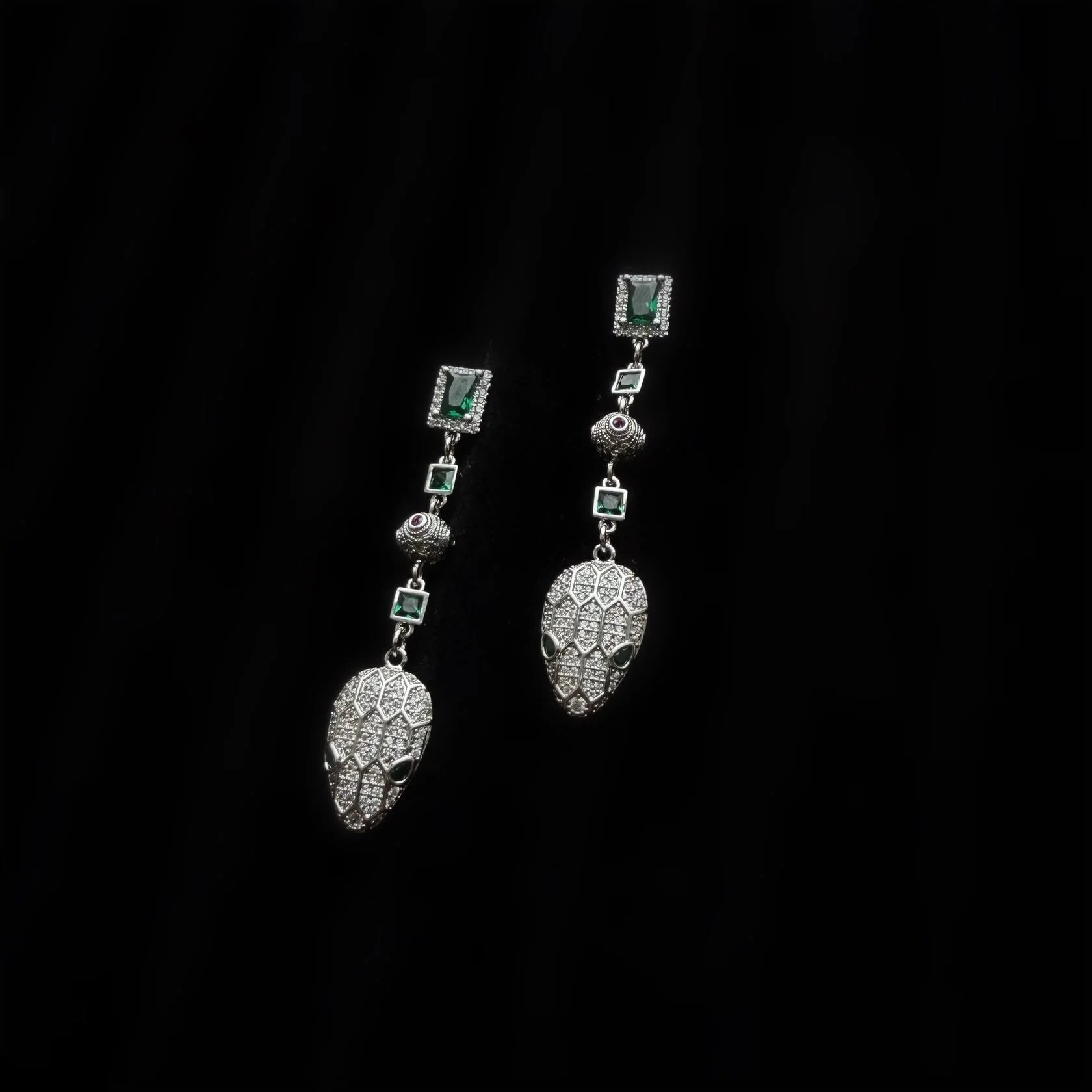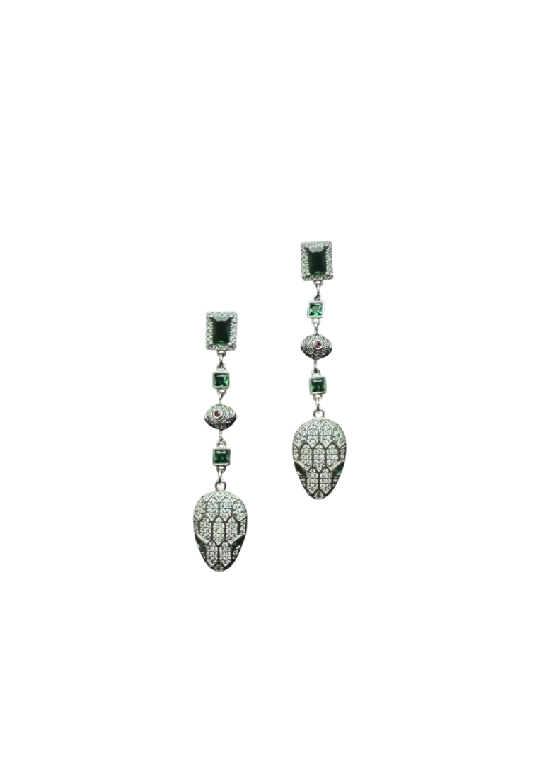 Изящные длинные серьги украшены вставками декоративного стекла и дополнены подвесками в виде змеиных голов. Застежки-гвоздики