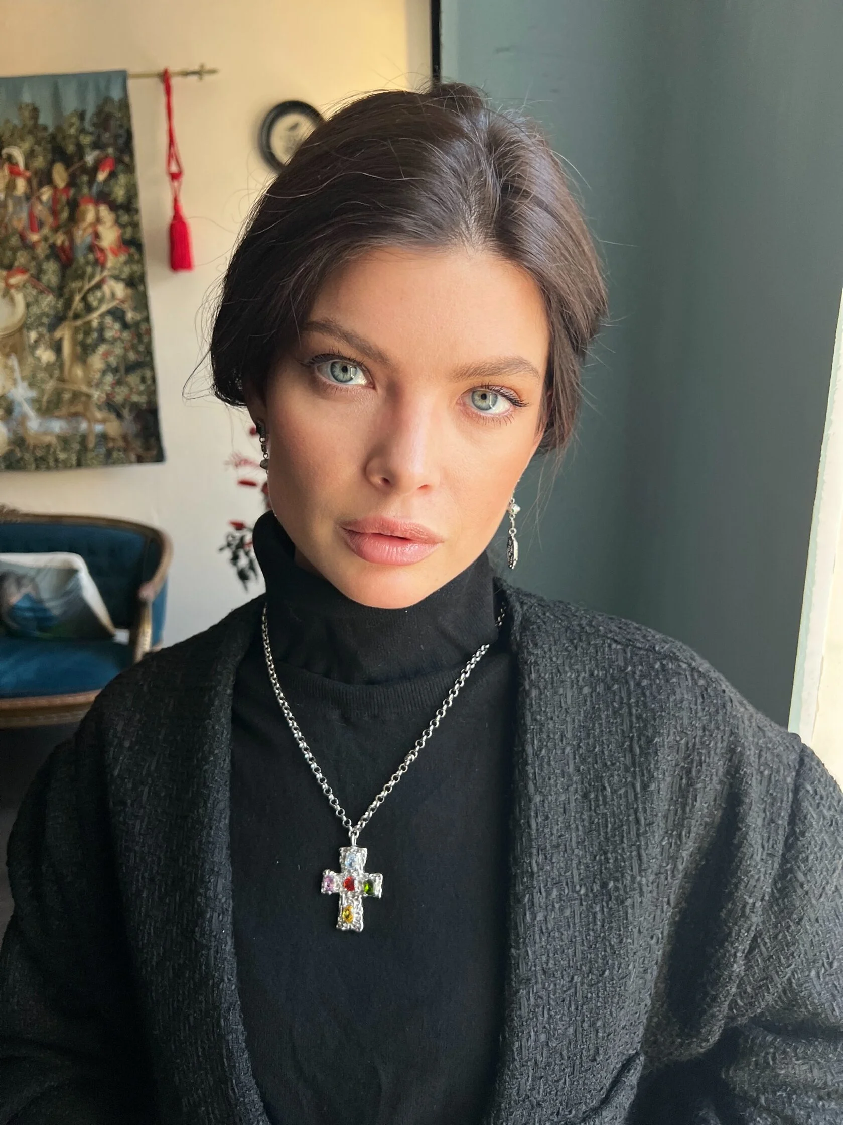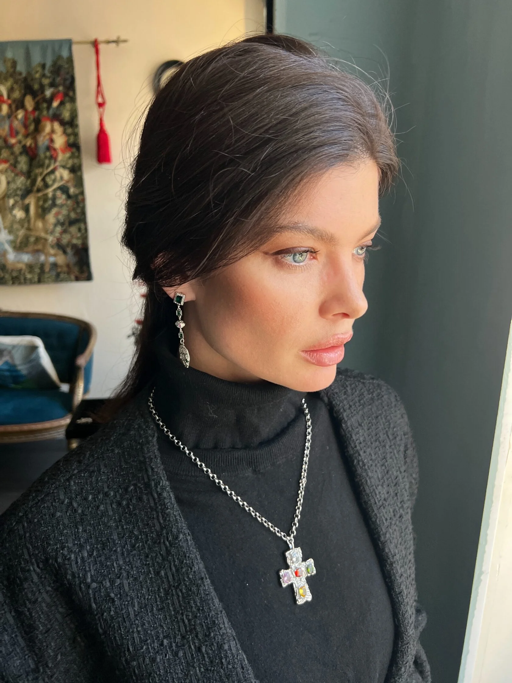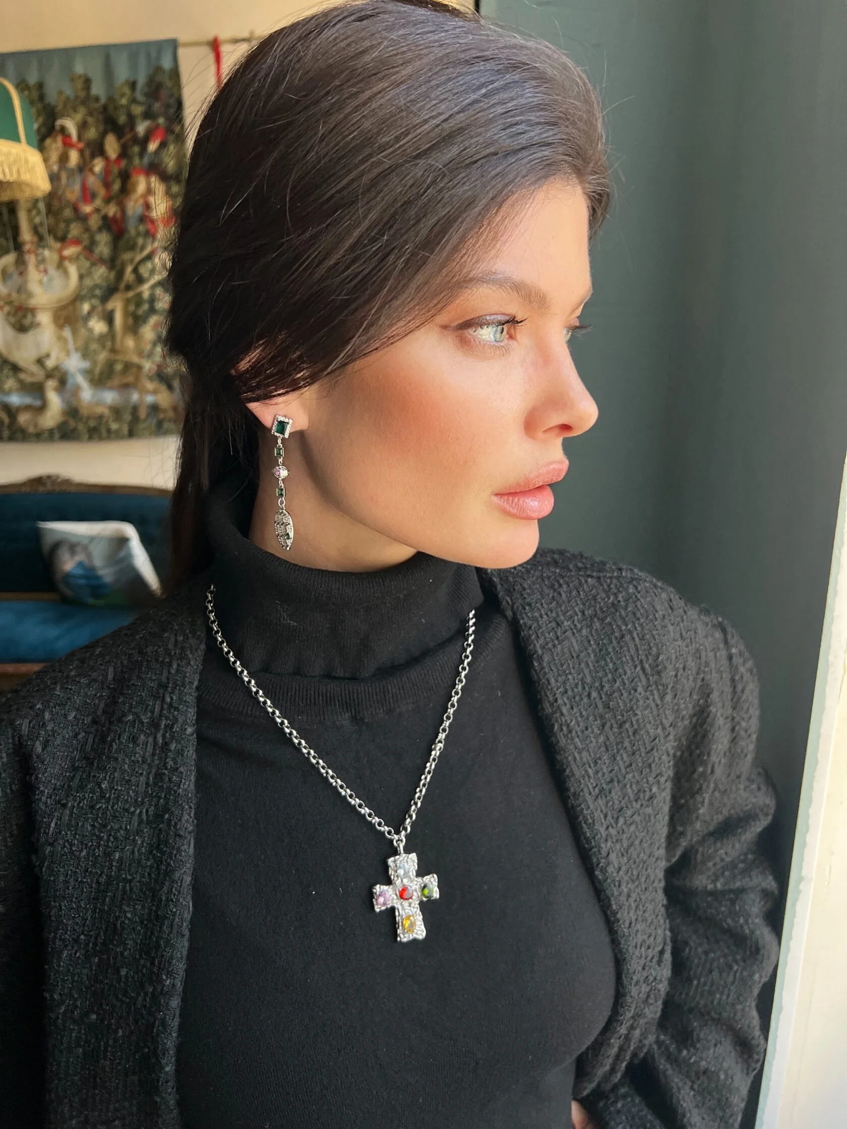 Изящные длинные серьги украшены вставками декоративного стекла и дополнены подвесками в виде змеиных голов. Застежки-гвоздики