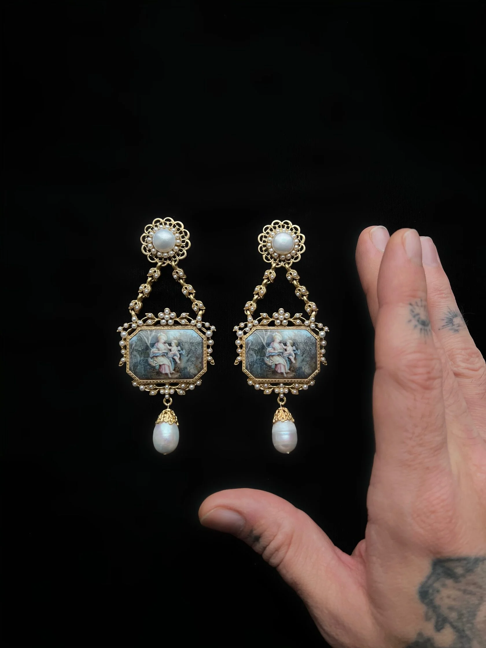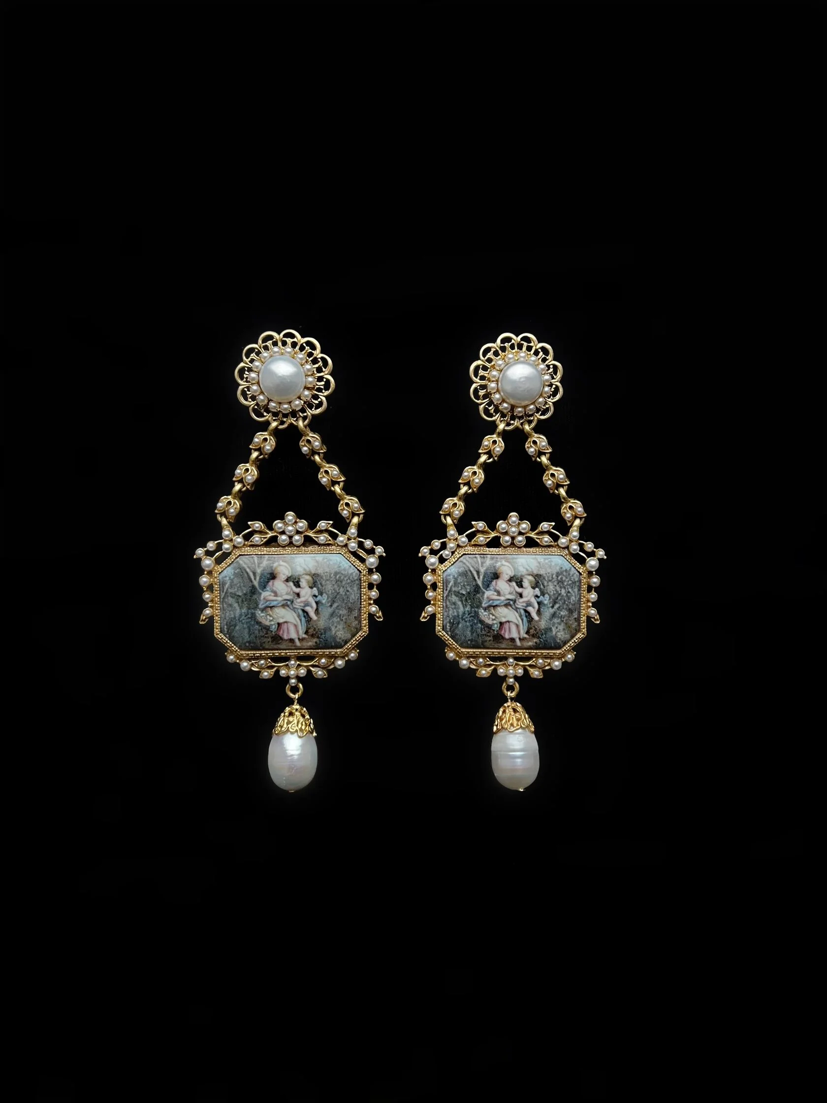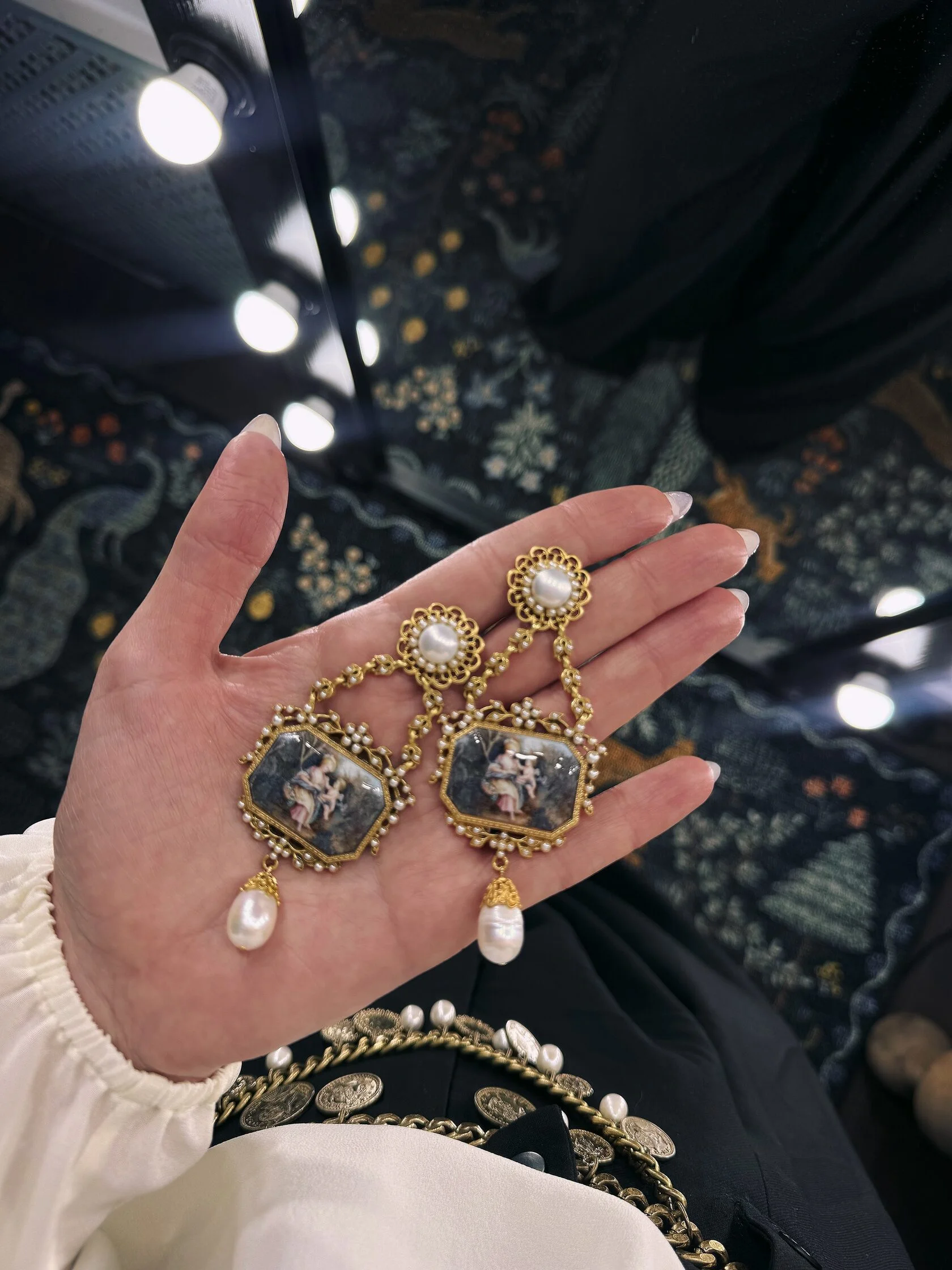 Барочные серьги украшены кабошонами натурального жемчуга, декоративными вставками в винтажном стиле и дополнены подвесками речного жемчуга.