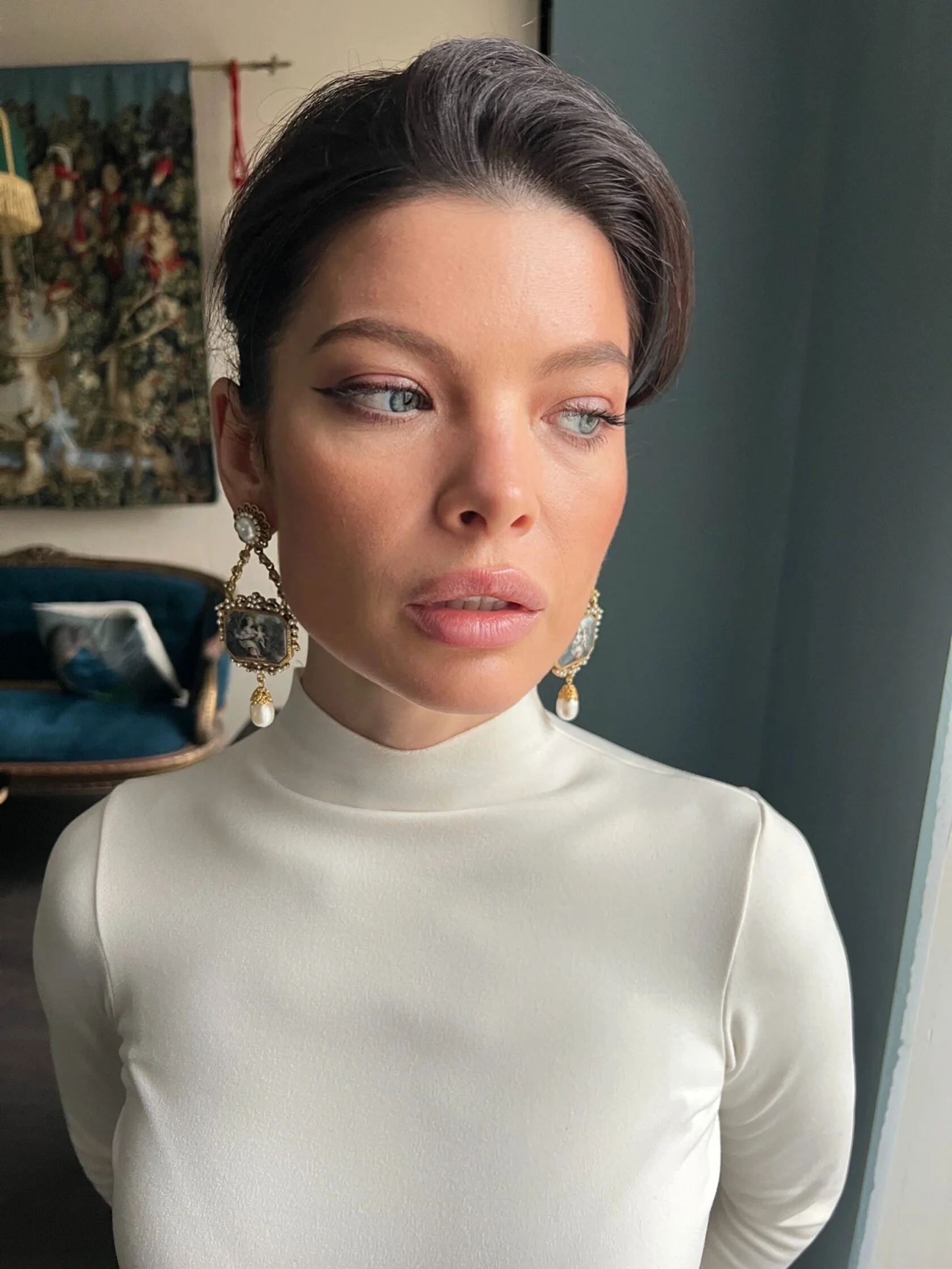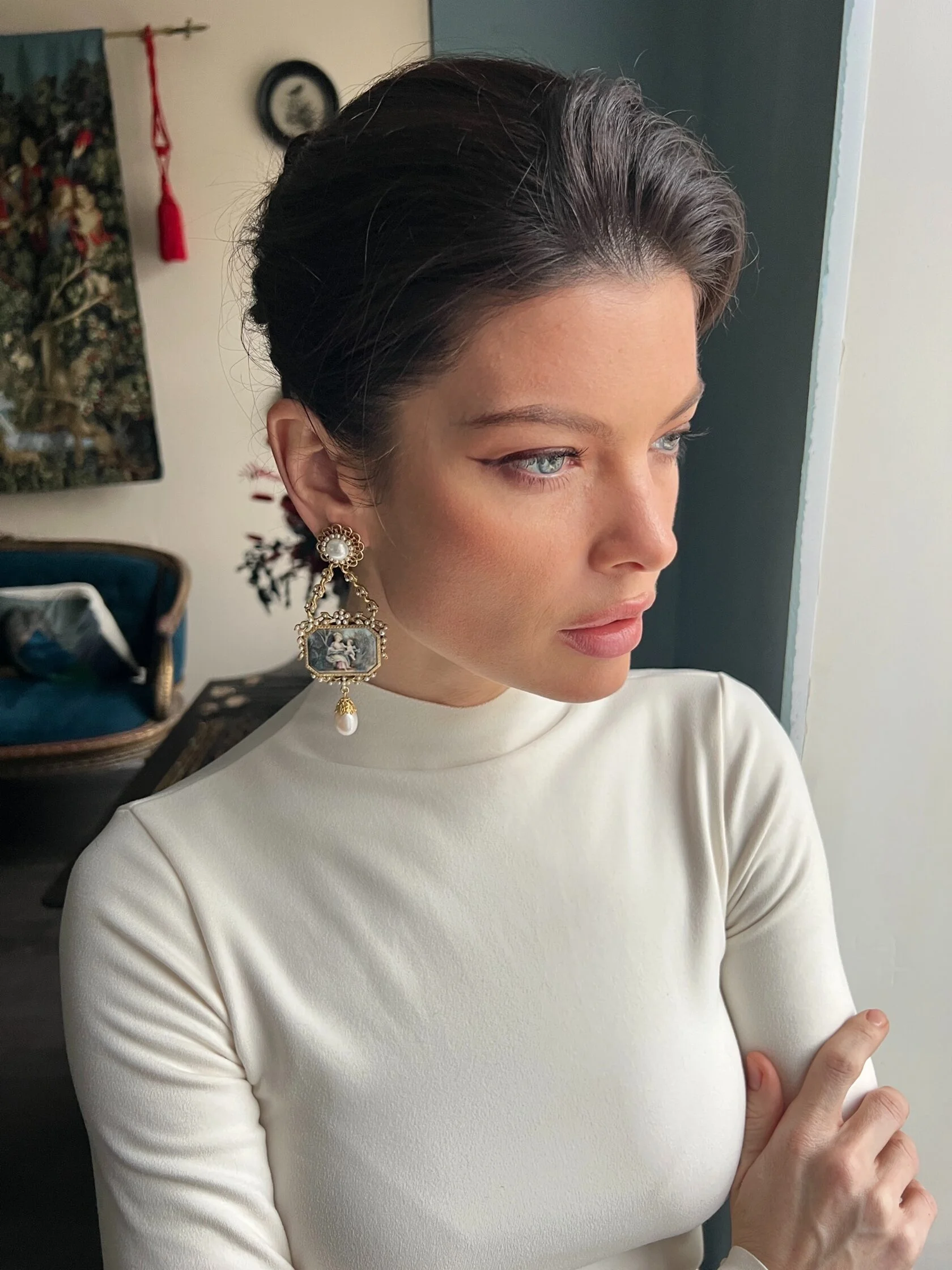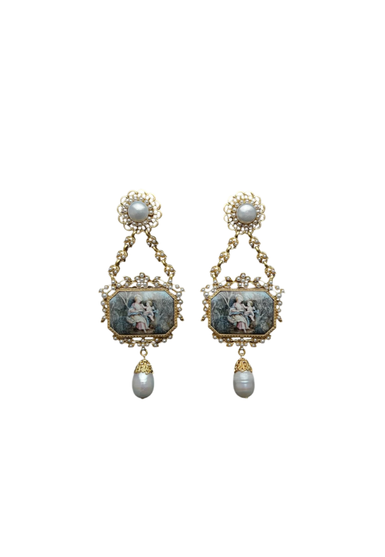 Барочные серьги украшены кабошонами натурального жемчуга, декоративными вставками в винтажном стиле и дополнены подвесками речного жемчуга.