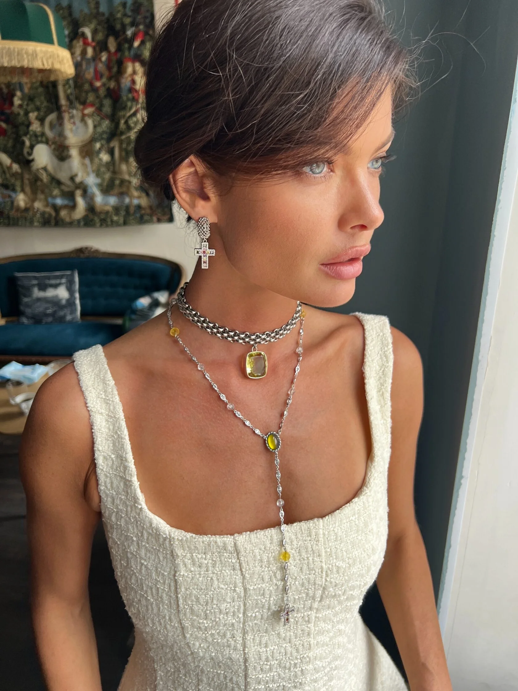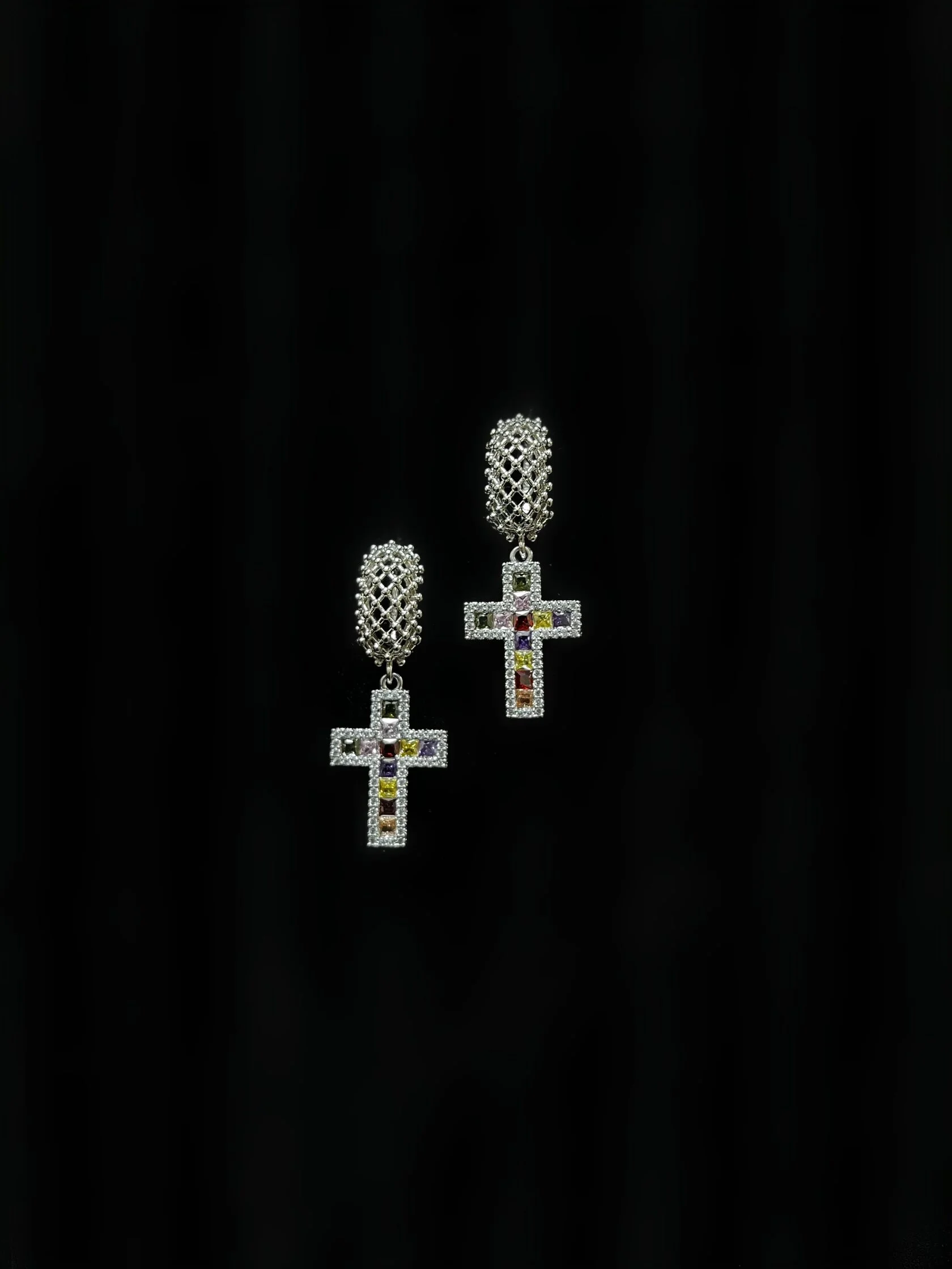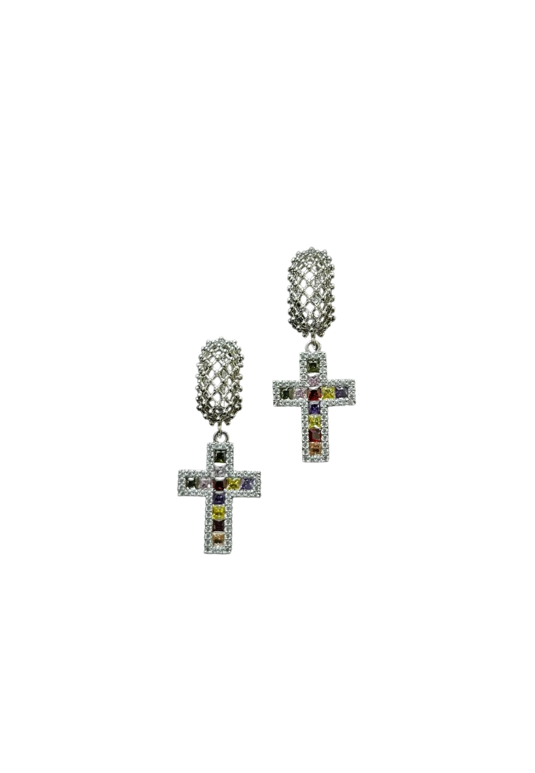 Коктейльные серьги украшены декоративными крестами с цветными кристаллами «Swarovski». Английский замок
