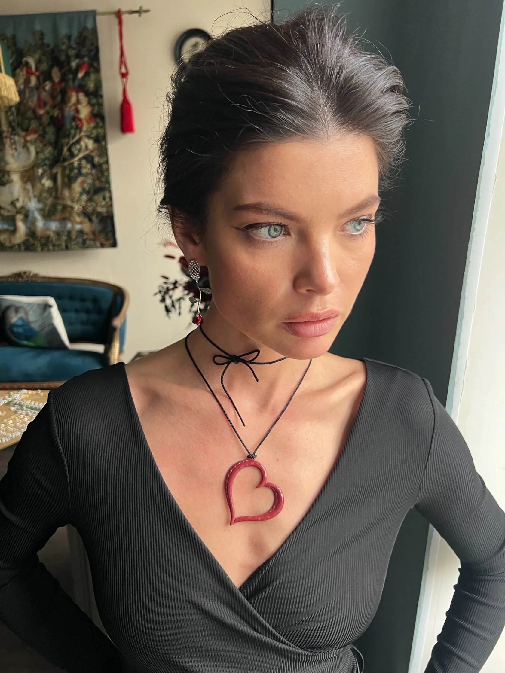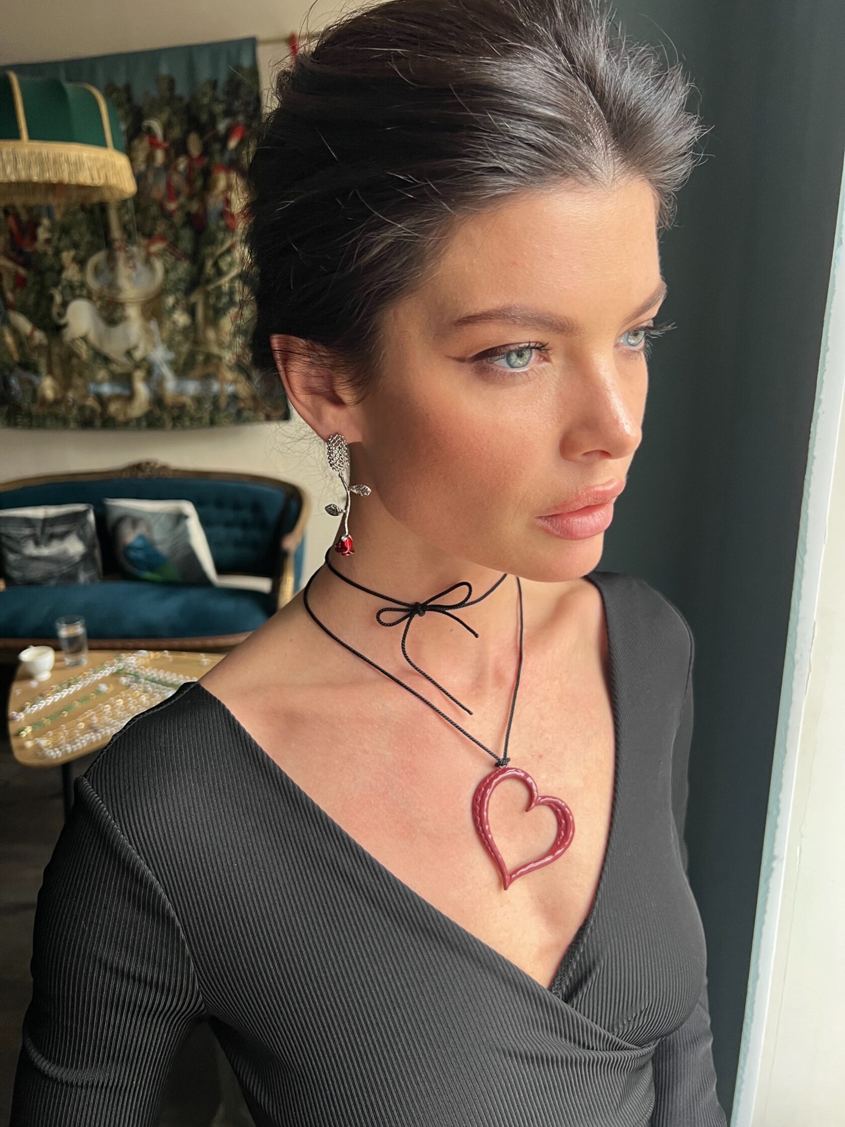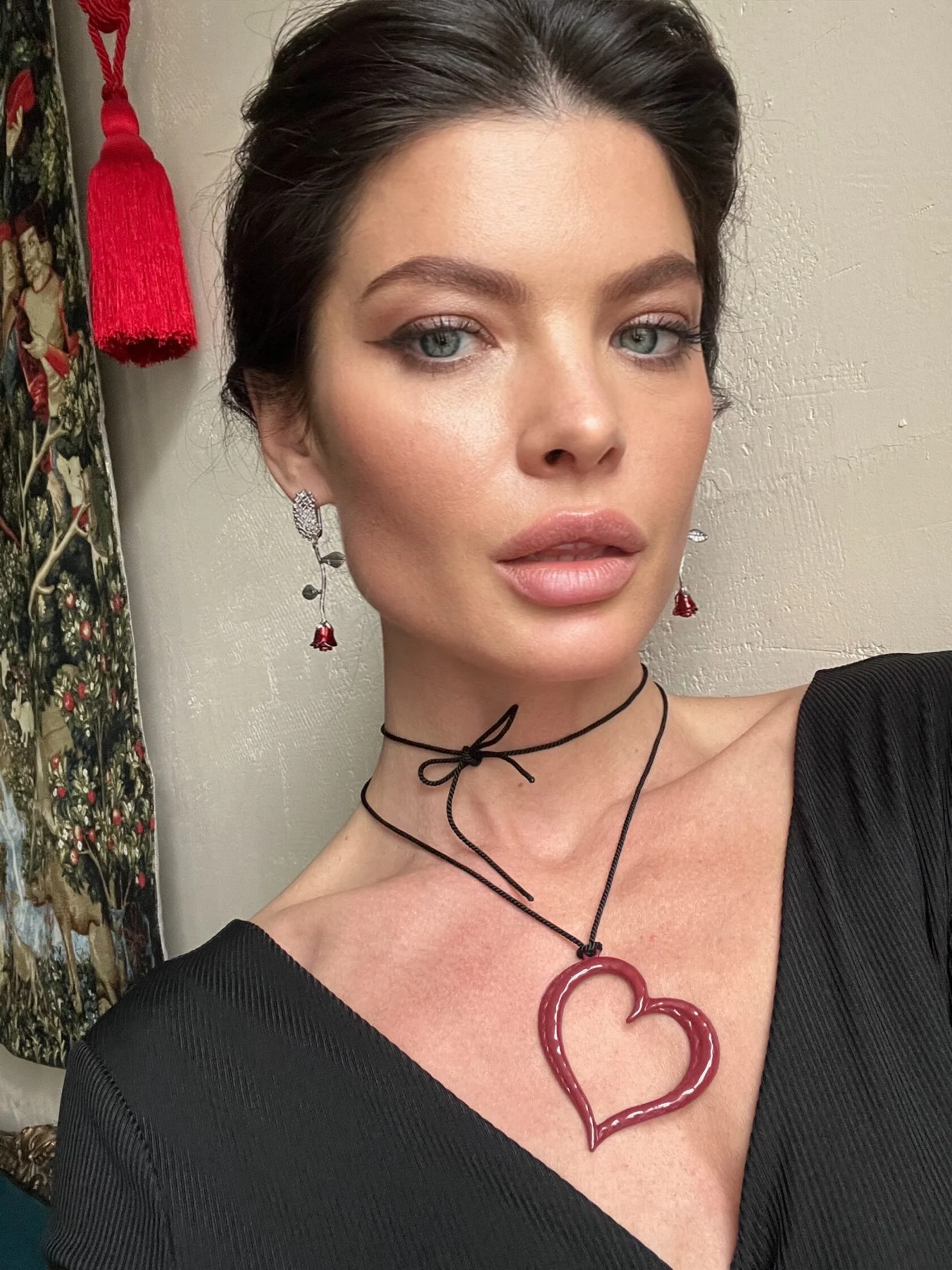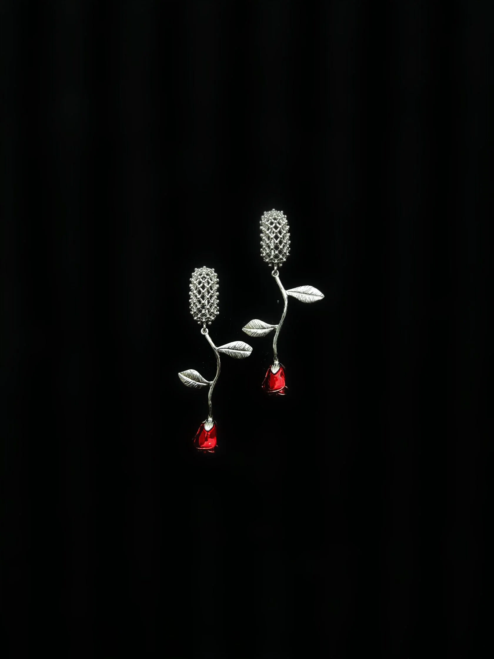 Акцентные серьги украшены подвесками в виде роз с цветной эмалью. Английский замок