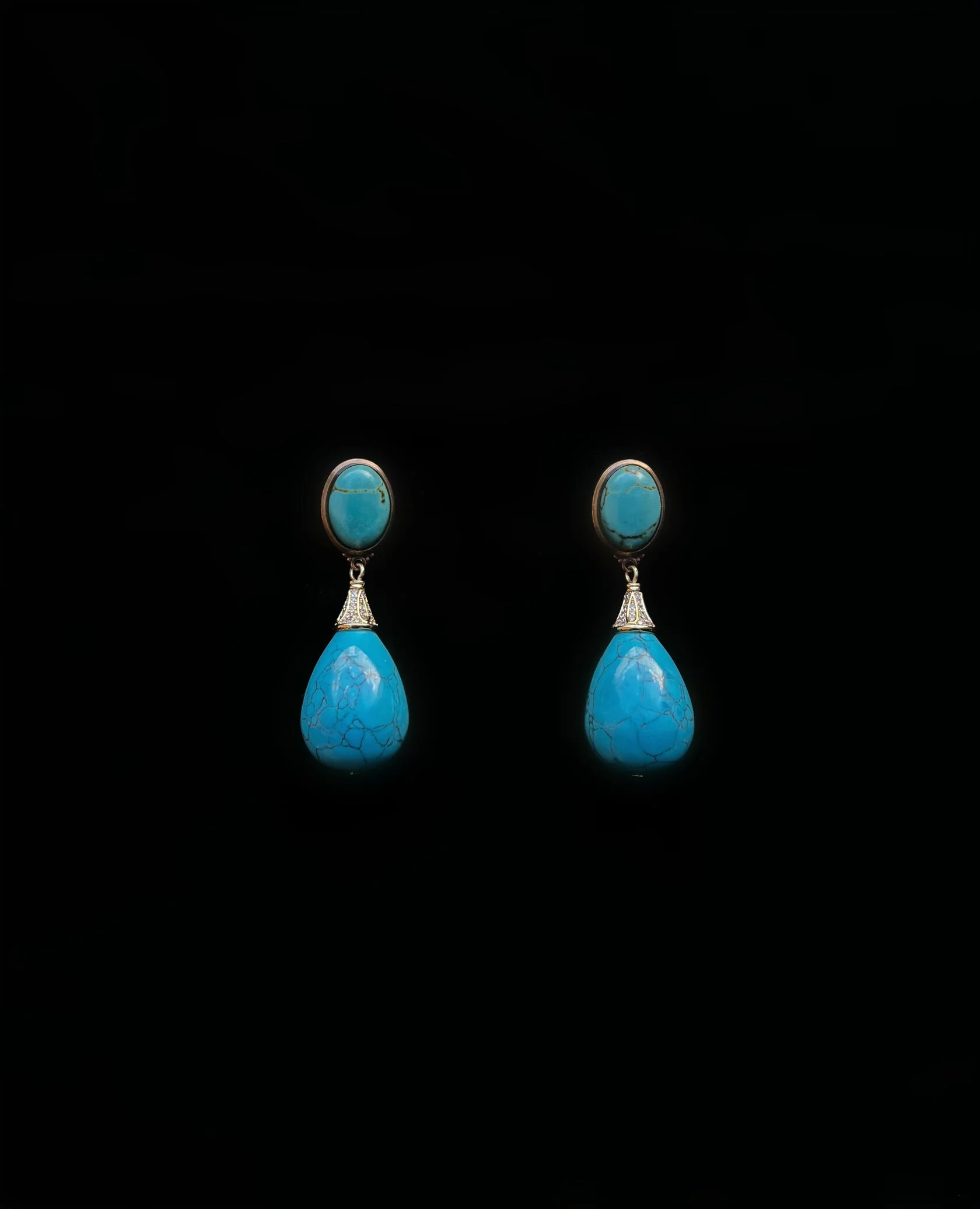 Акцентные серьги украшены кабошонами и крупными каплями турквенита (под бирюзу).