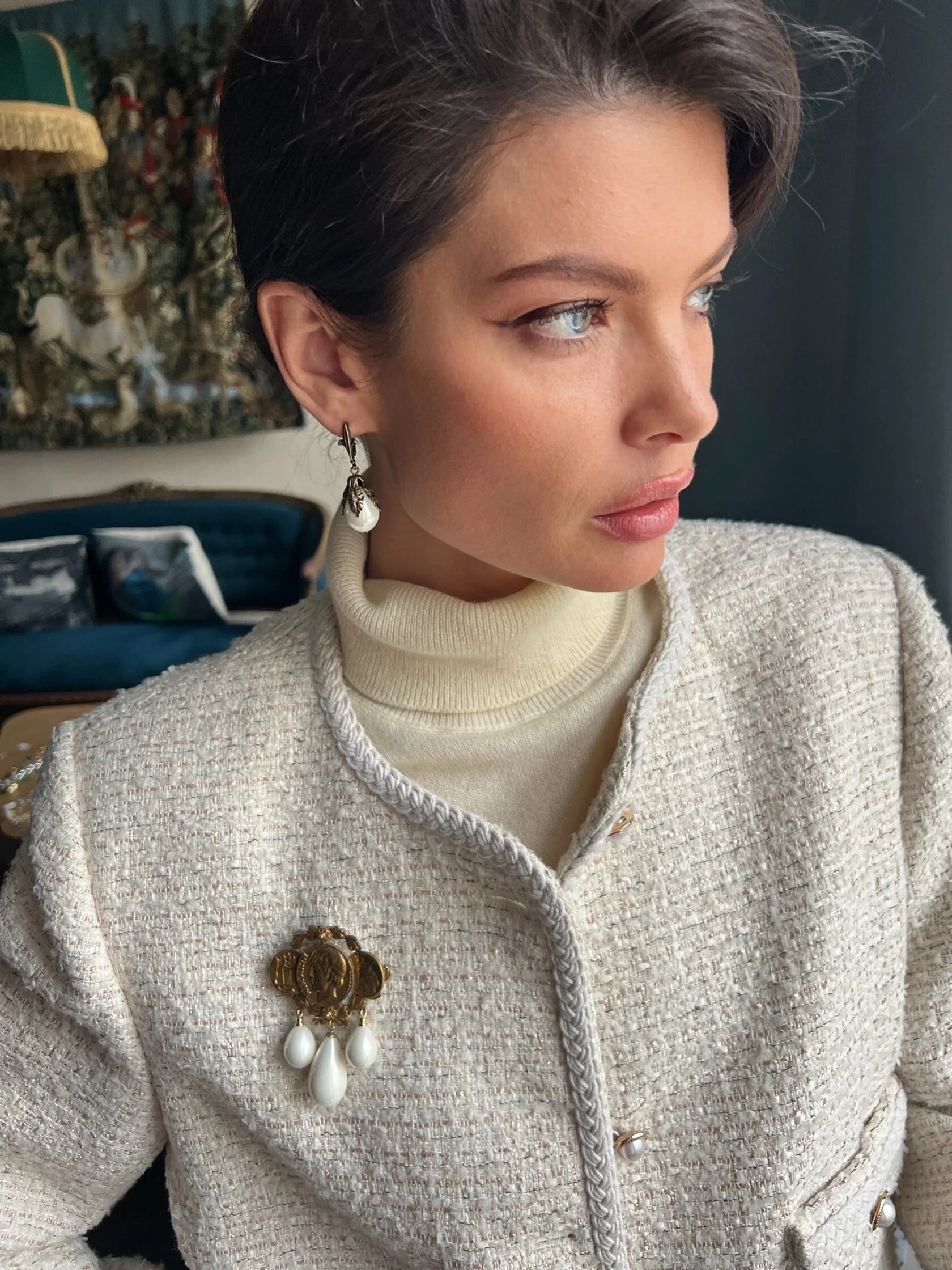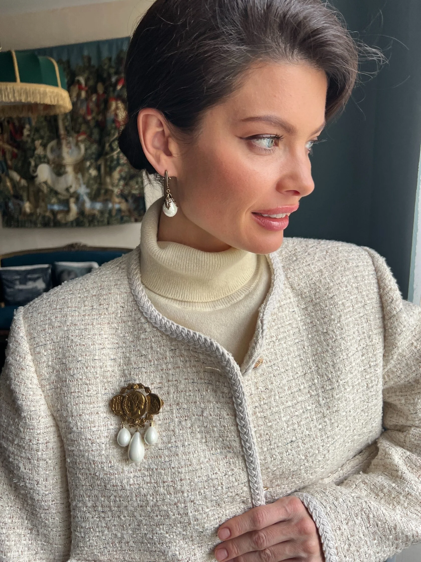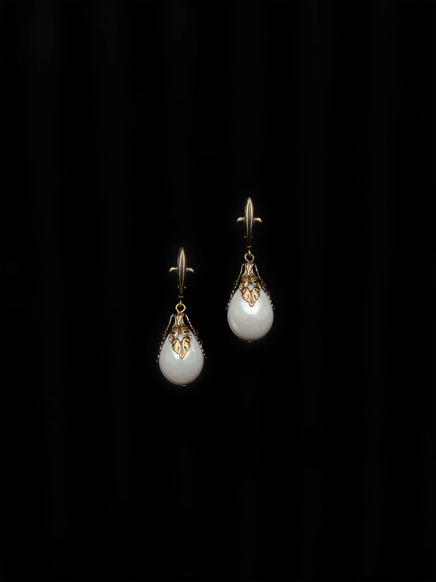Классические серьги в виде геральдических лилий украшены подвесками-каплями майорики. Английский замок