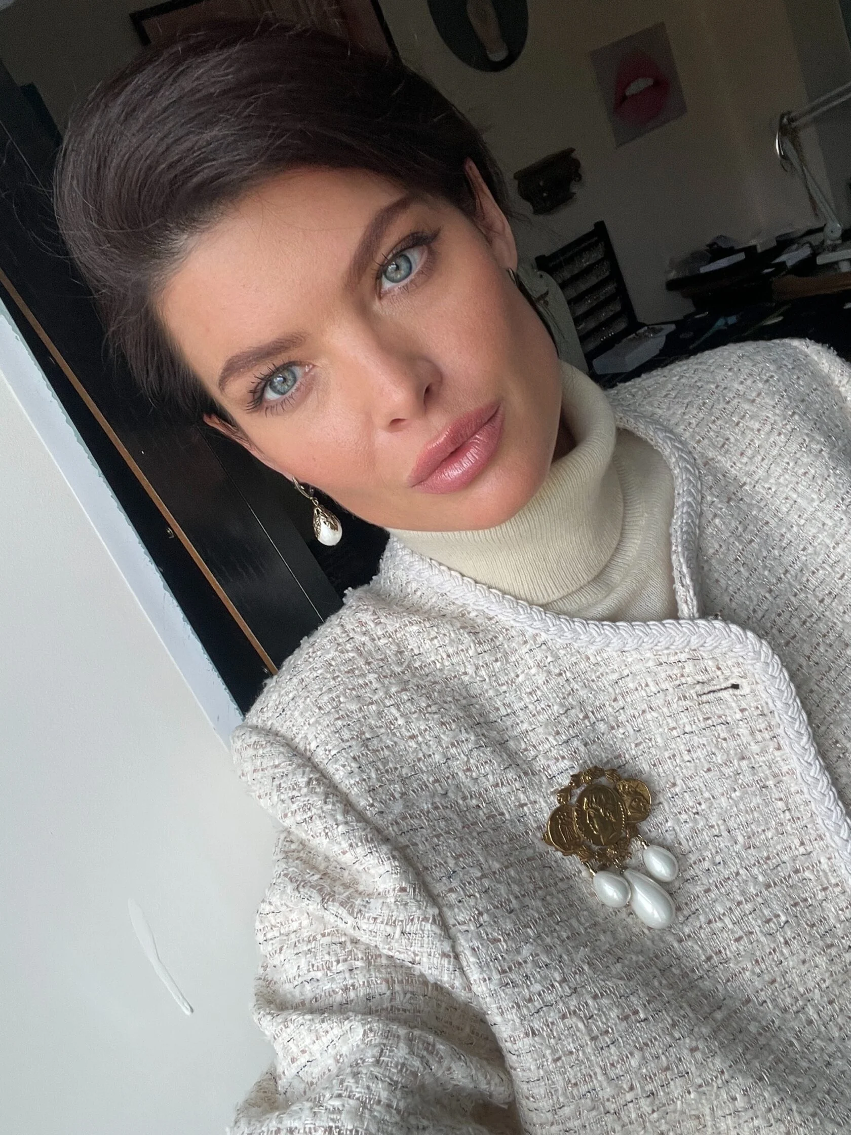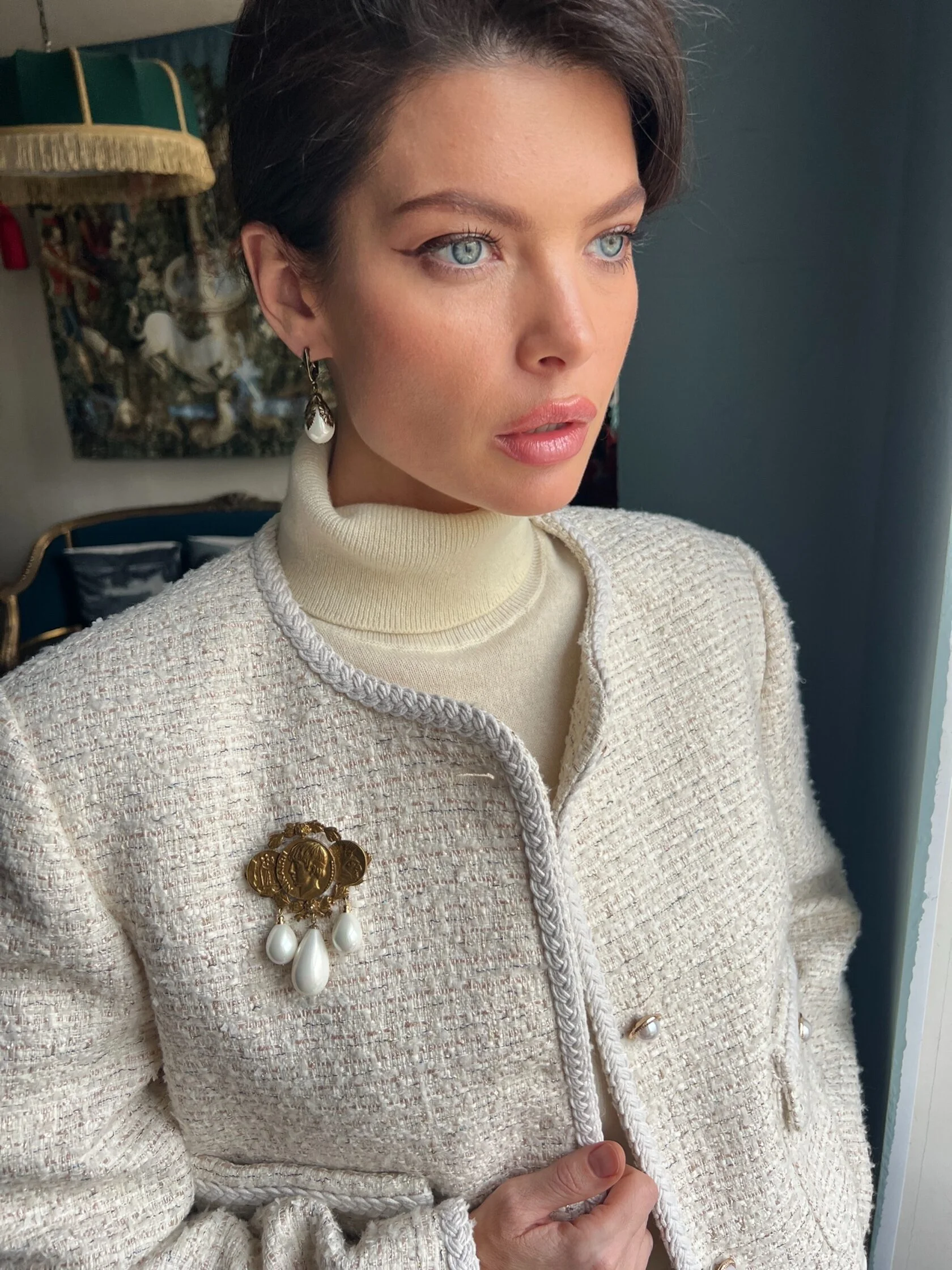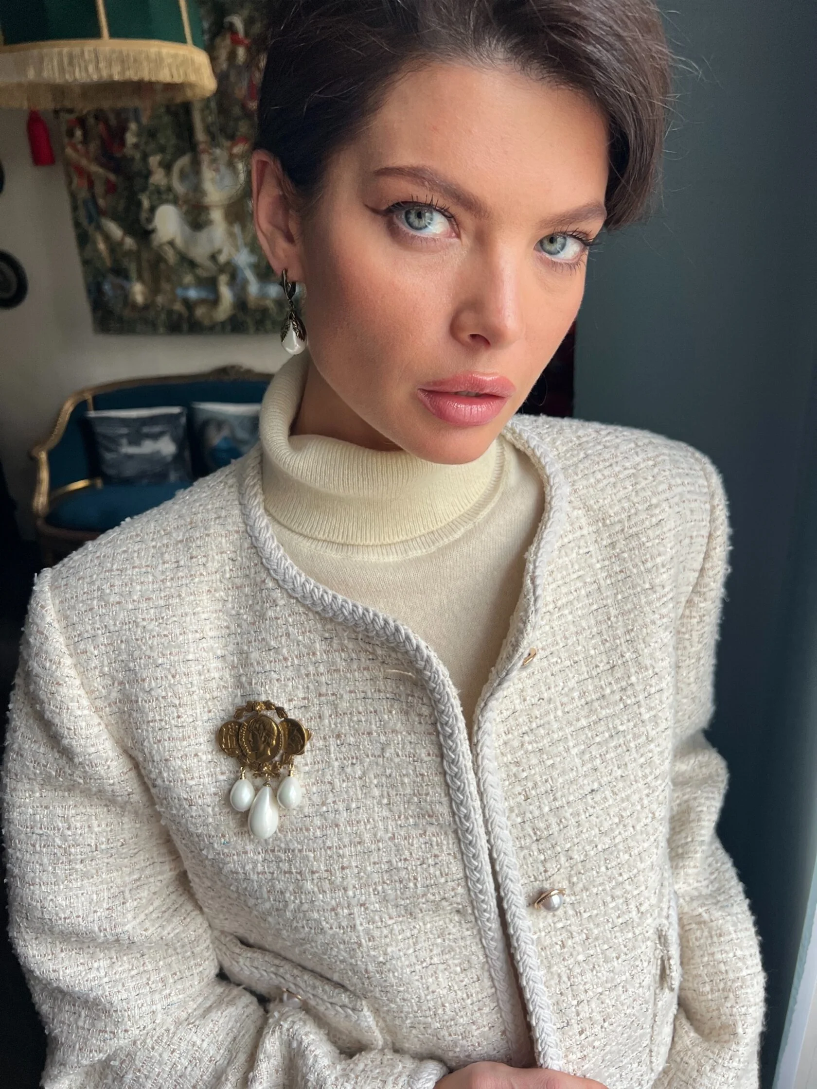 Классические серьги в виде геральдических лилий украшены подвесками-каплями майорики. Английский замок