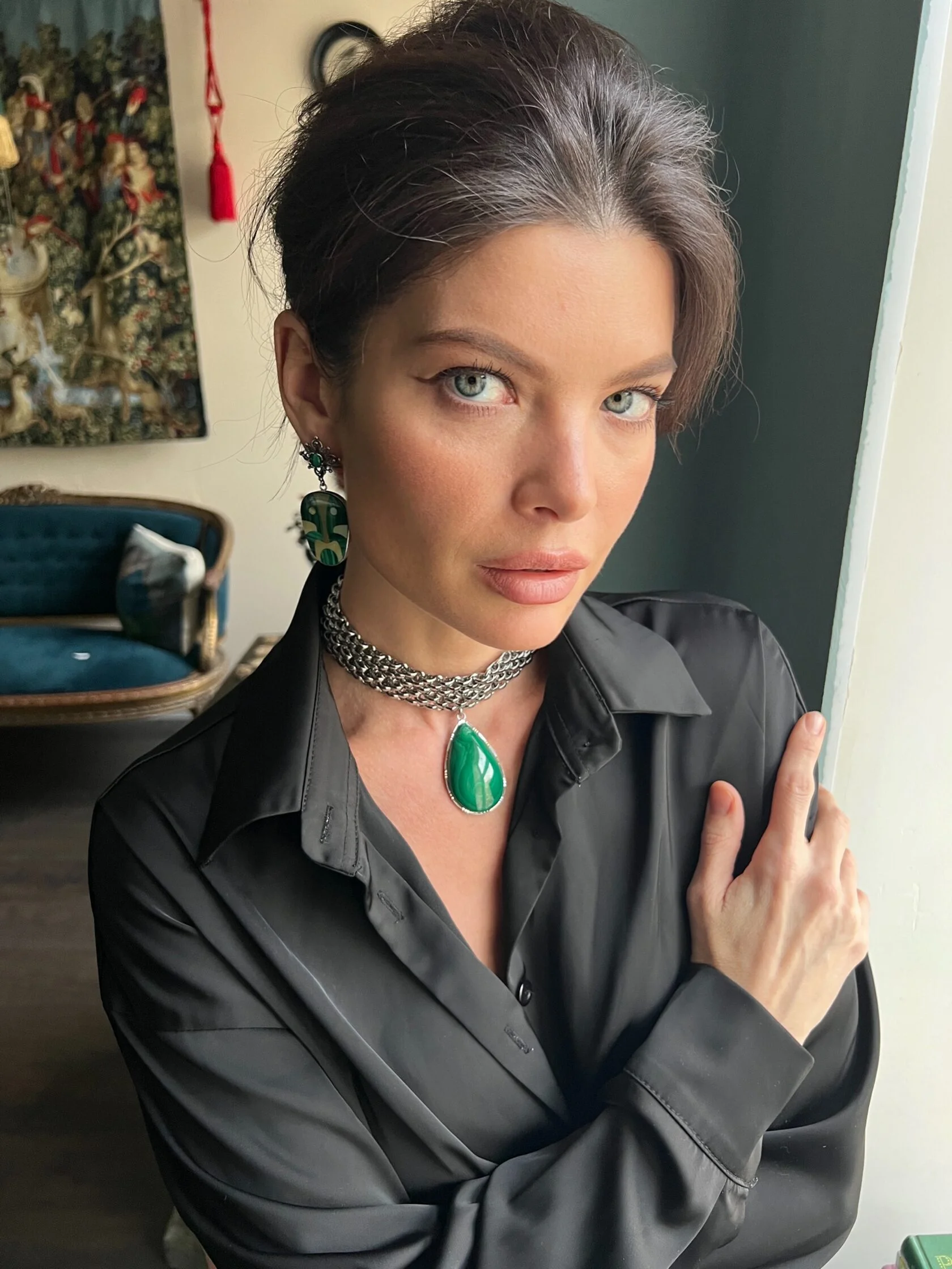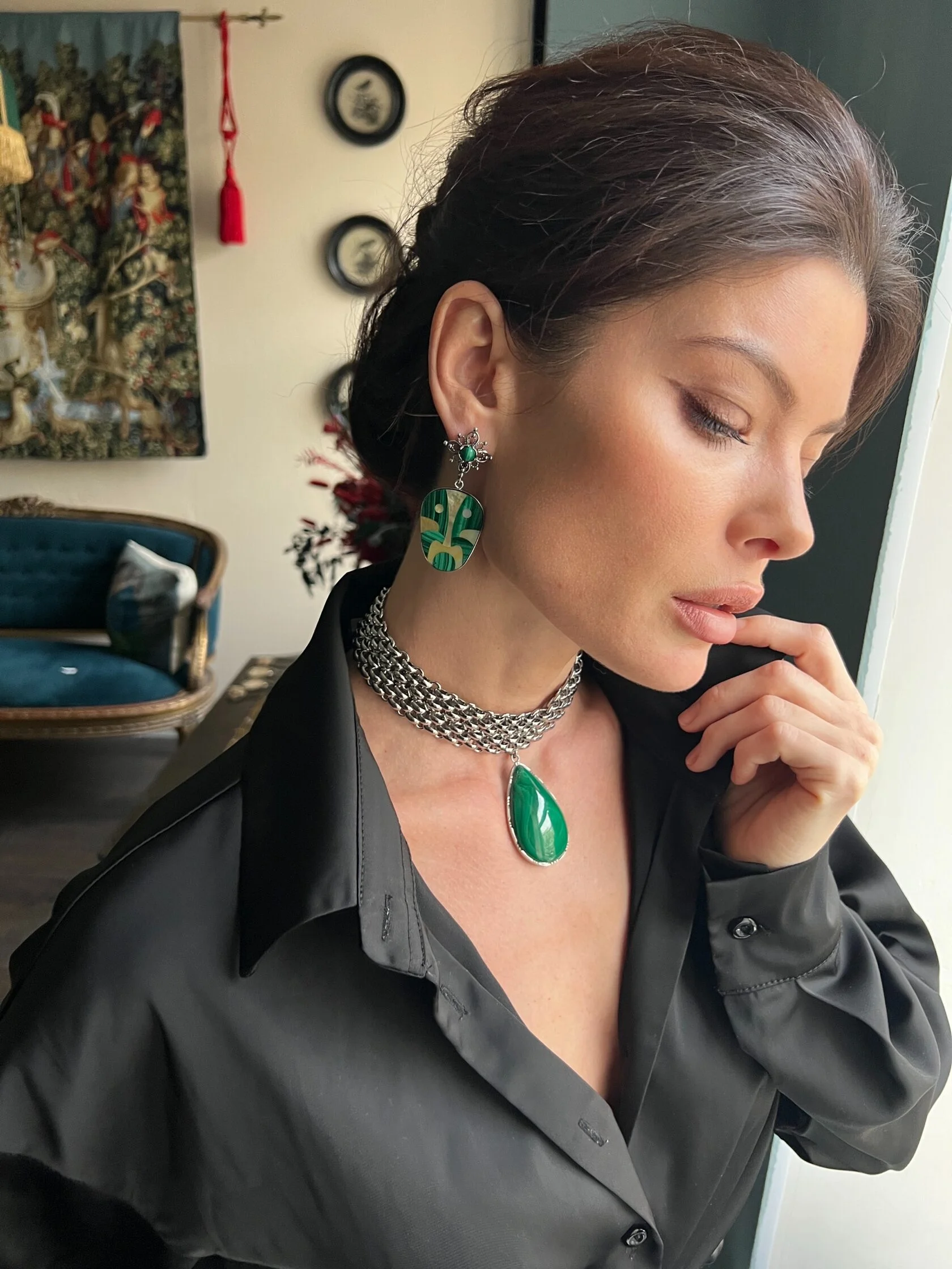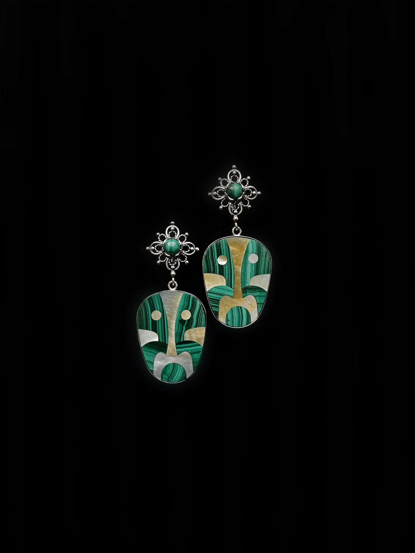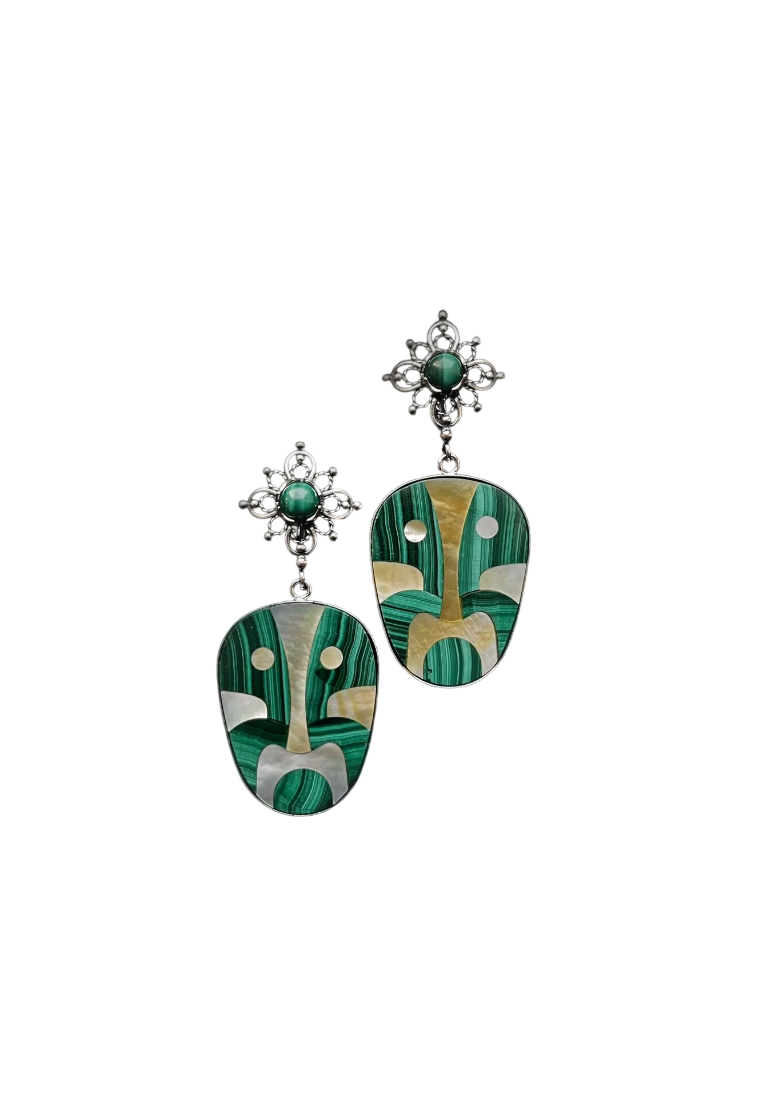 Акцентные серьги в неославянском стиле украшены подвесками тотемами из малахита и перламутра. Английский замок.