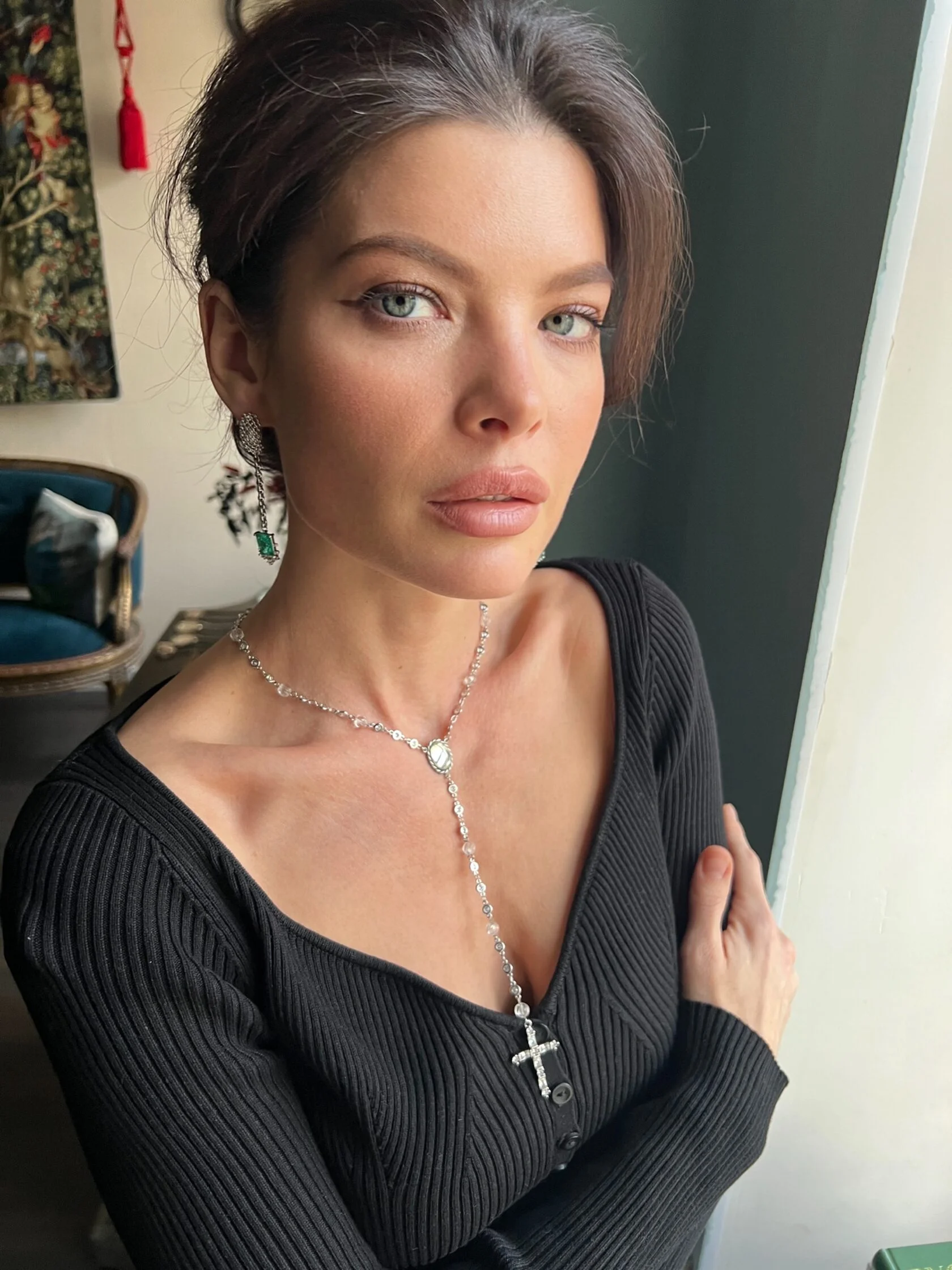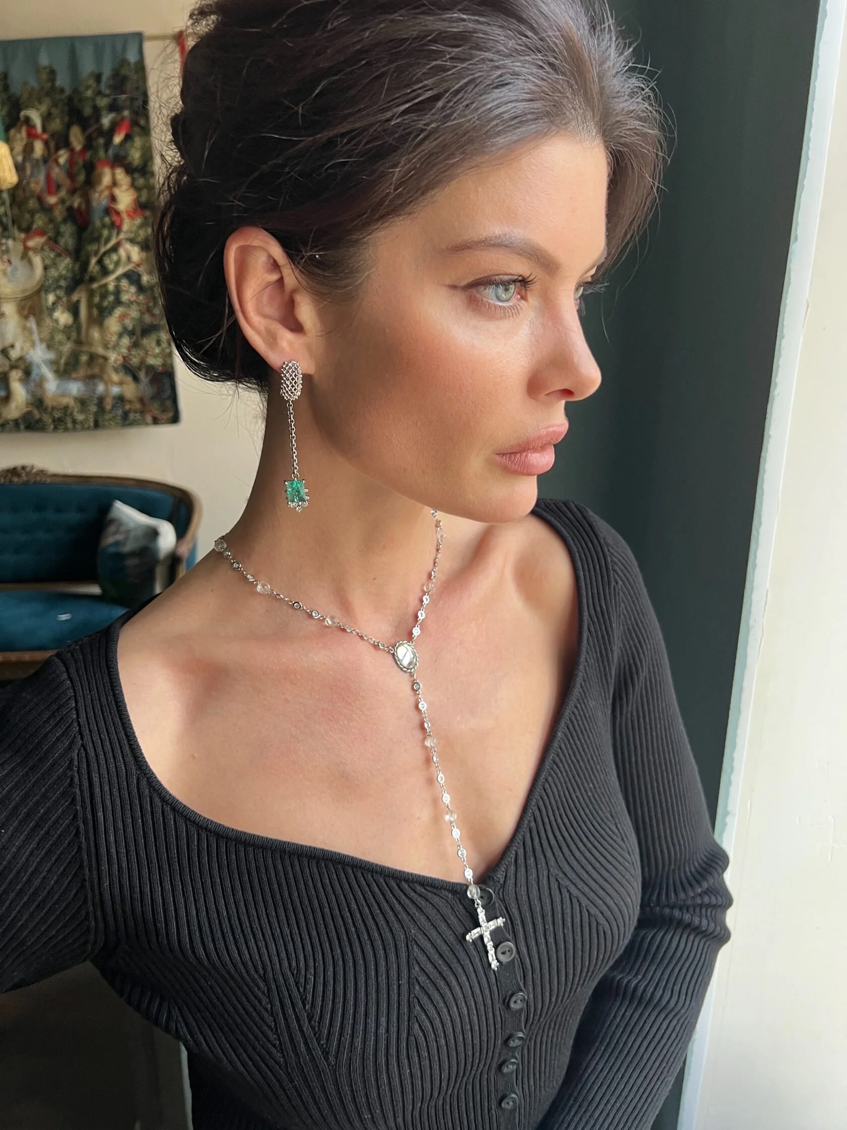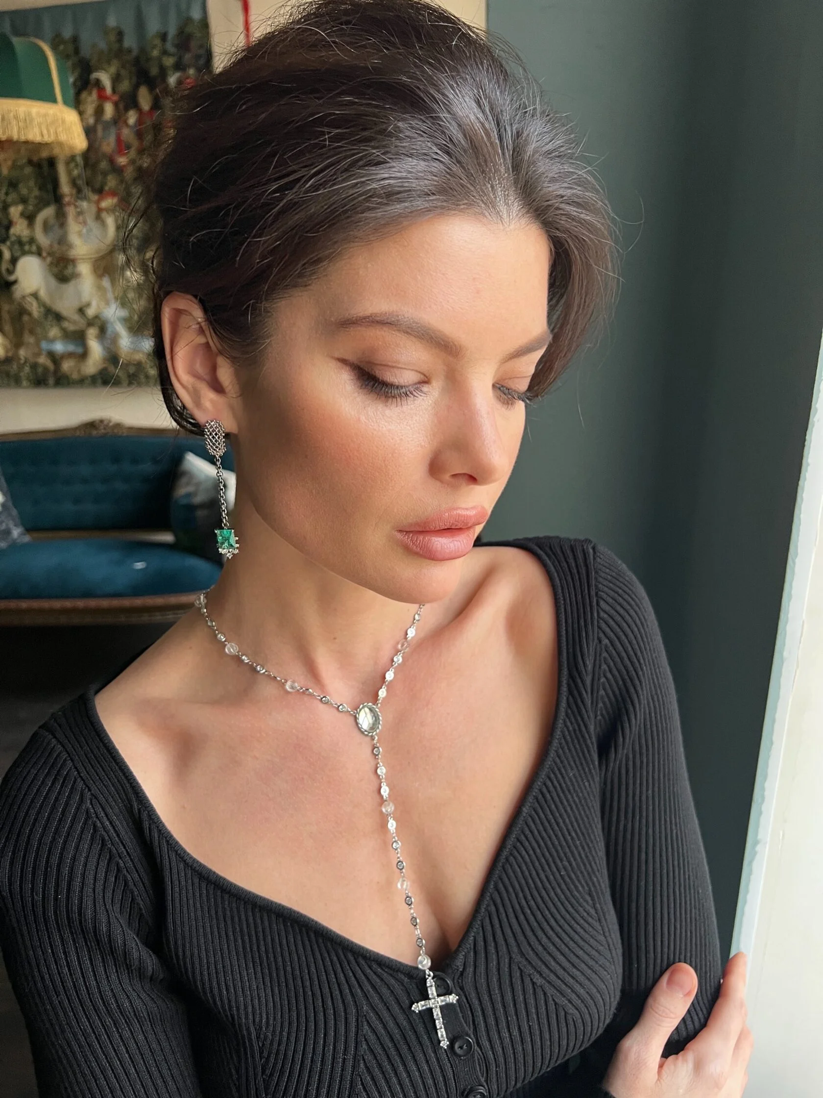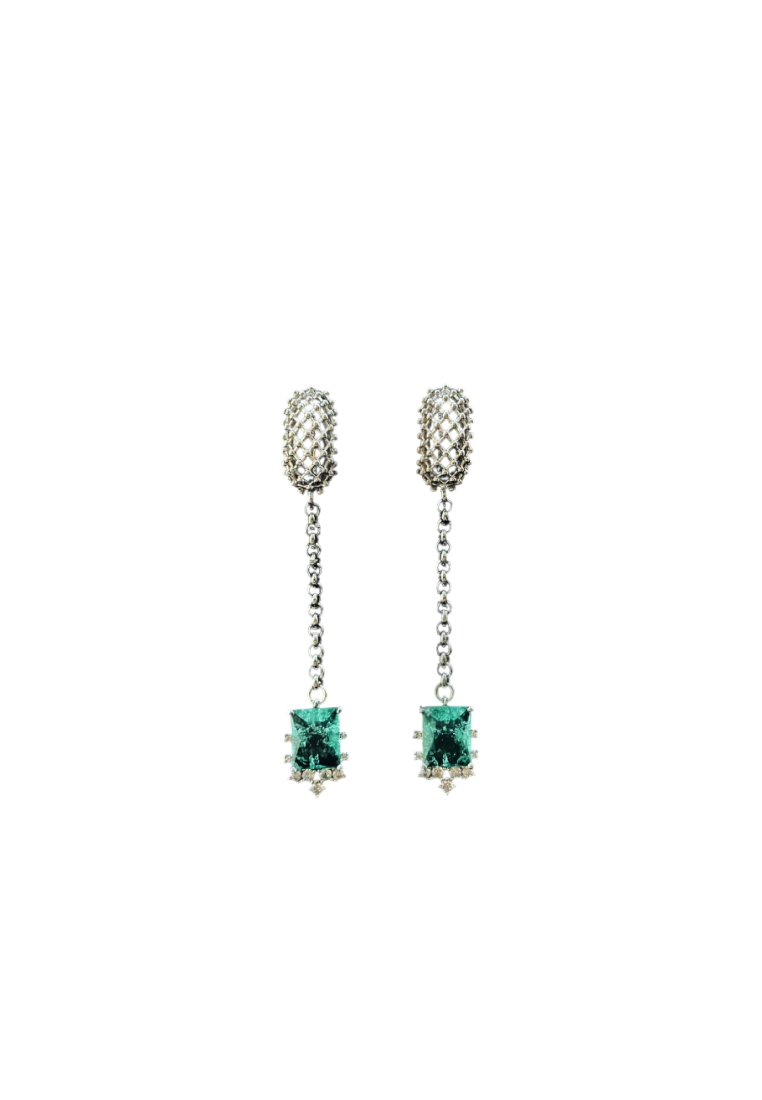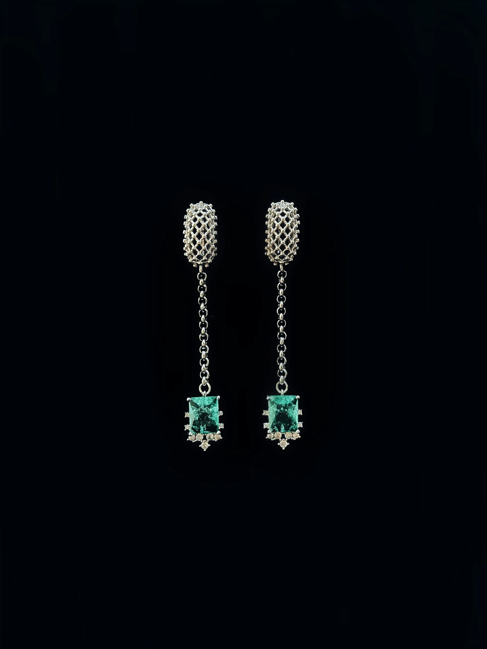 Изящные серьги на цепочках, дополненные подвесками каплями декоративного стекла цвета параиба и мелких страз.