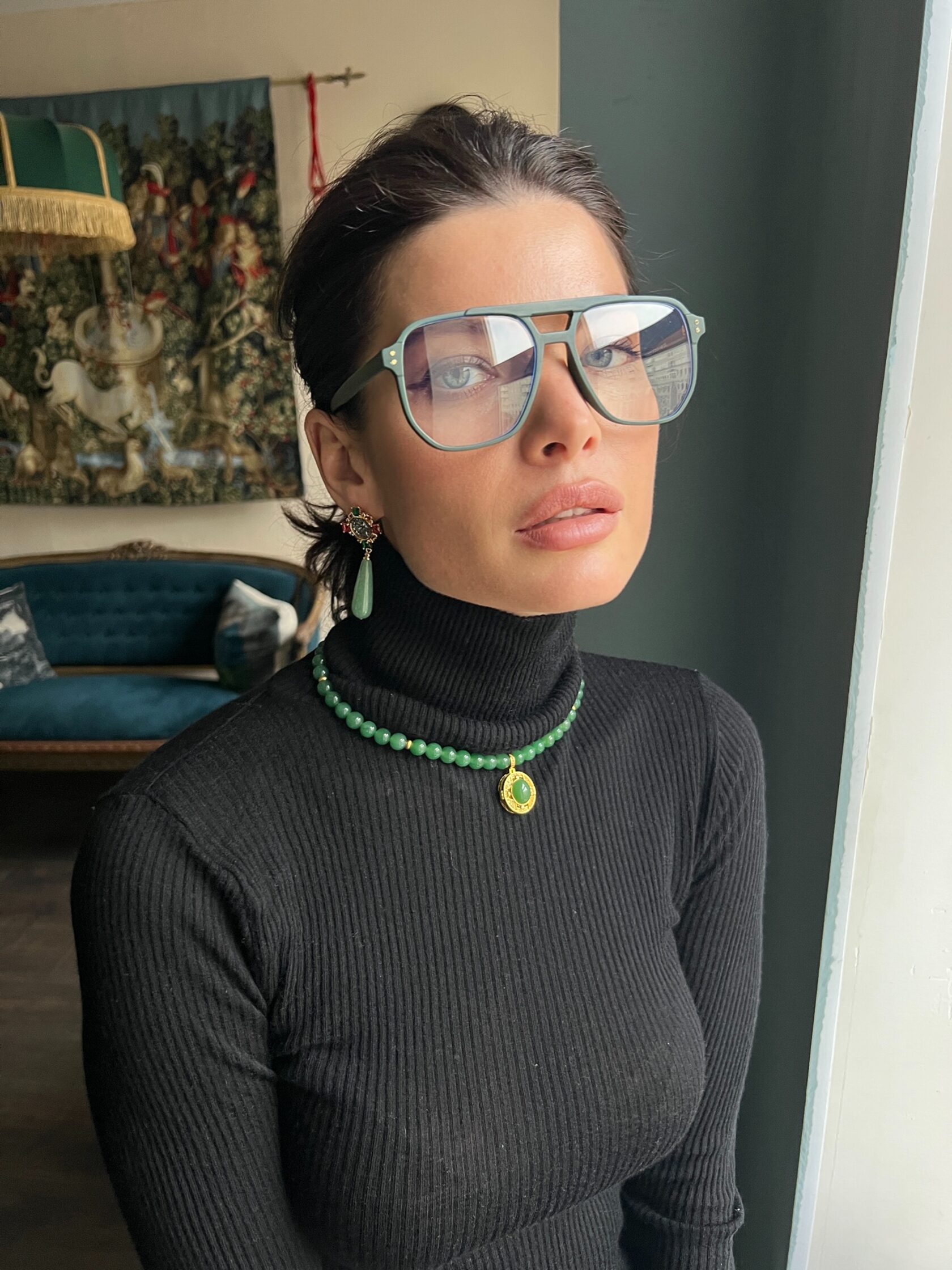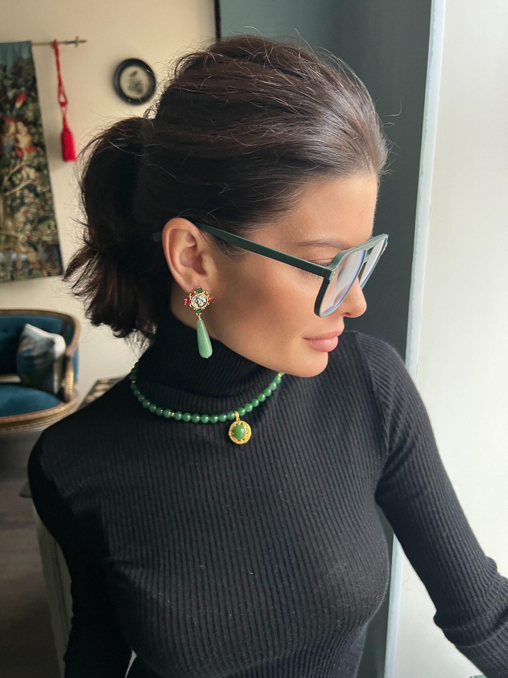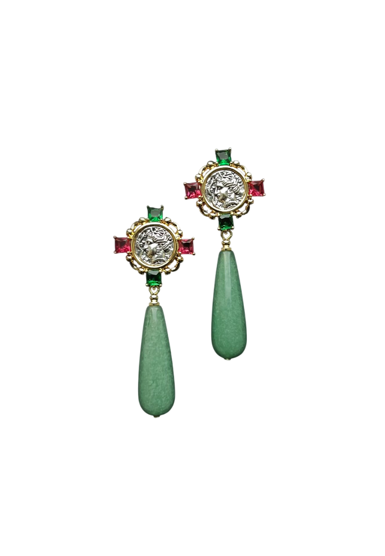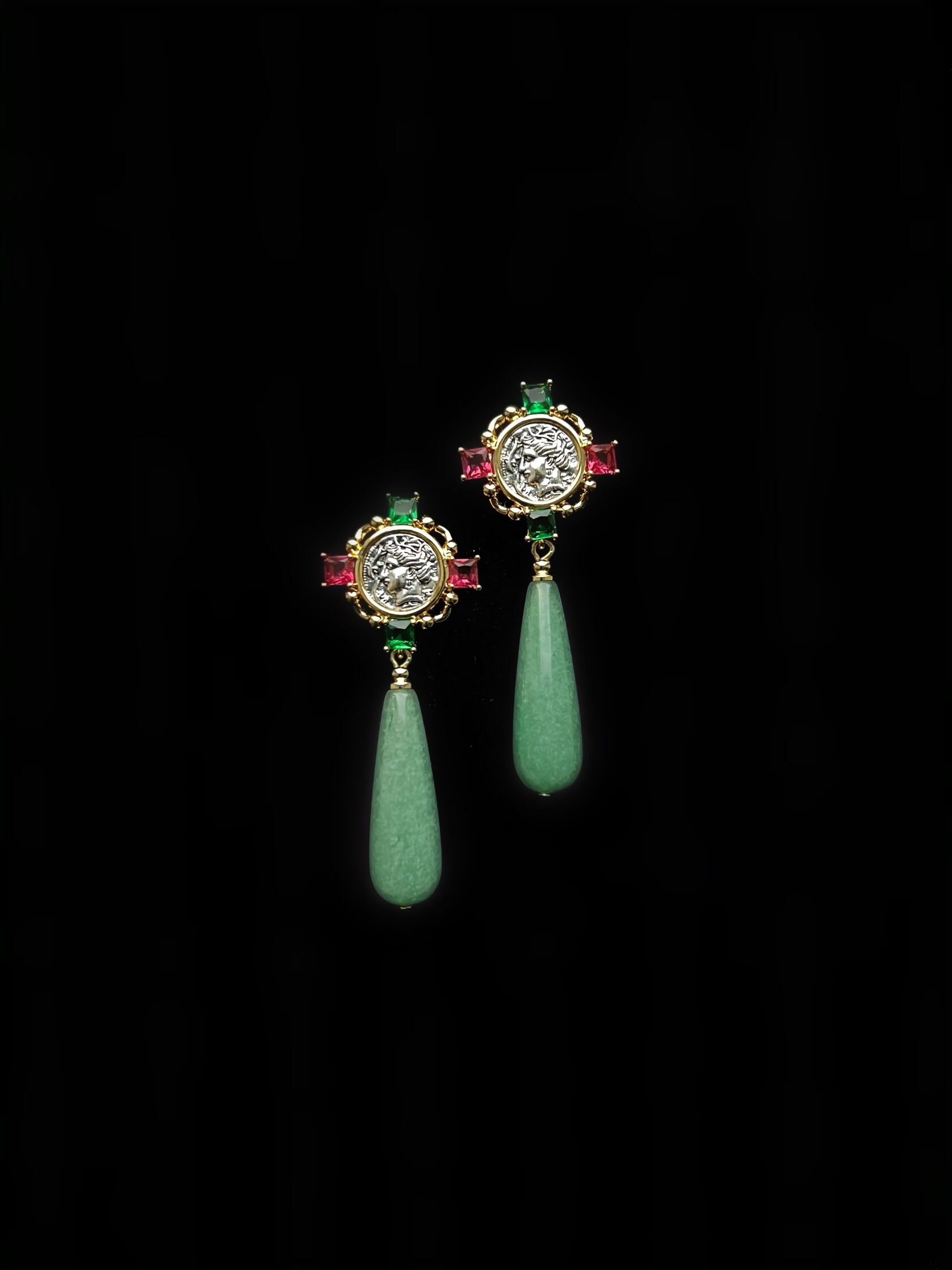 Серьги выполнены в форме античных монет и дополнены каплями-подвесками зеленого халцедона.