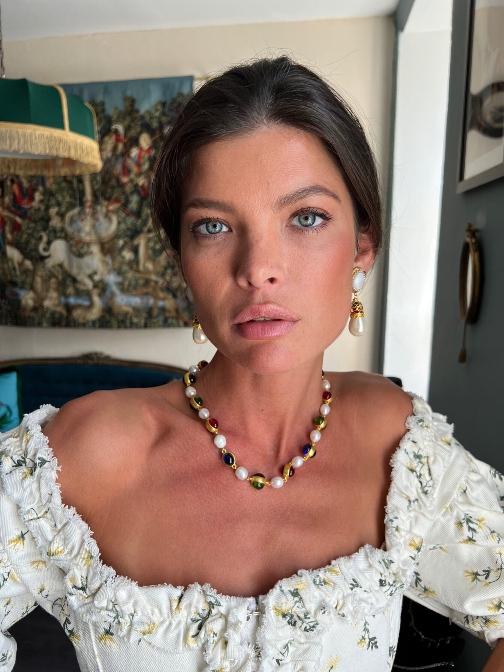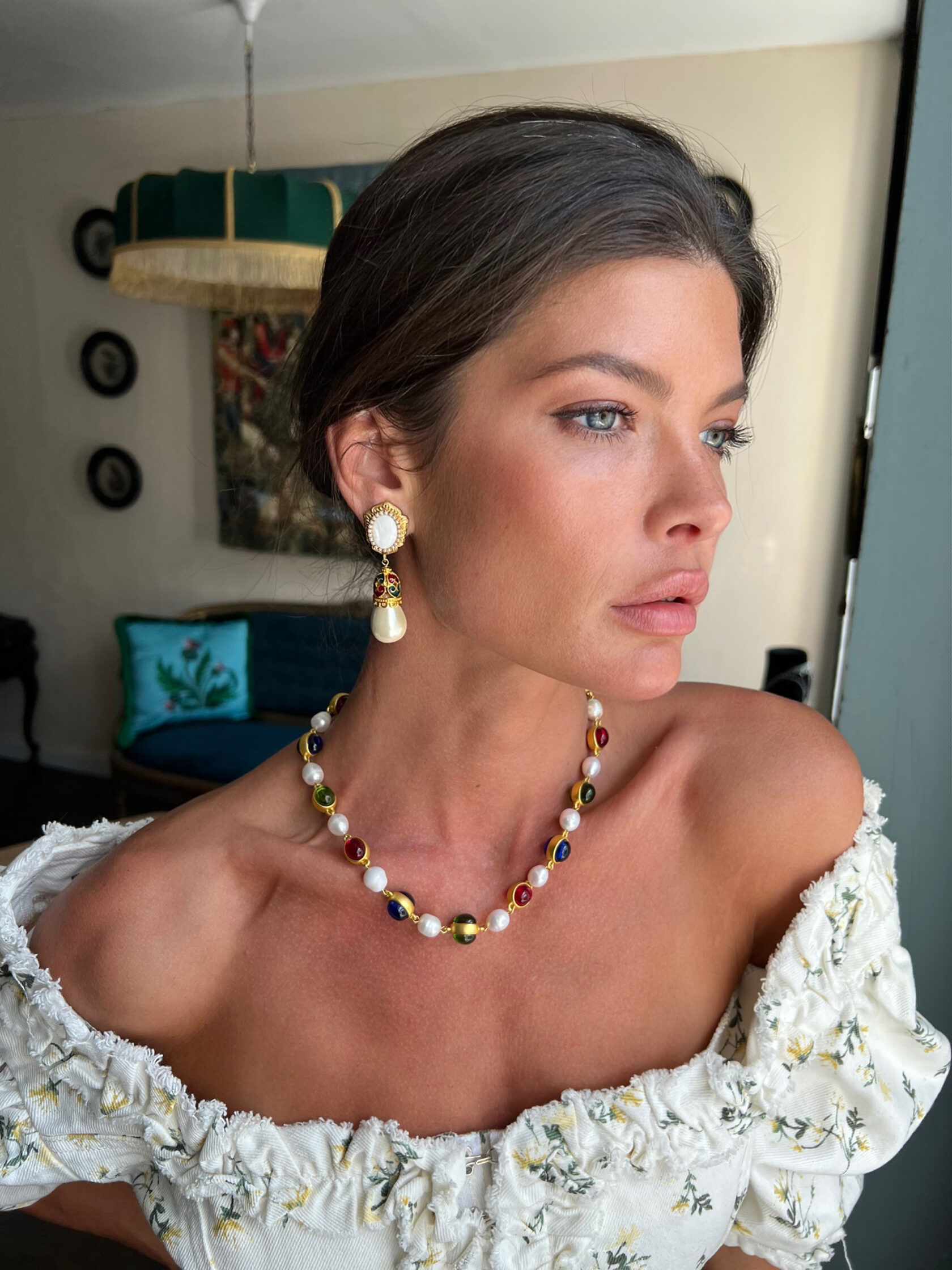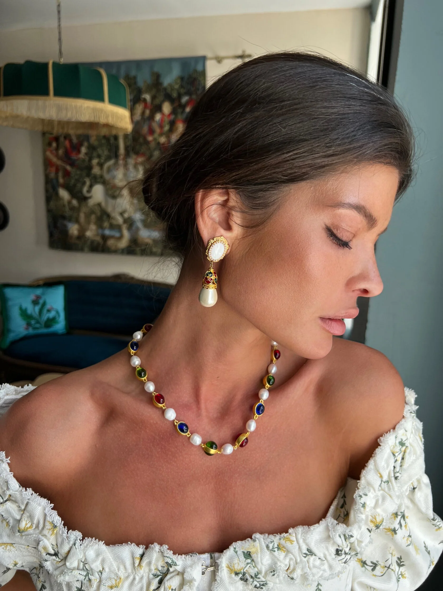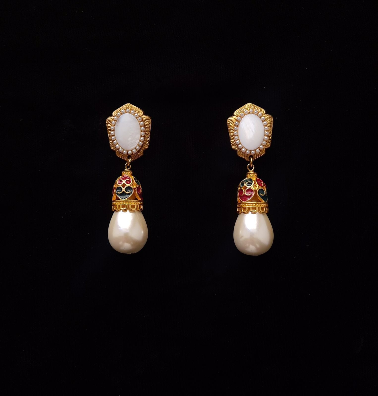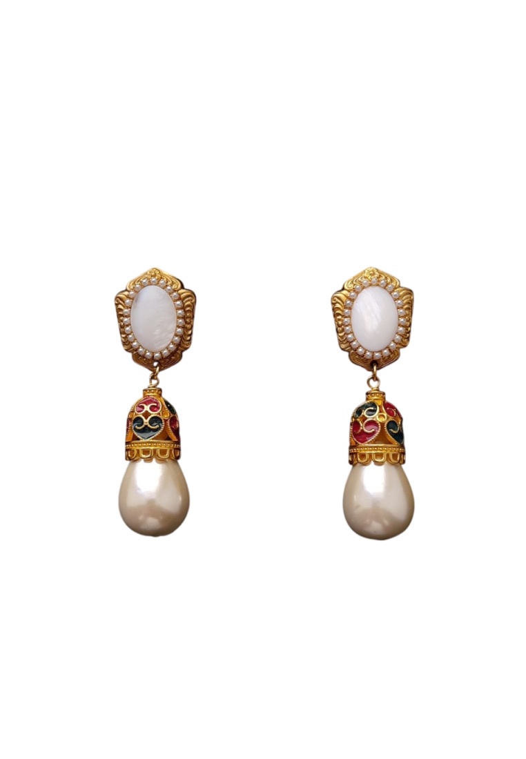 Коктейльные серьги украшены кабошонами натурального перламутра, цветной эмалью и каплями жемчуга майорики.