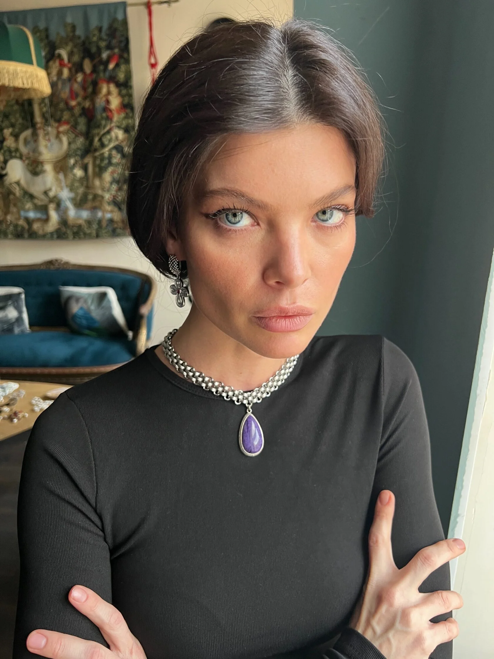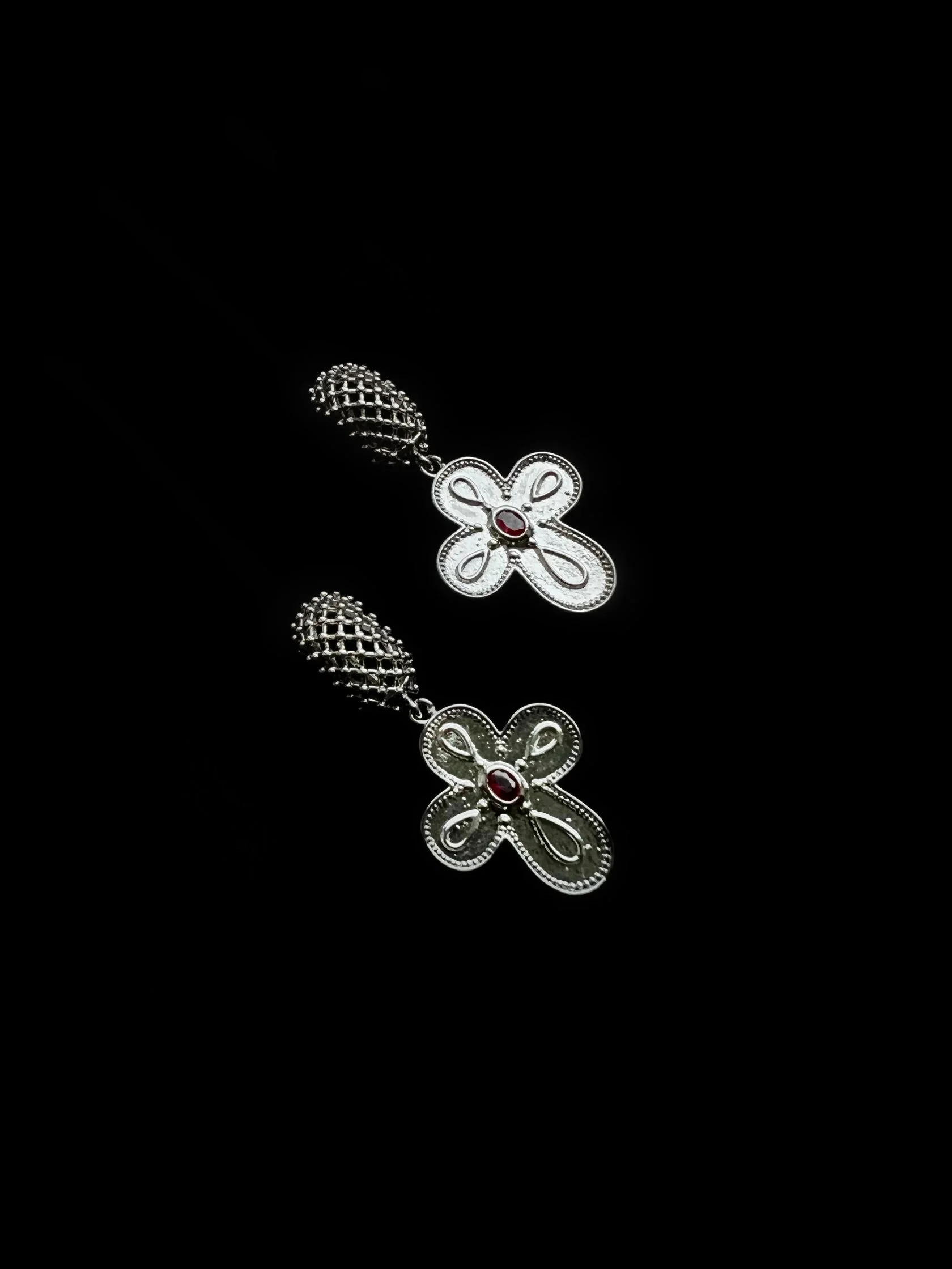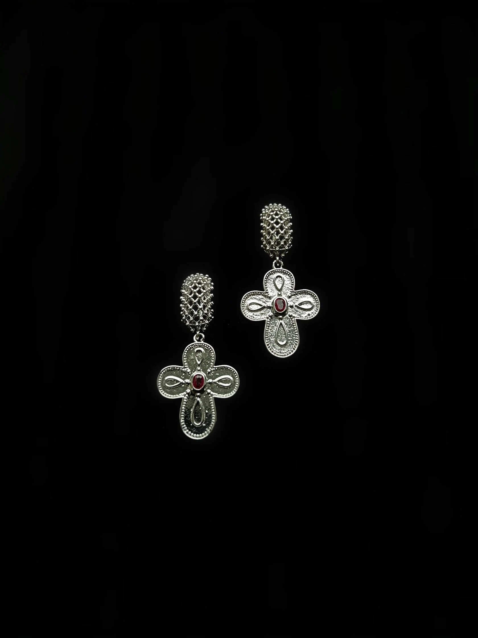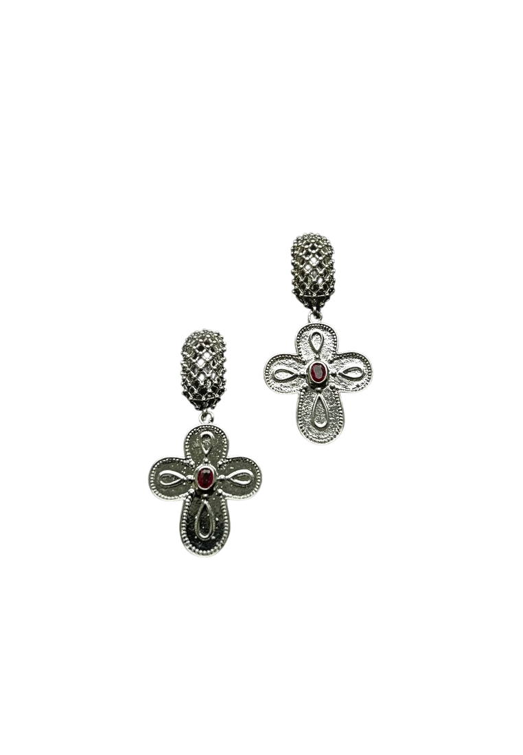 Акцентные крупные (но легкие) серьги украшены декоративными подвесками в видец барочных крестов с кристаллами «Swarovski». Английский замок