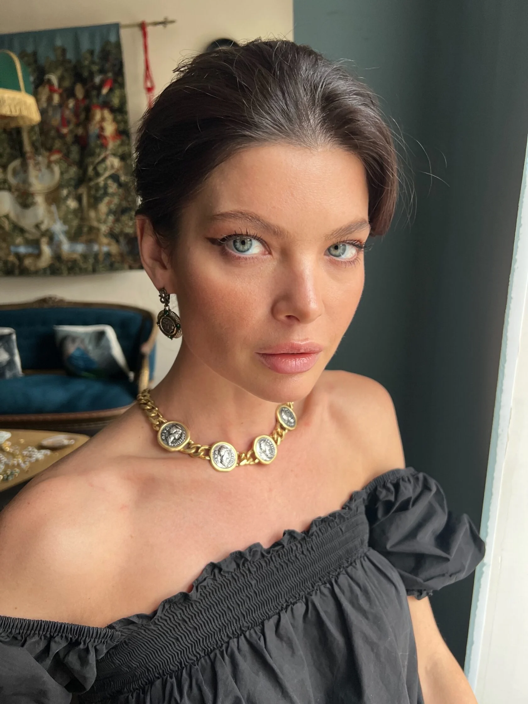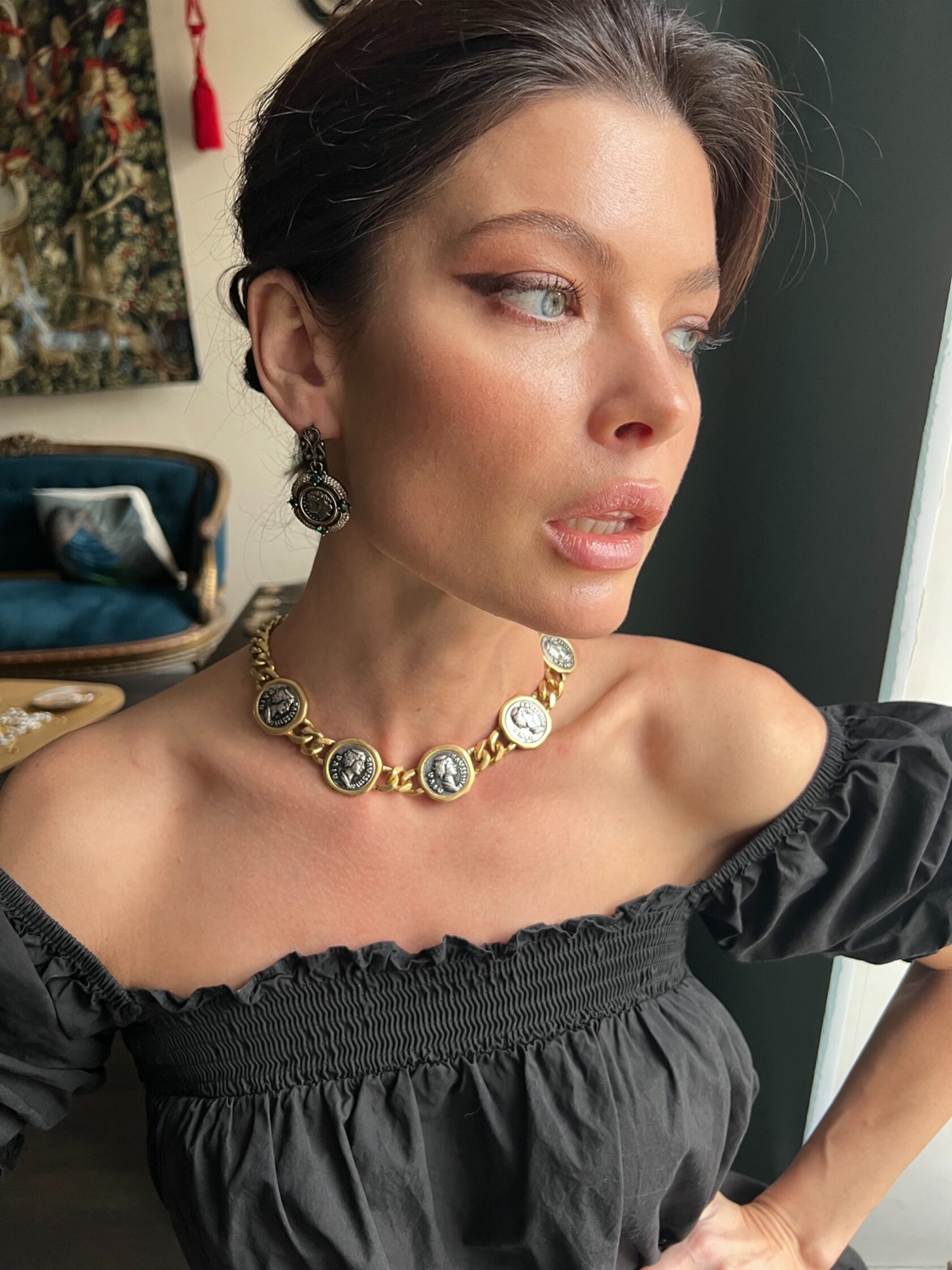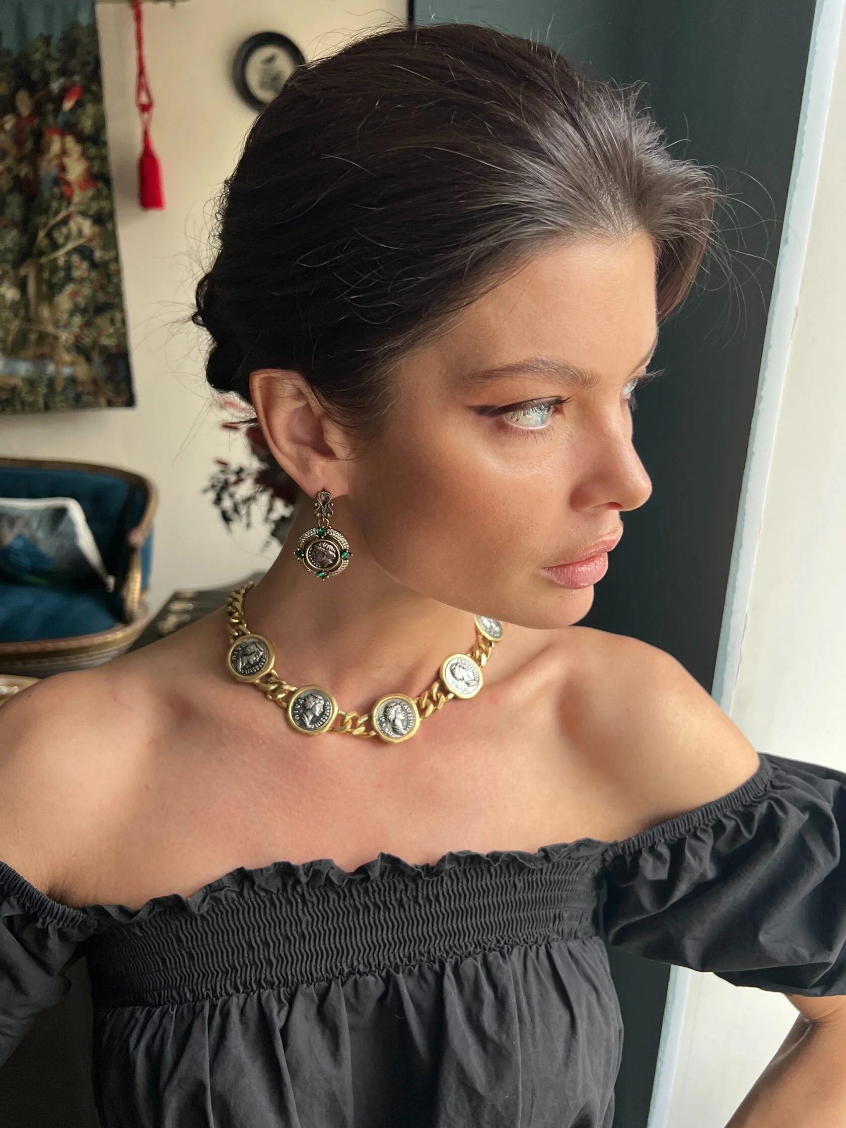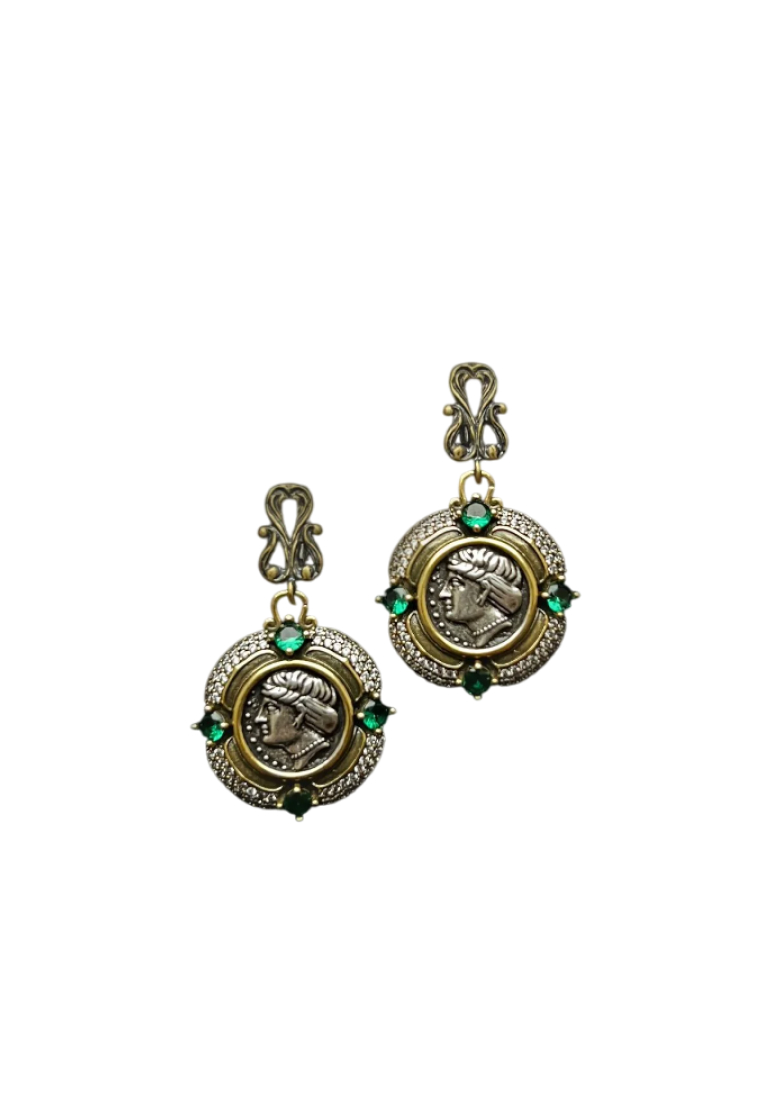 Серьги украшены подвесками в виде реплики античных монет с вставками декоративного стекла. Английский замок