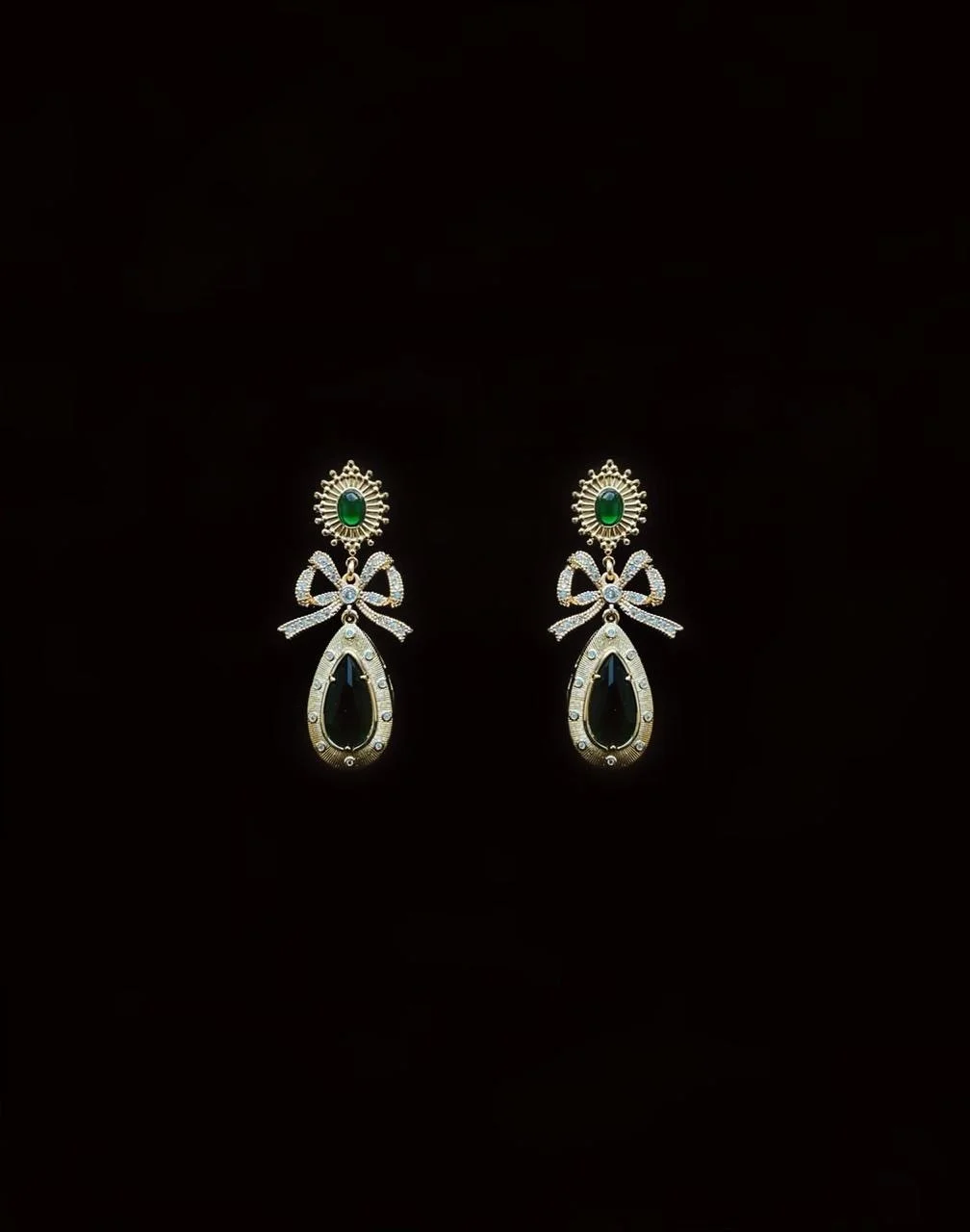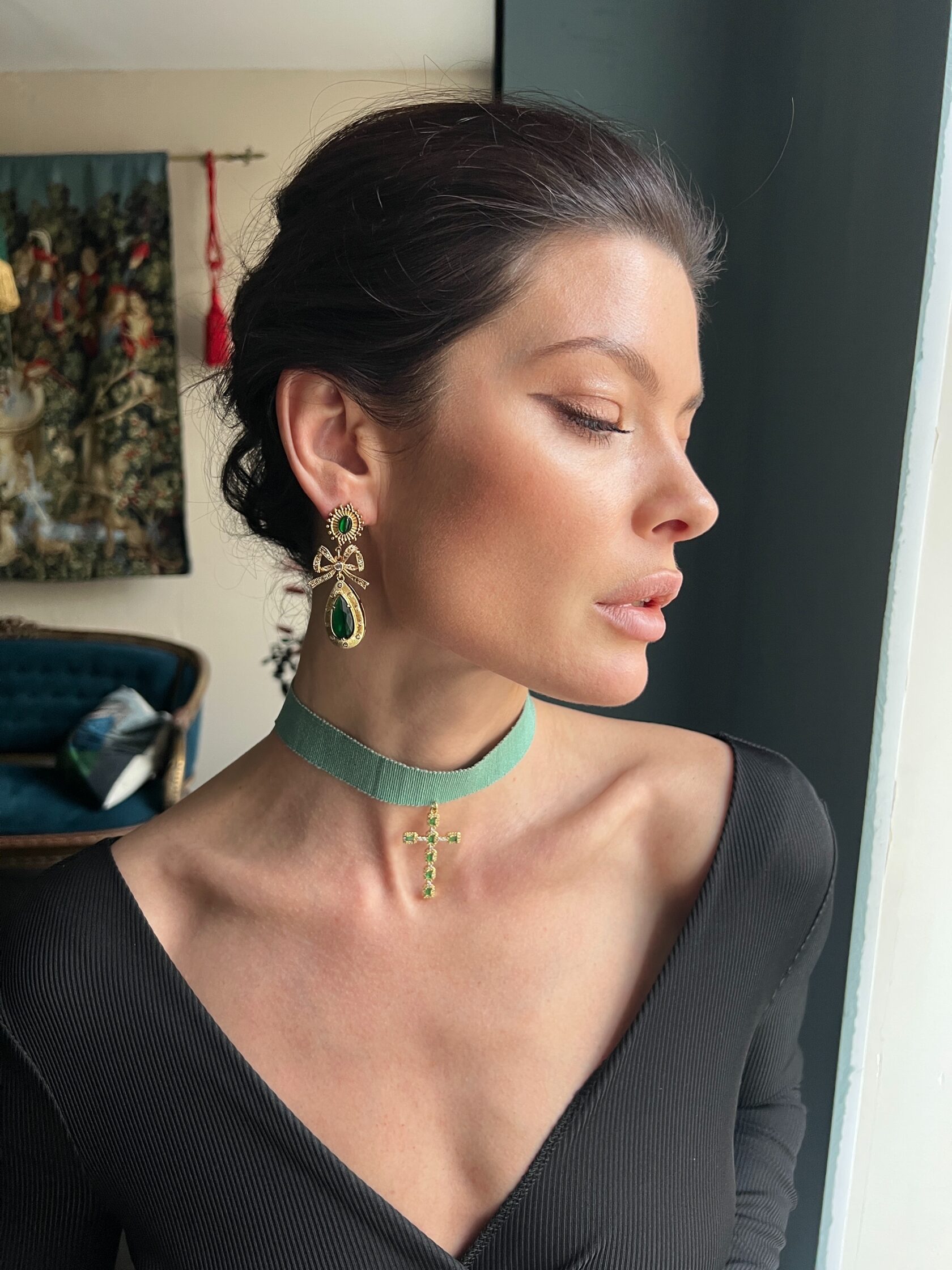 Коктейльные серьги выполнены в геральдическом стиле, украшены кабошонами ювелирного стекла и кристаллами «Swarovski».