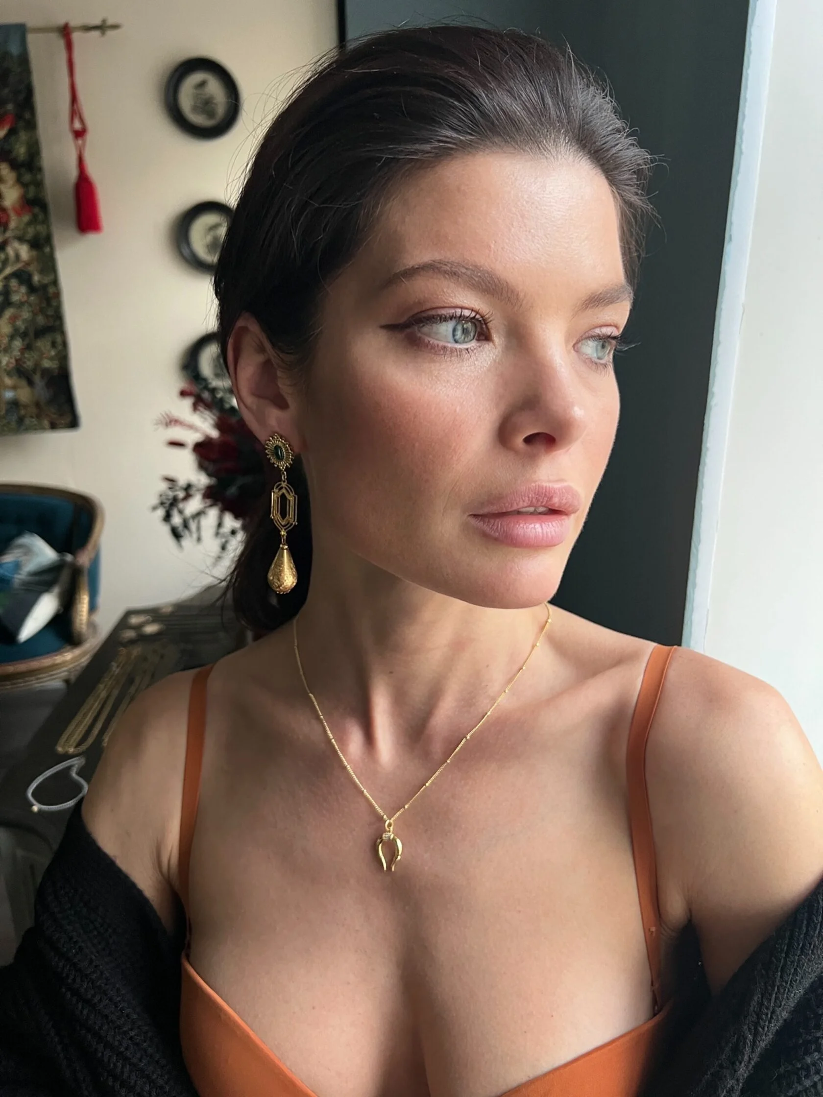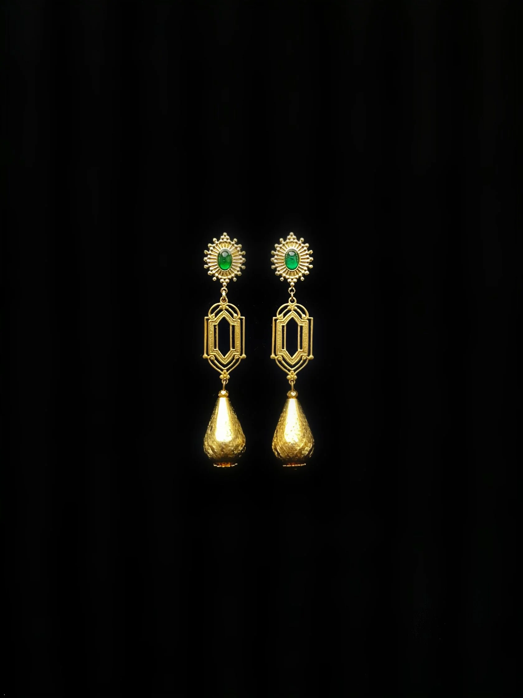 Утонченные серьги выполнены в неославянском стиле, украшены кабошонами декоративного стекла и изящными каплями-подвесками.