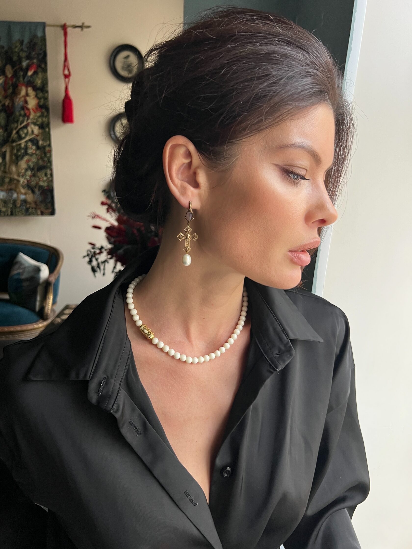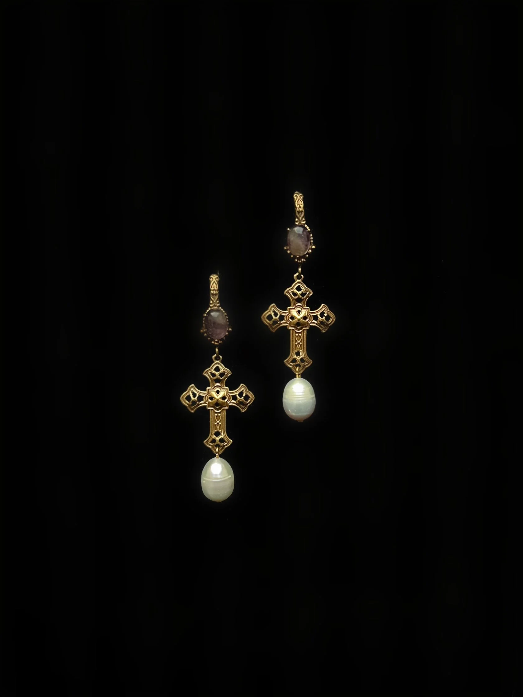 Серьги выполнены в неославянском стиле, украшены природными аметистами, декоративными крестами и натуральным жемчугом. Английский замок