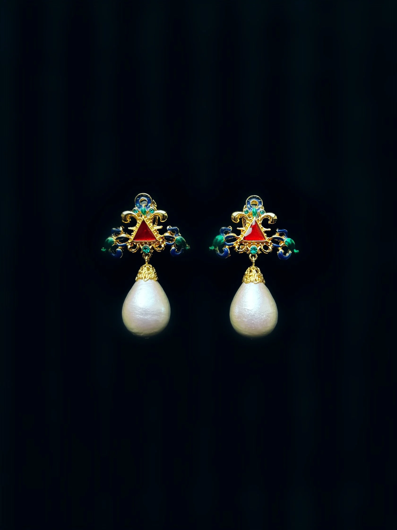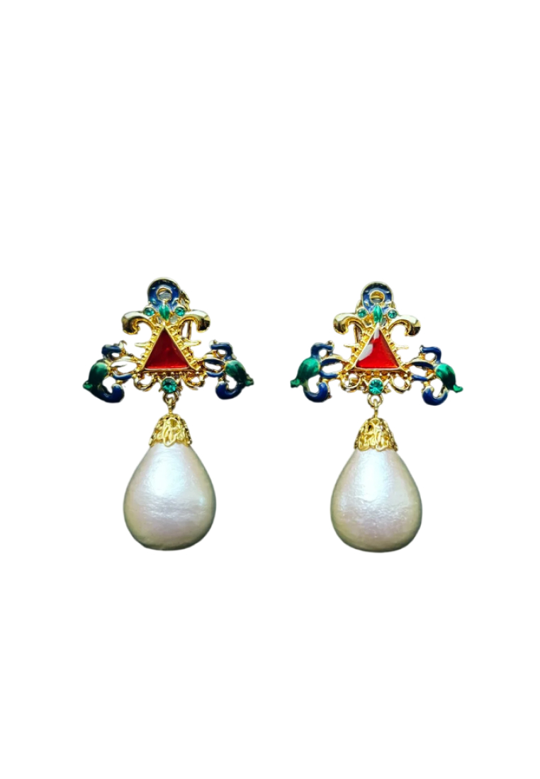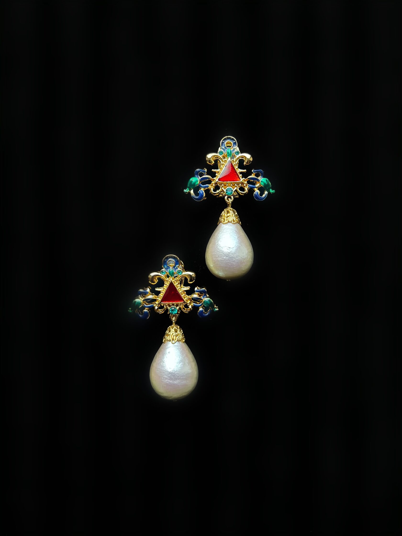 Барочные серьги украшены цветной горячей эмалью и дополнены подвесками хлопкового жемчуга.