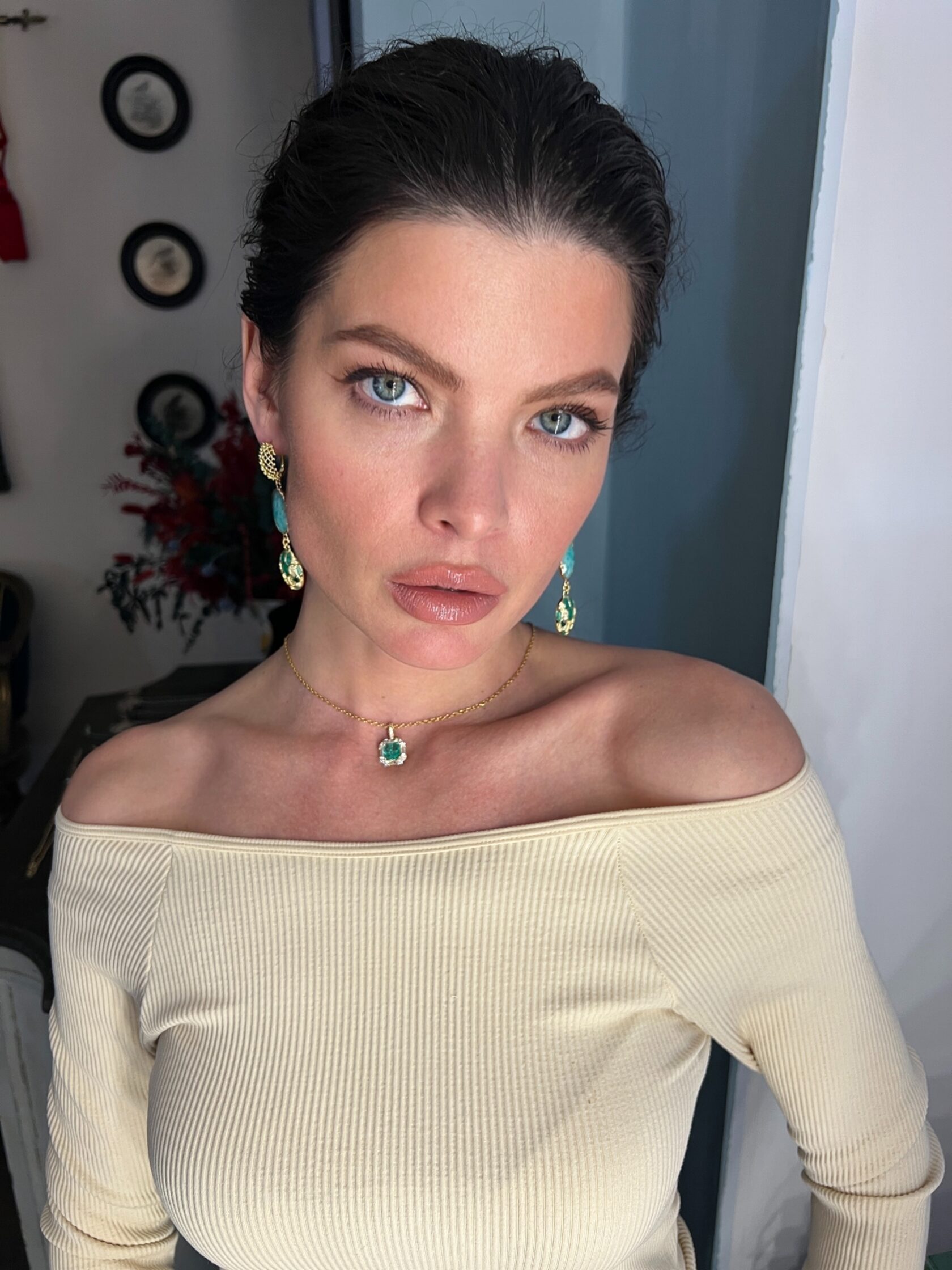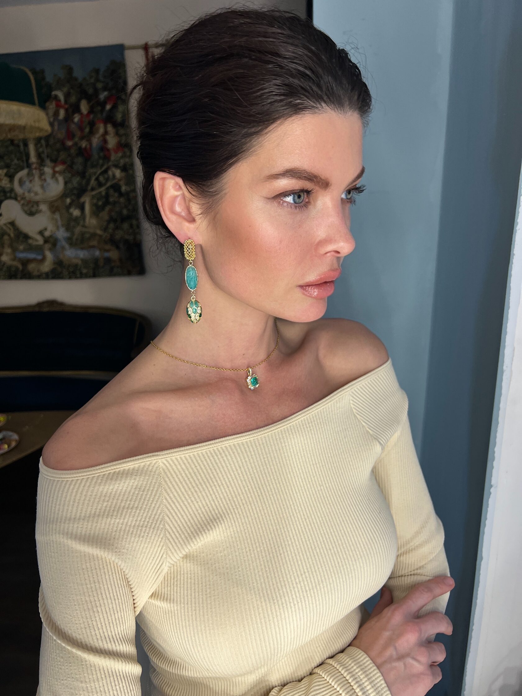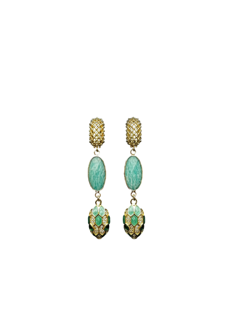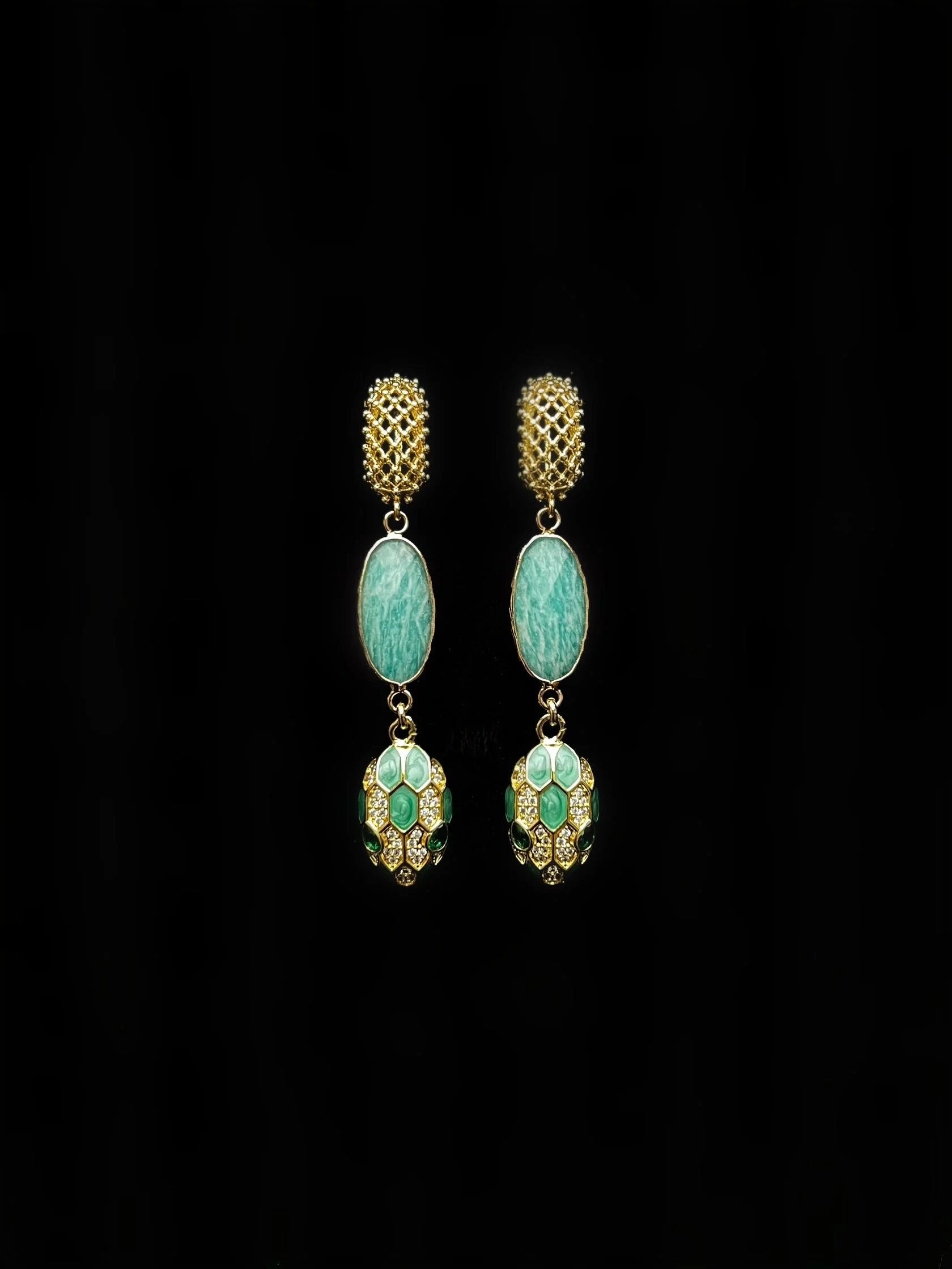 Коктейльные серьги украшены вставками природного амазонита и декорированы подвесками в форме голов змей с цветной перегородчатой эмалью. Английский замок