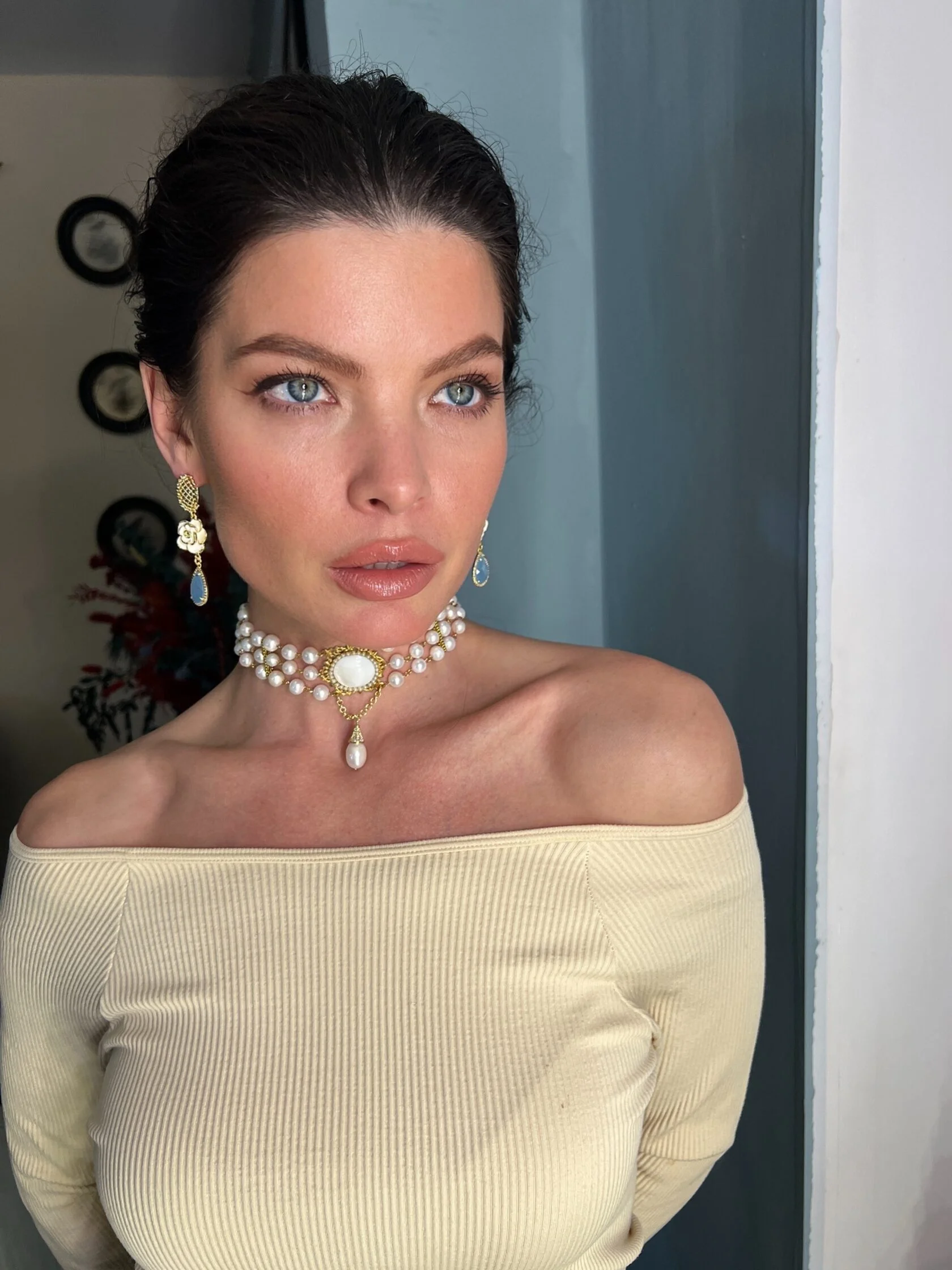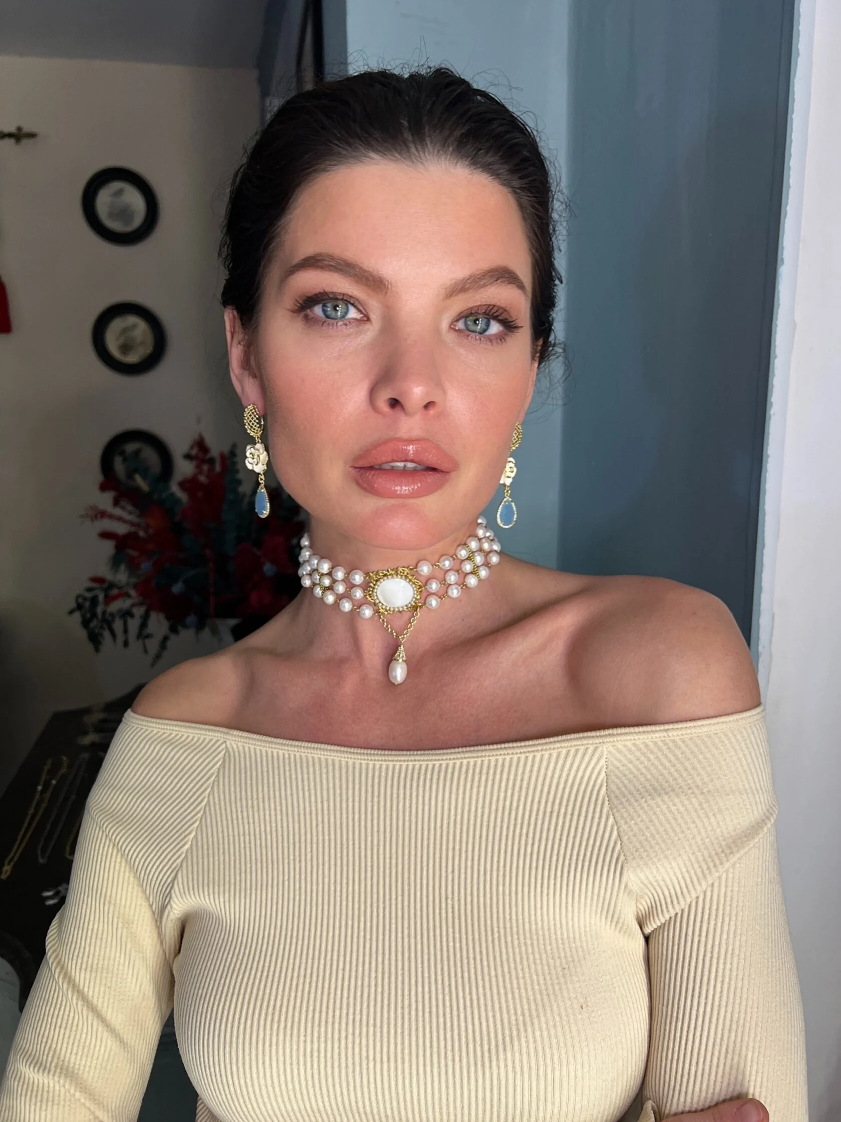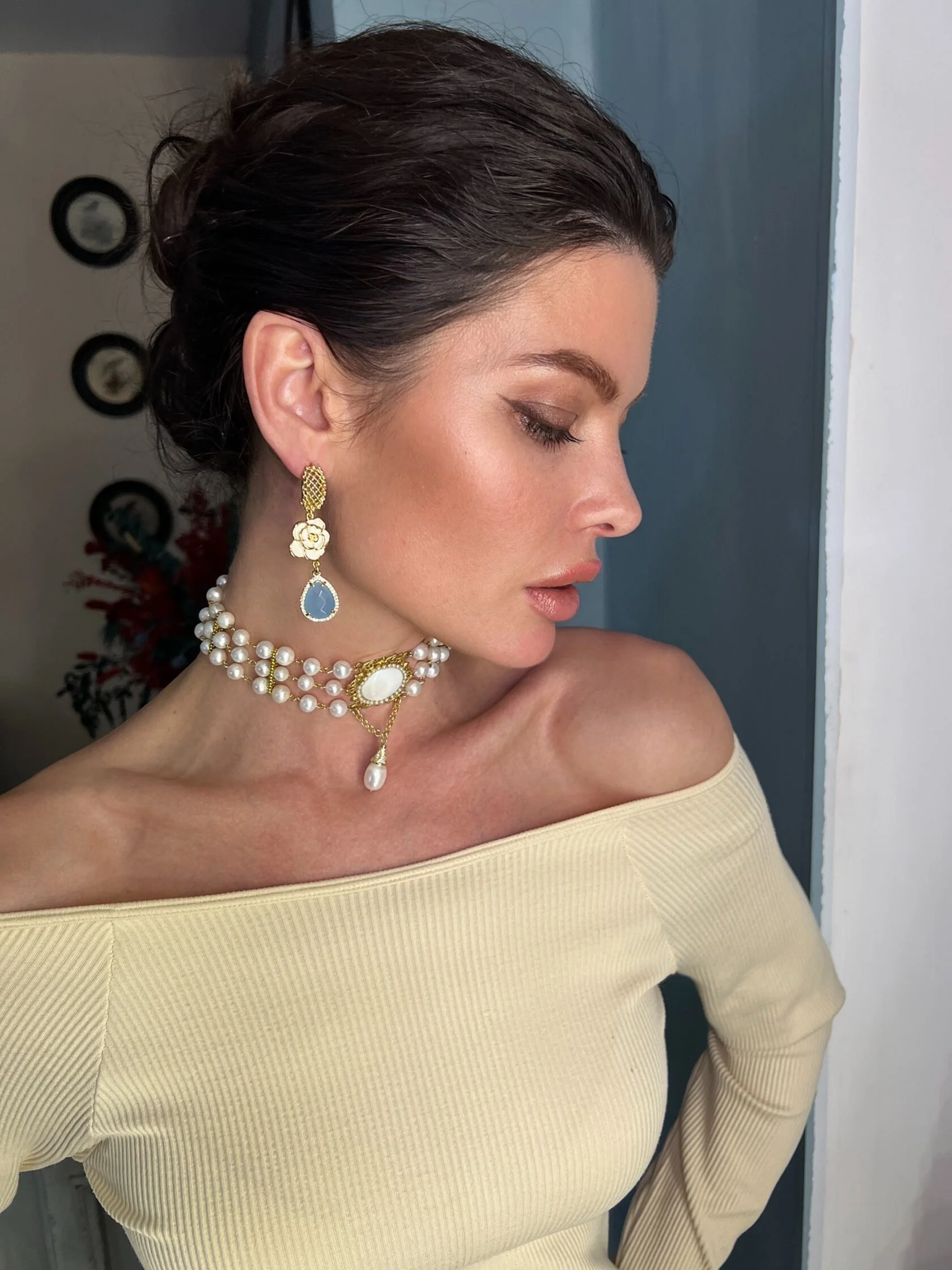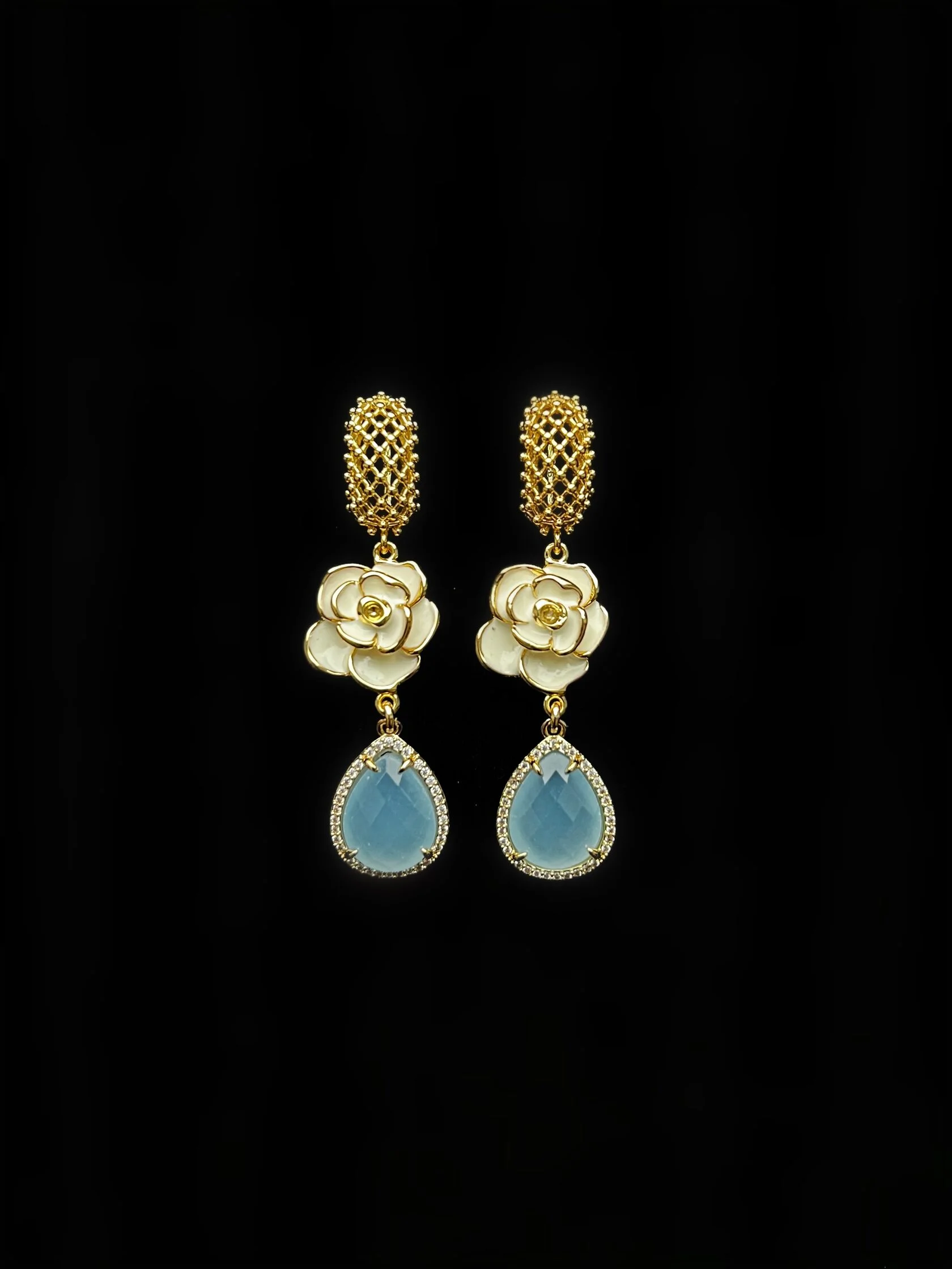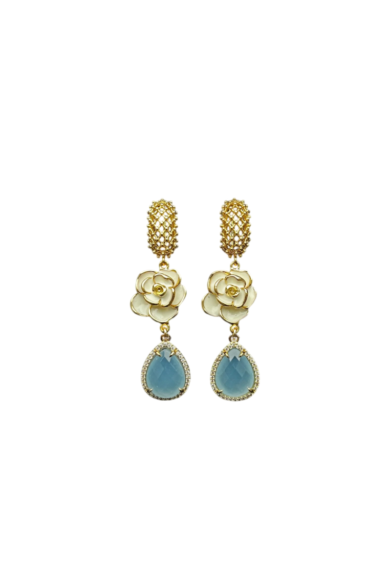 Коктейльные серьги украшены декоративными вставками в виде камелий с цветной эмалью и дополнены каплями-подвесками ювелирного стекла.
