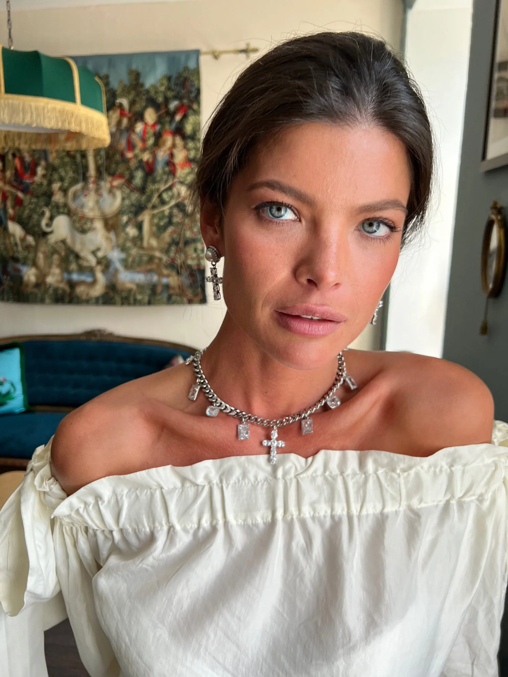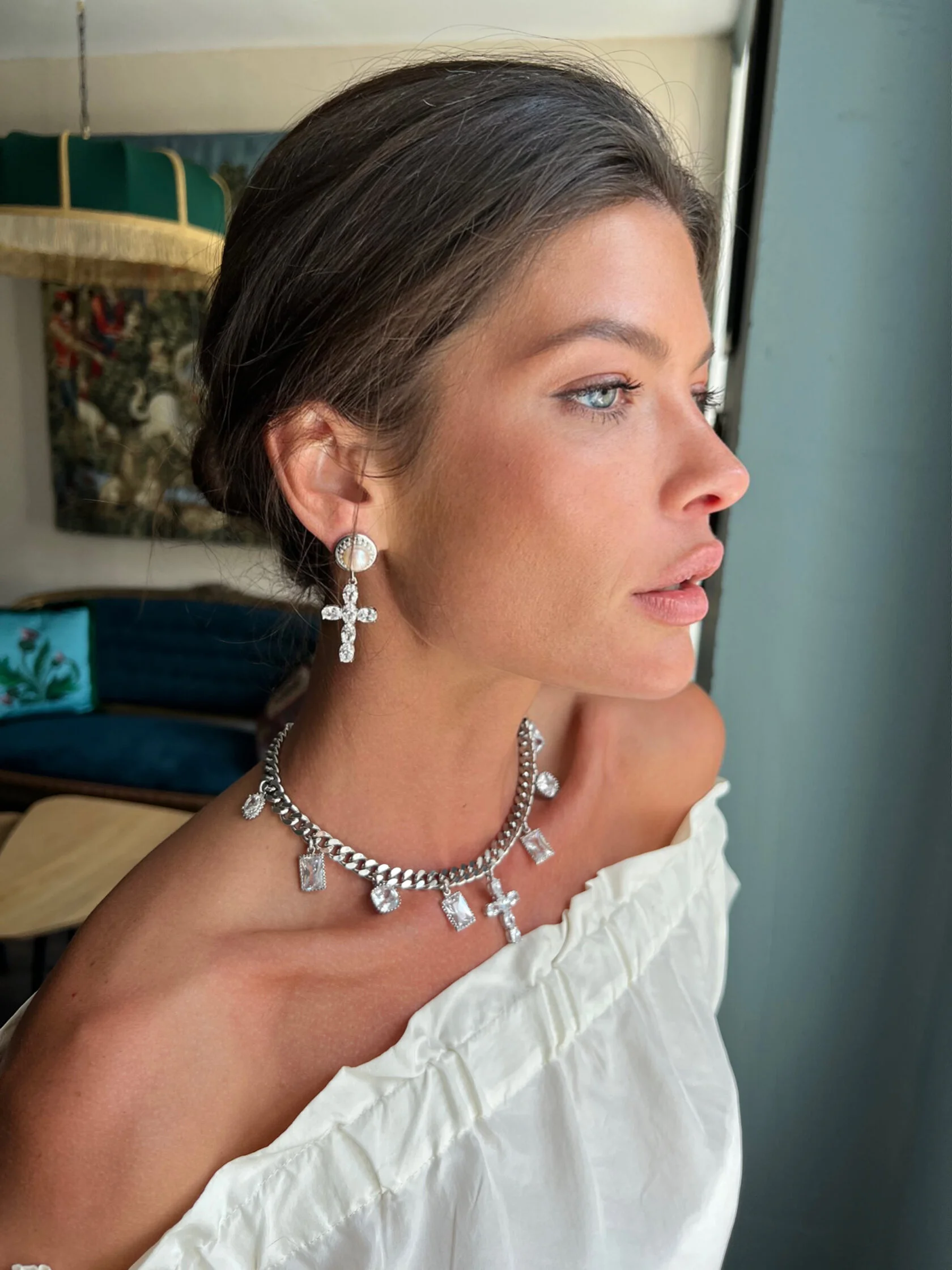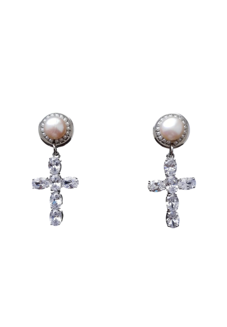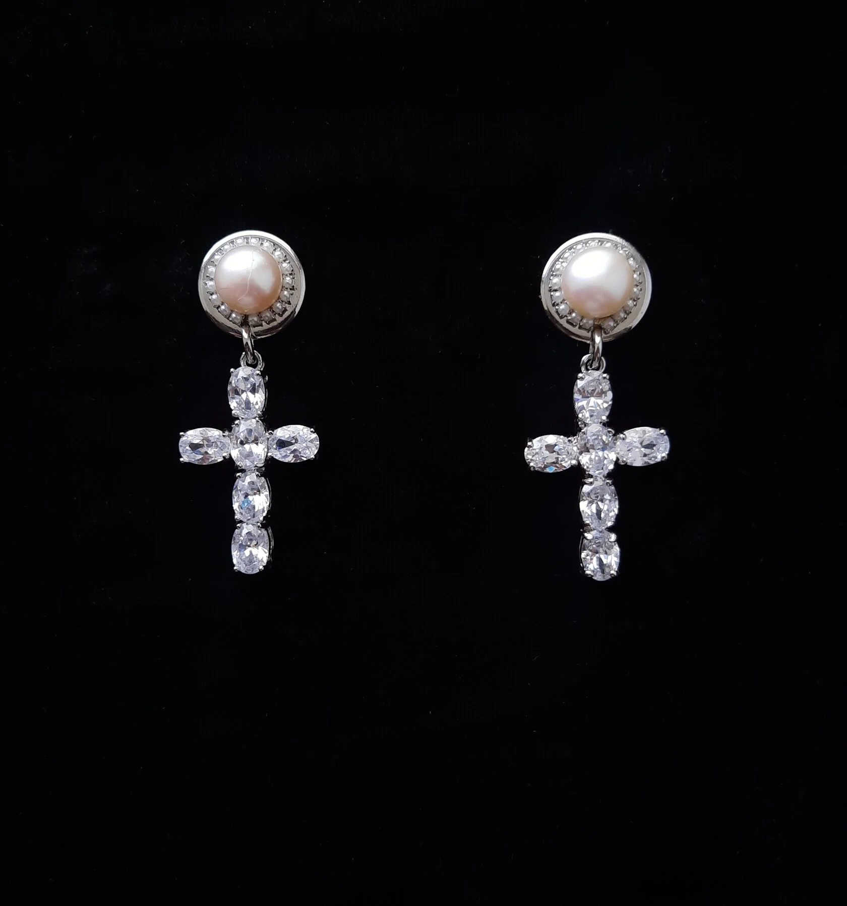 Акцентные серьги украшены кабошонами натурального жемчуга и дополнены подвесками декоративных крестов с кристаллами «Swarovski»