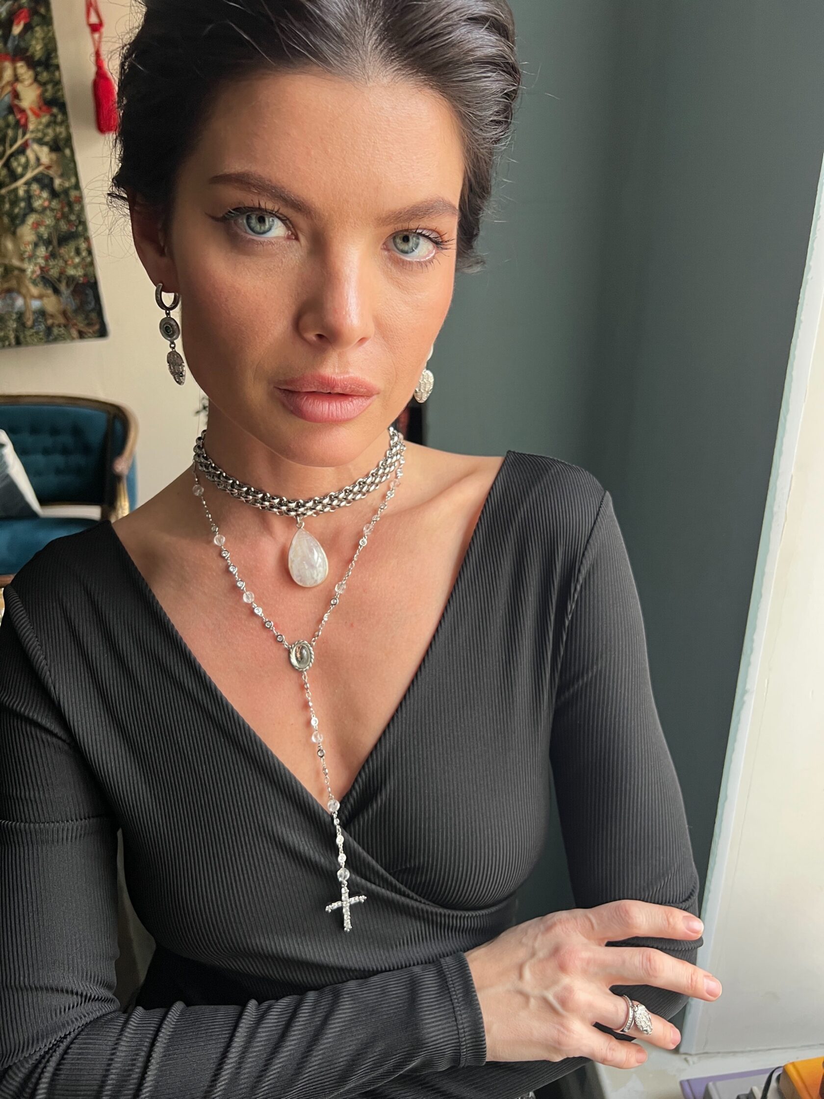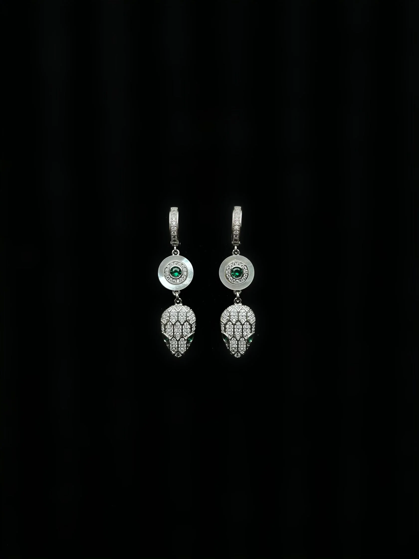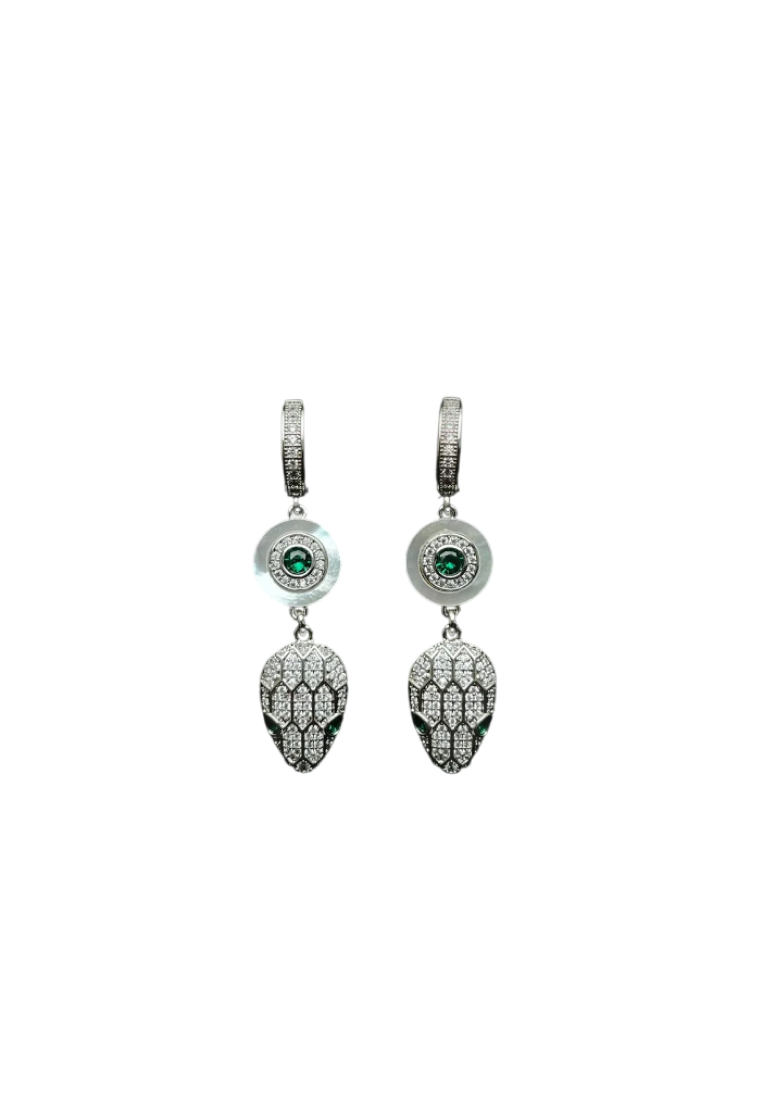Коктейльные серьги украшены вставками натурального перламутра и дополнены декоративными подвесками в виде змей. Английский замок