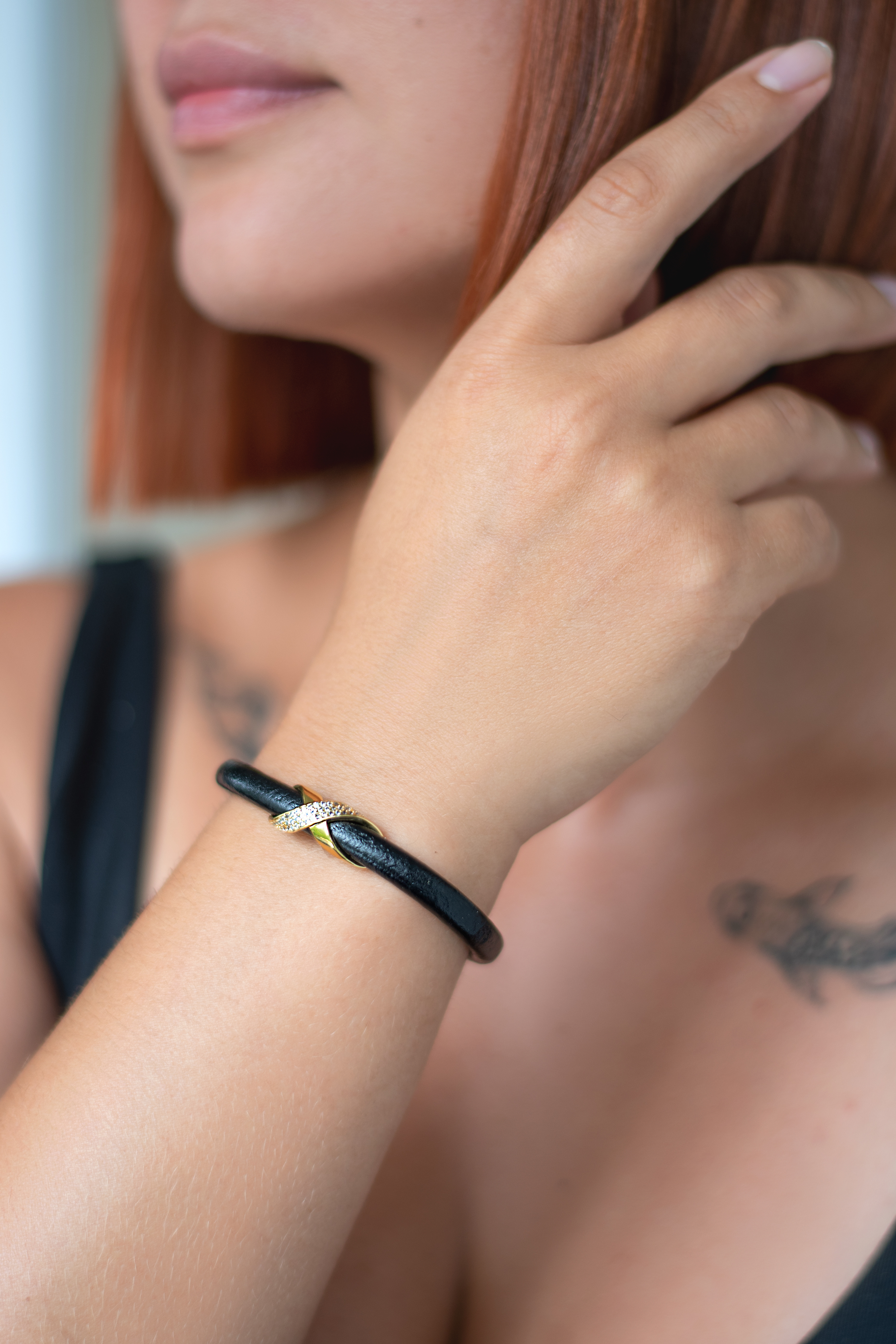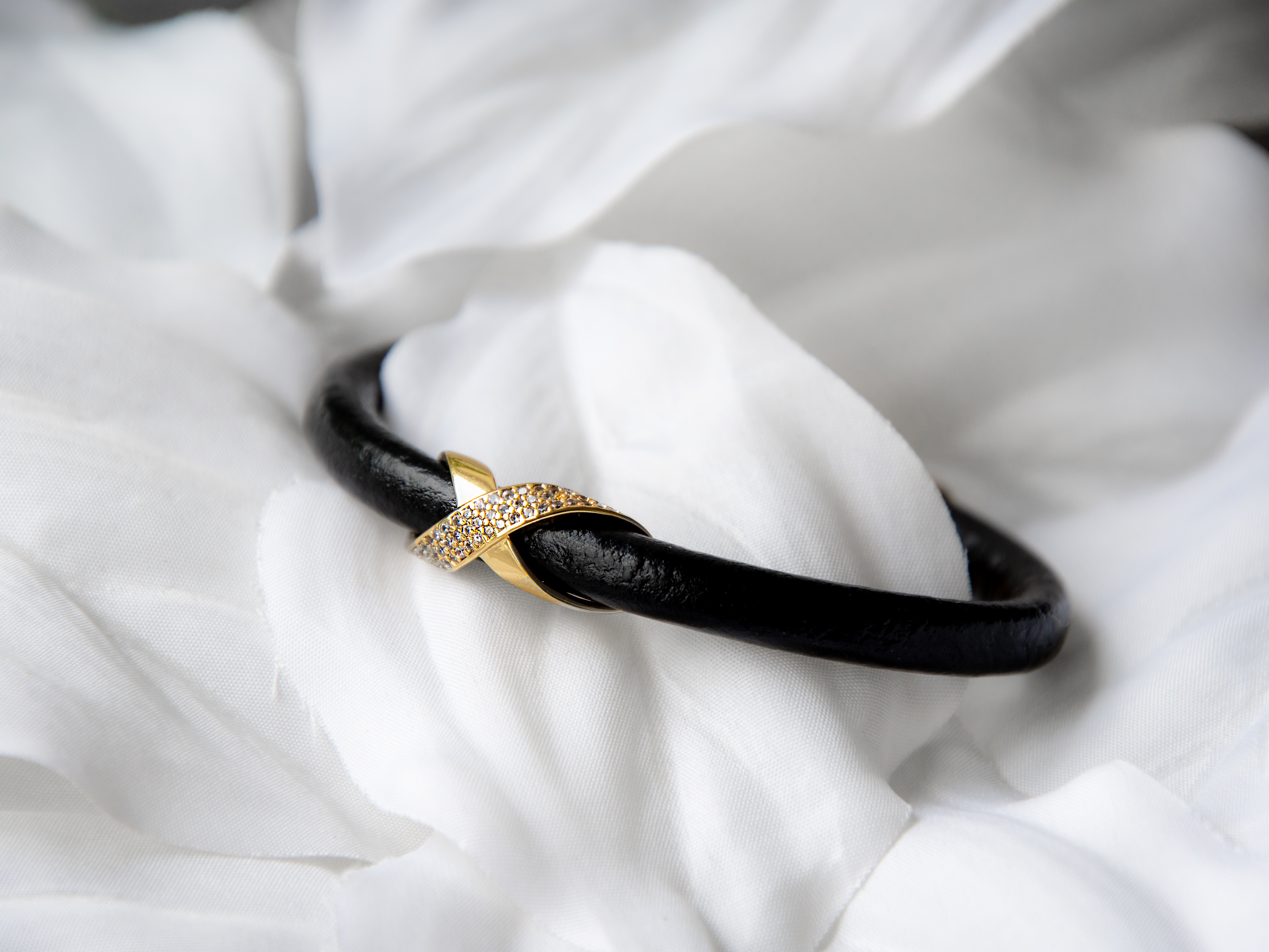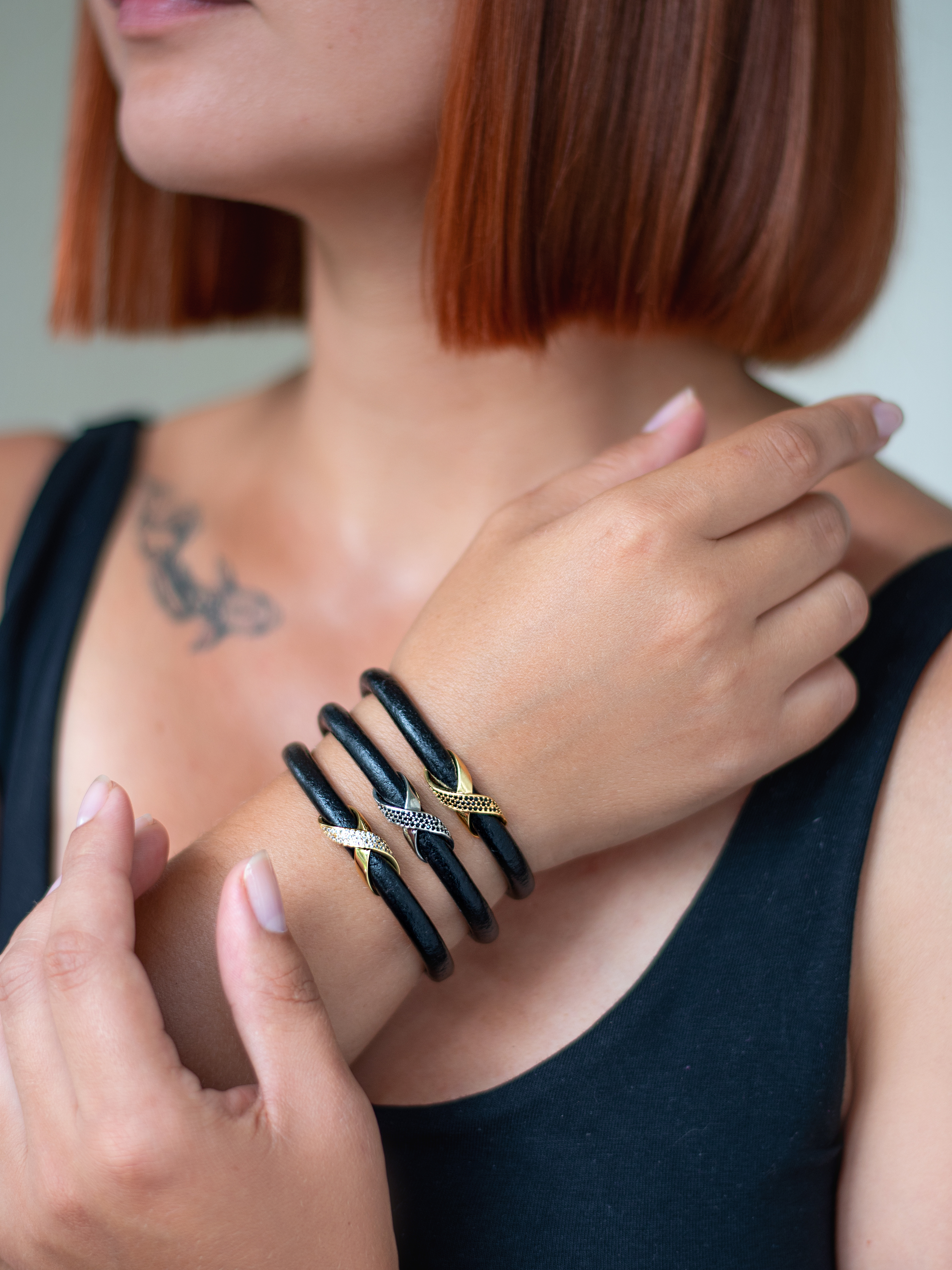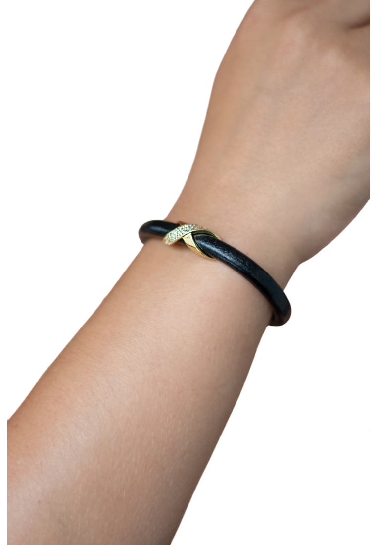 Натуральная кожа, ювелирная сталь, латунь с позолотой 14 карат, кубические микро-цирконы.