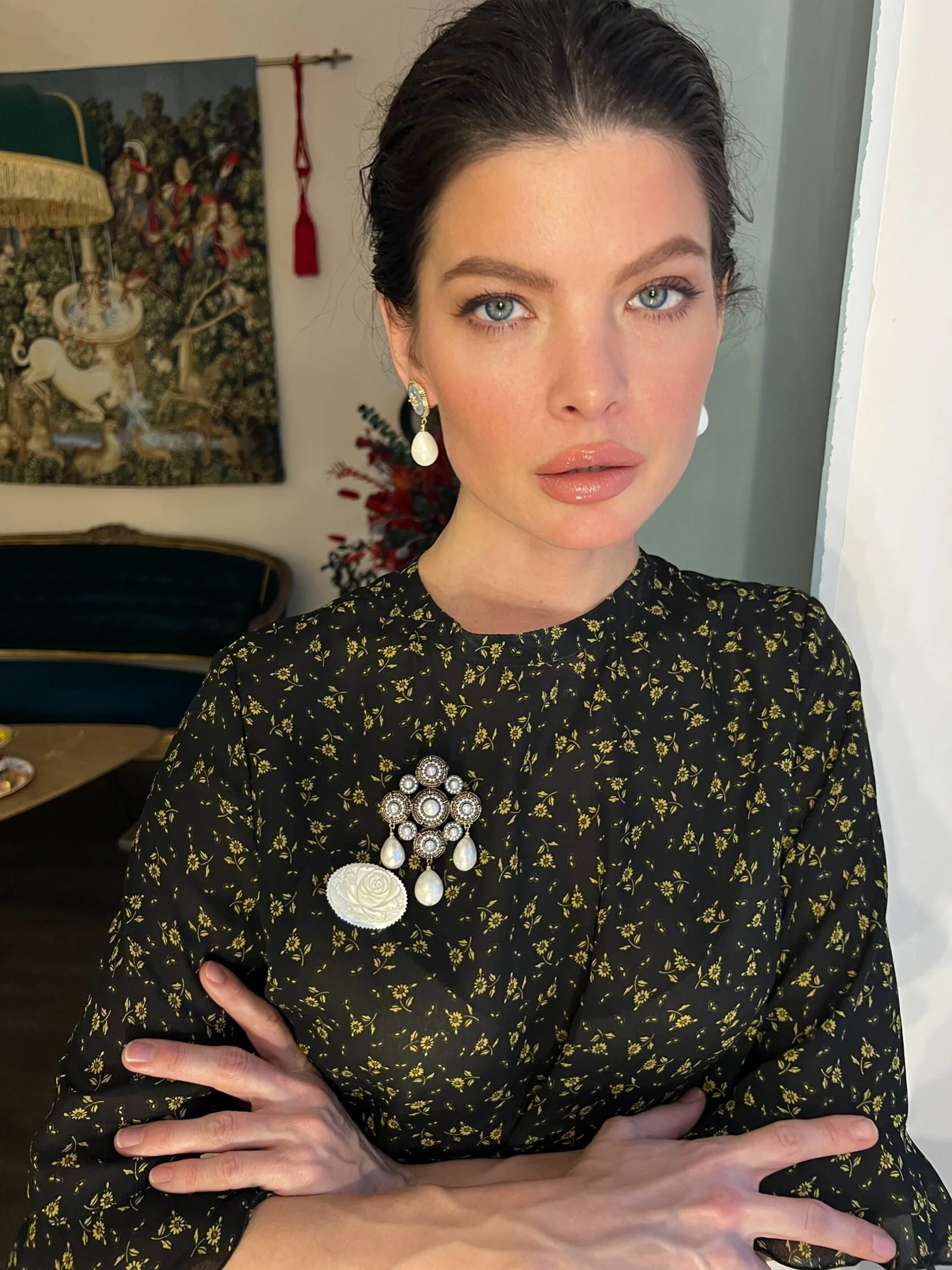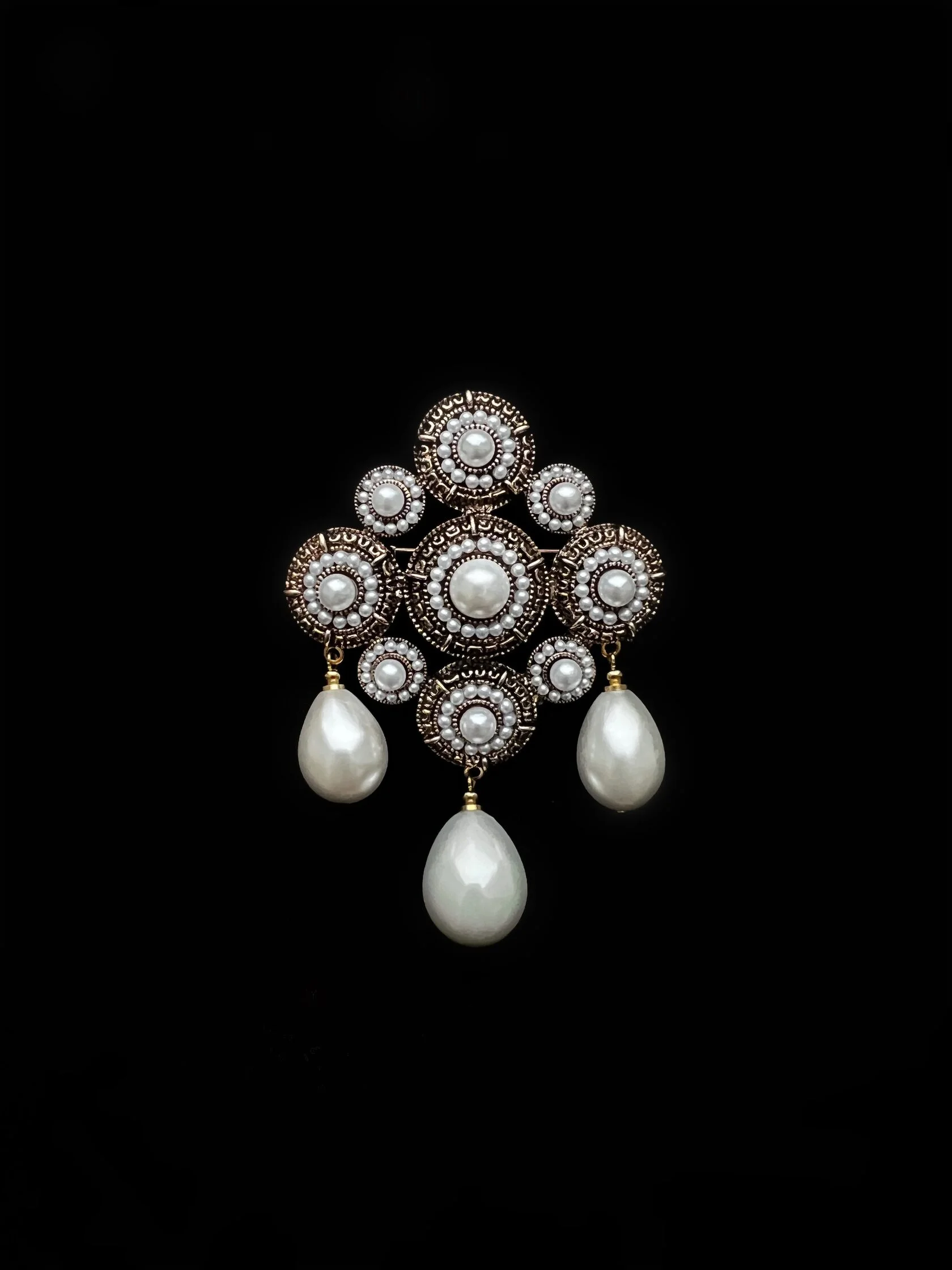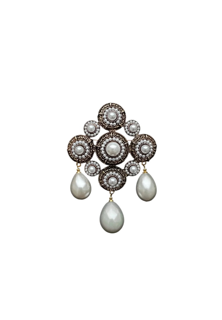 Акцентная брошь выполнена в форме цветка, украшена искусственным жемчугом и дополнена подвесками жемчуга майорки