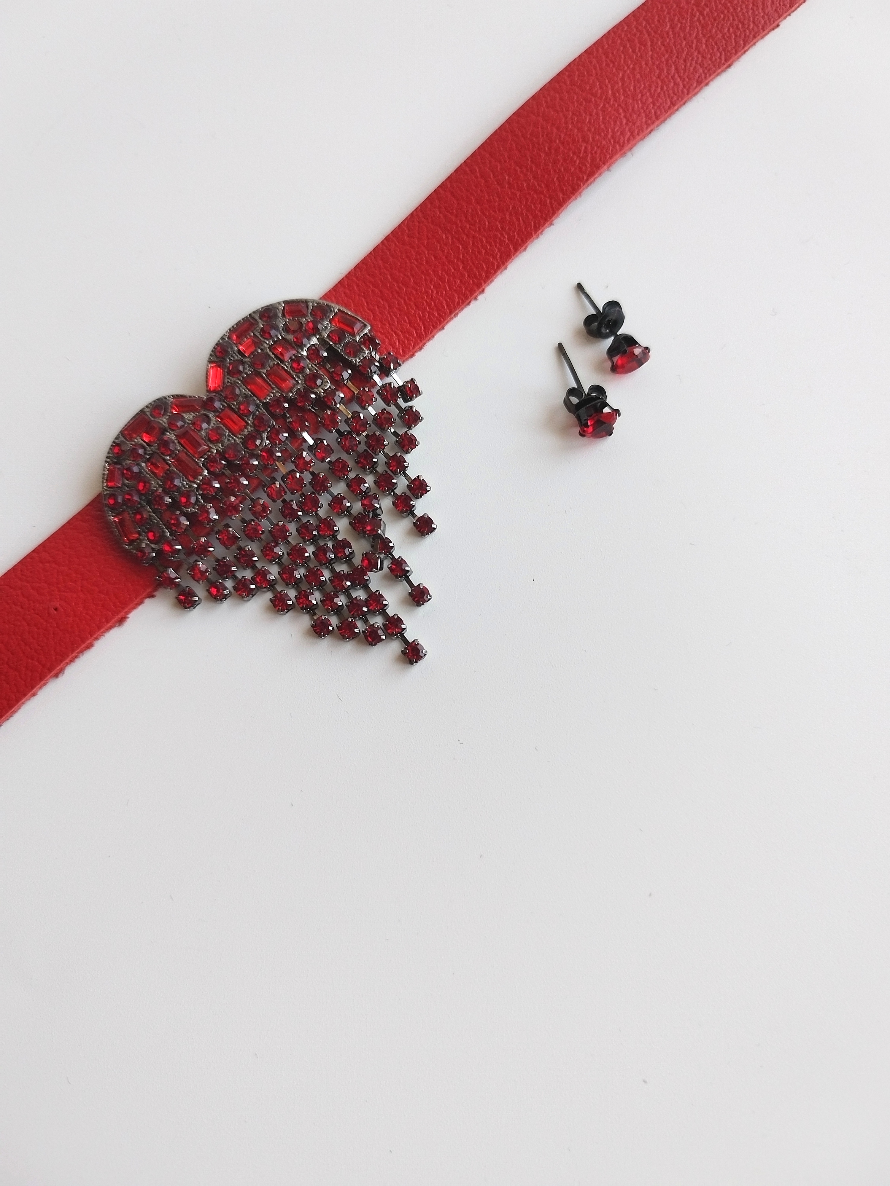 Основа чокера изготовлена из натуральной кожи. Кулон в форме сердца выполнен из бижутерного сплава с гипоаллергенным покрытием. Кулон инкрустирован стразами.