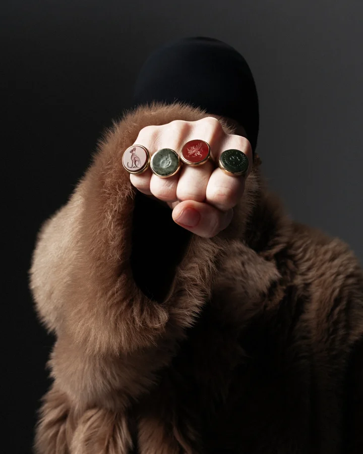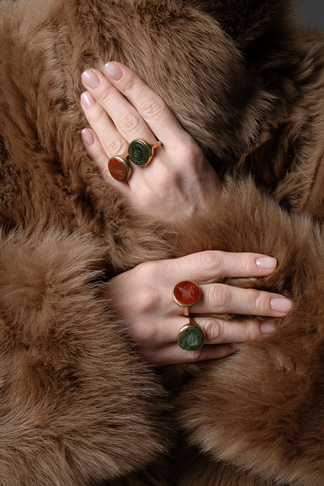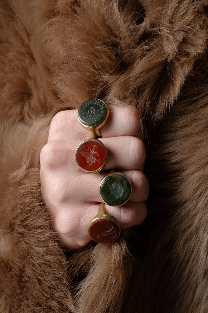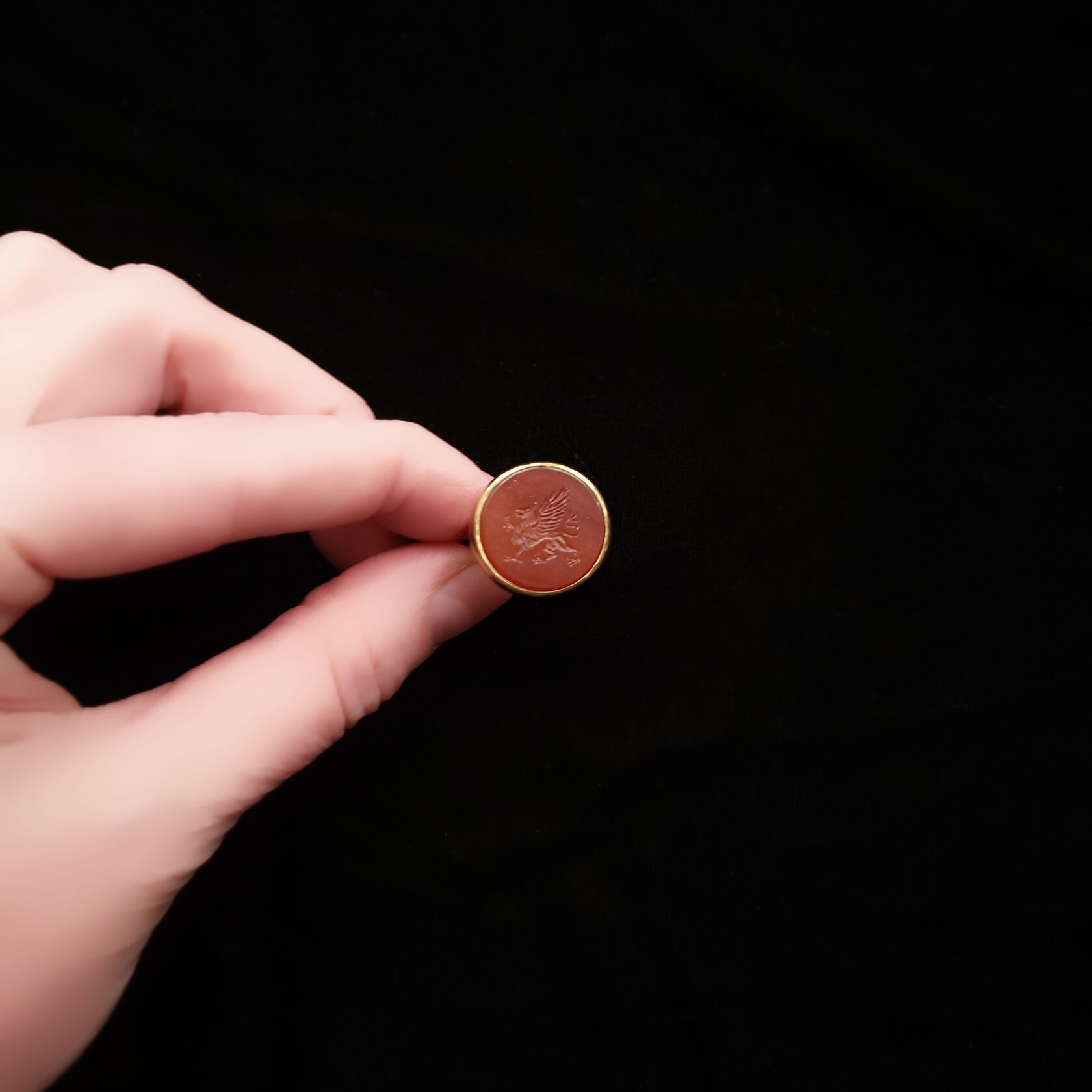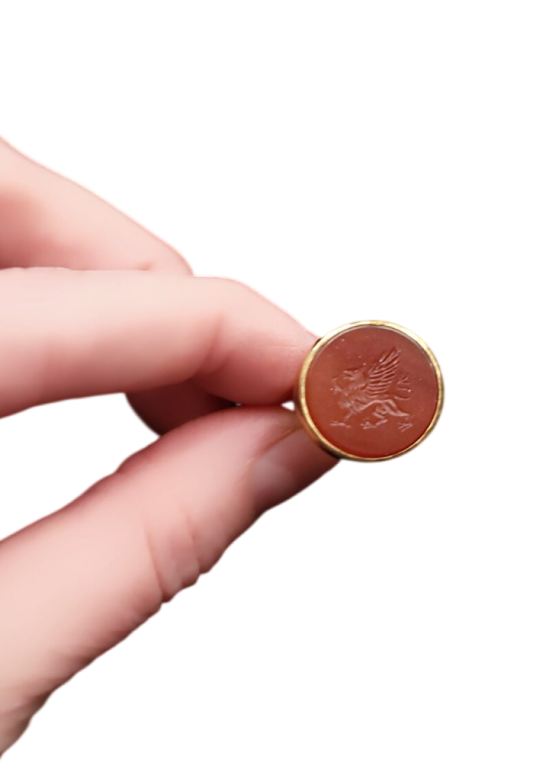Кольцо-перстень выполнен в технике «римских колец» и украшен резной инталией из сердолика с изображением мифического грифона. Размер 18. Сплав: латунь, патинирование