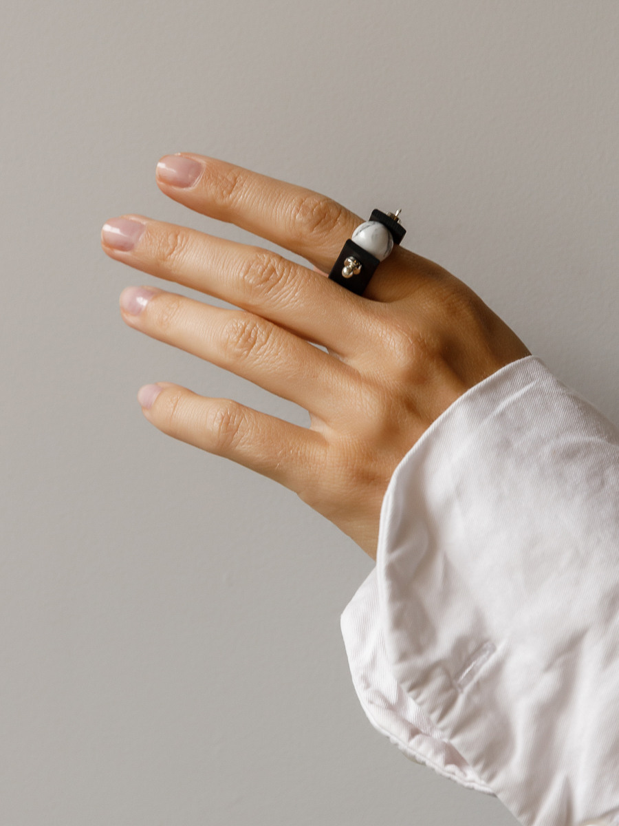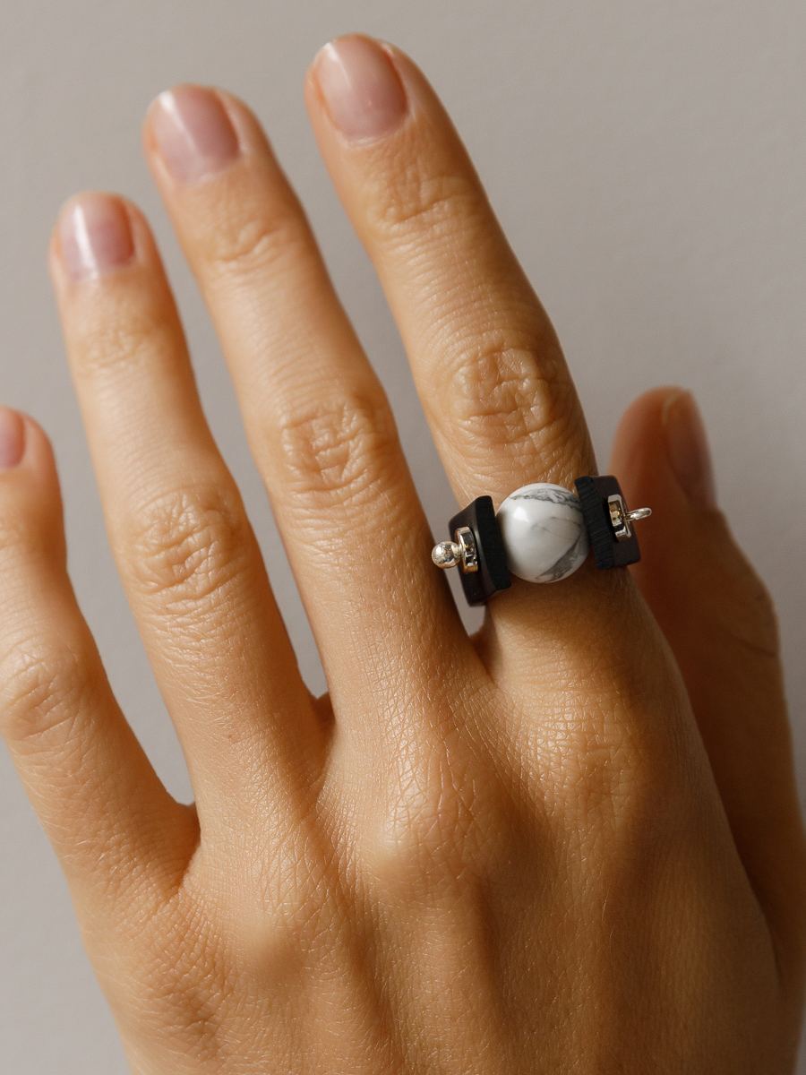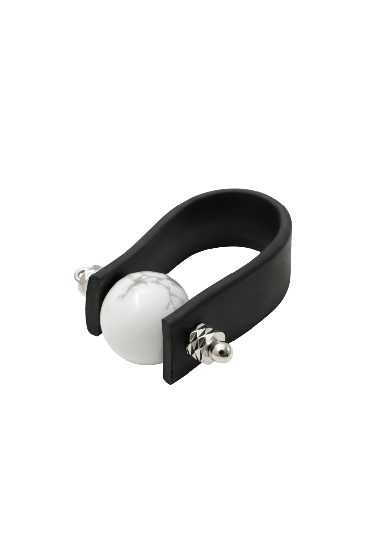 Кольцо с натуральным камнем говлит. Украшение выполнено вручную из черного каучука, натурального камня и латуни с родированием. Кольцо подойдет людям с аллергией на металлы.