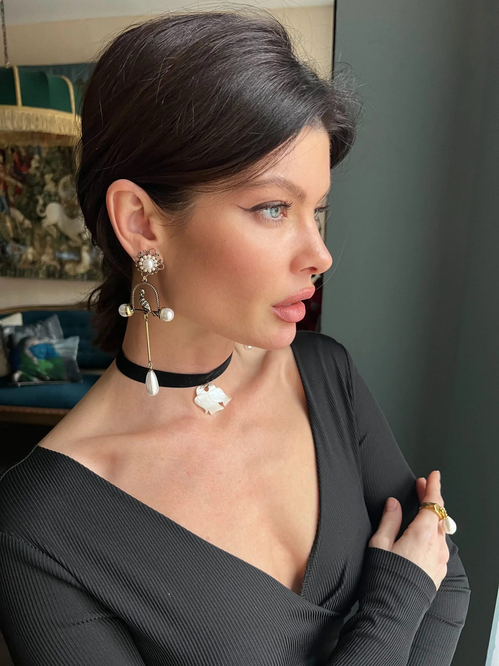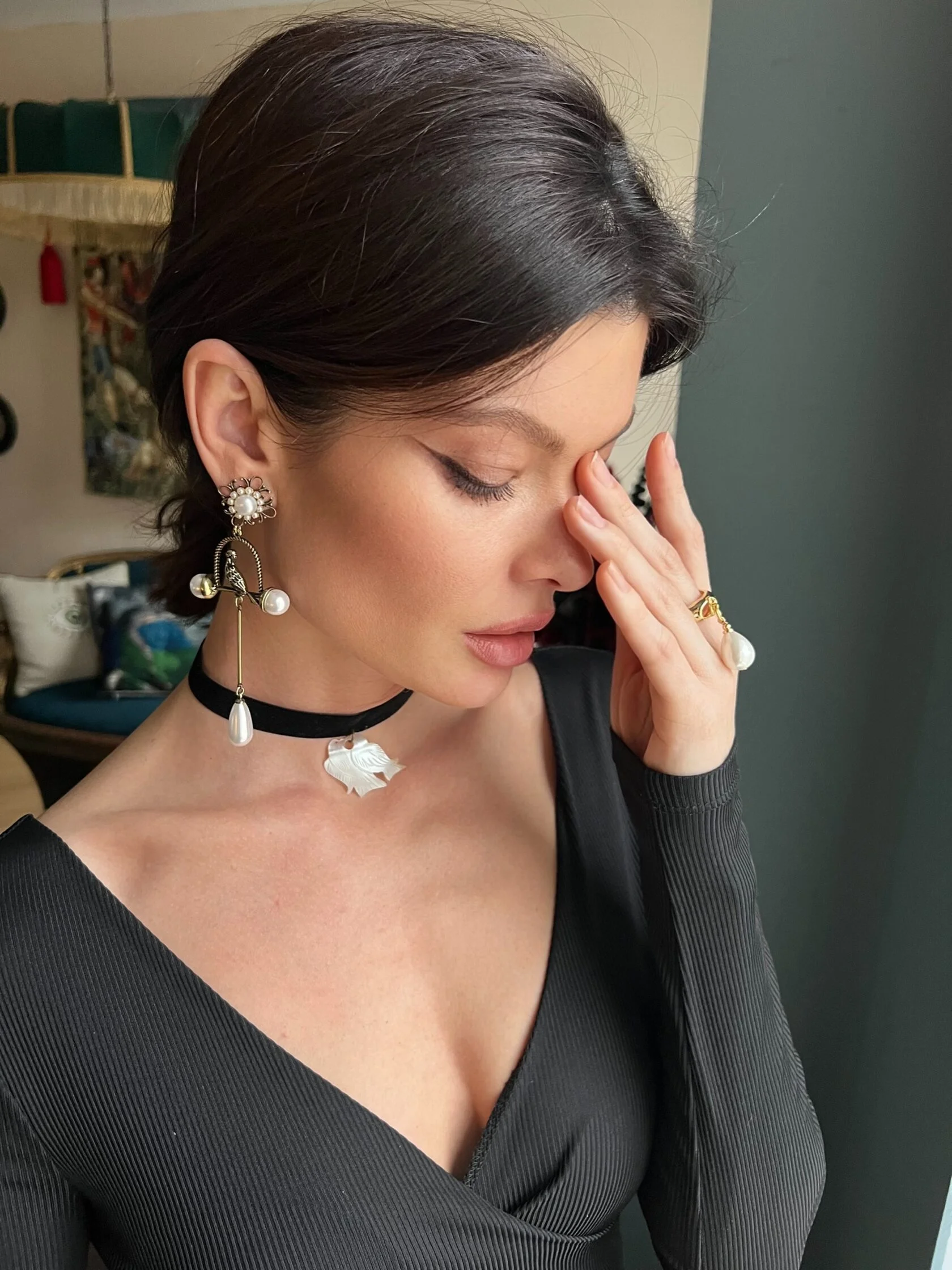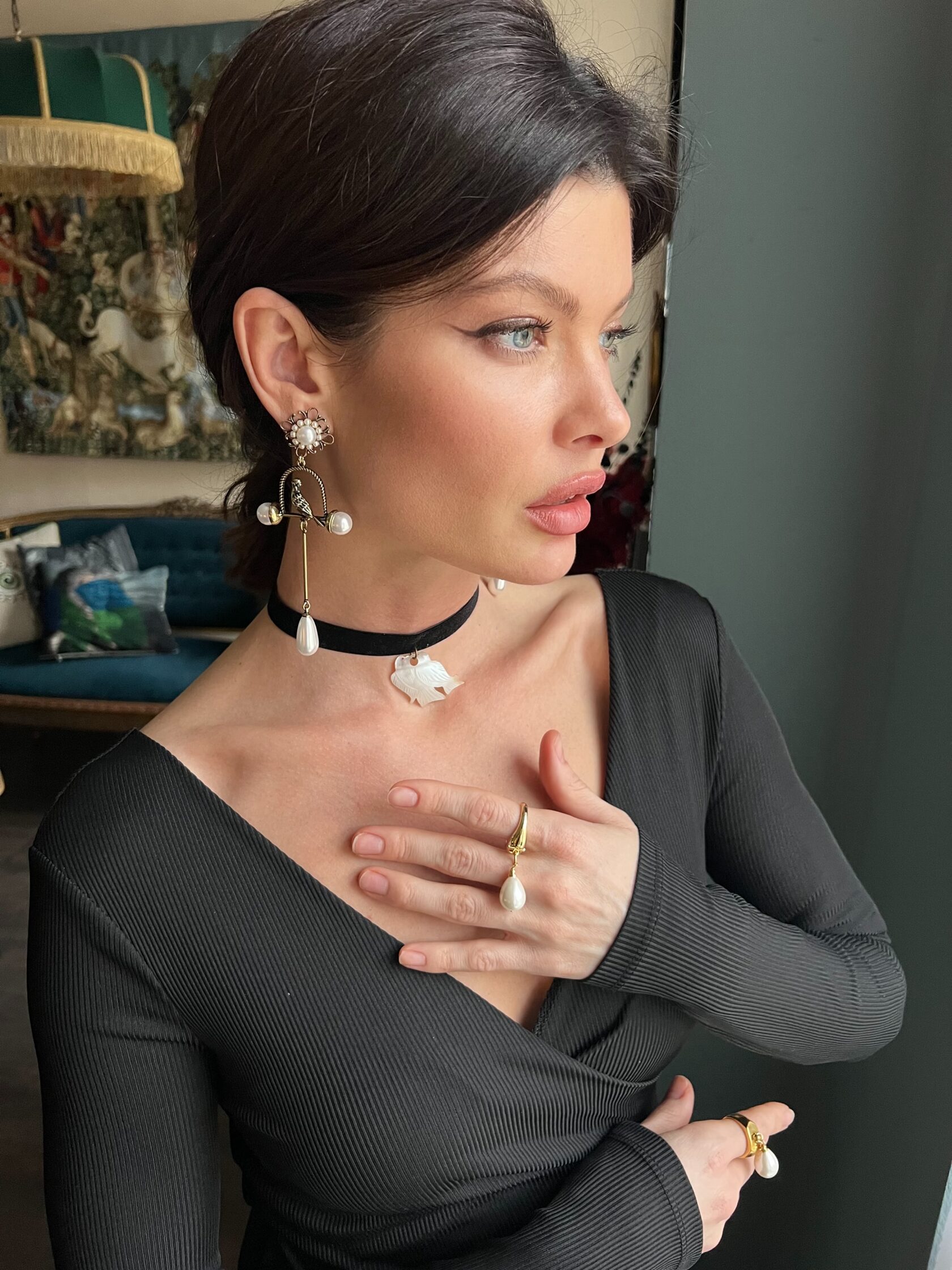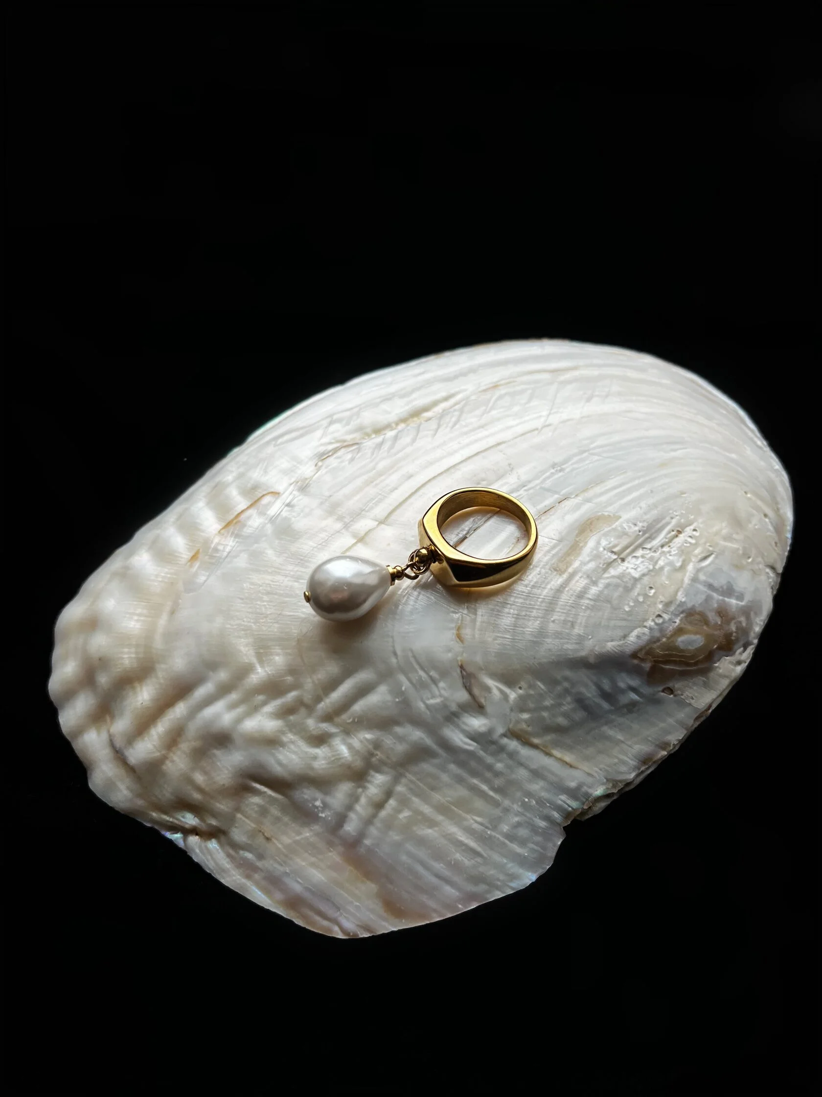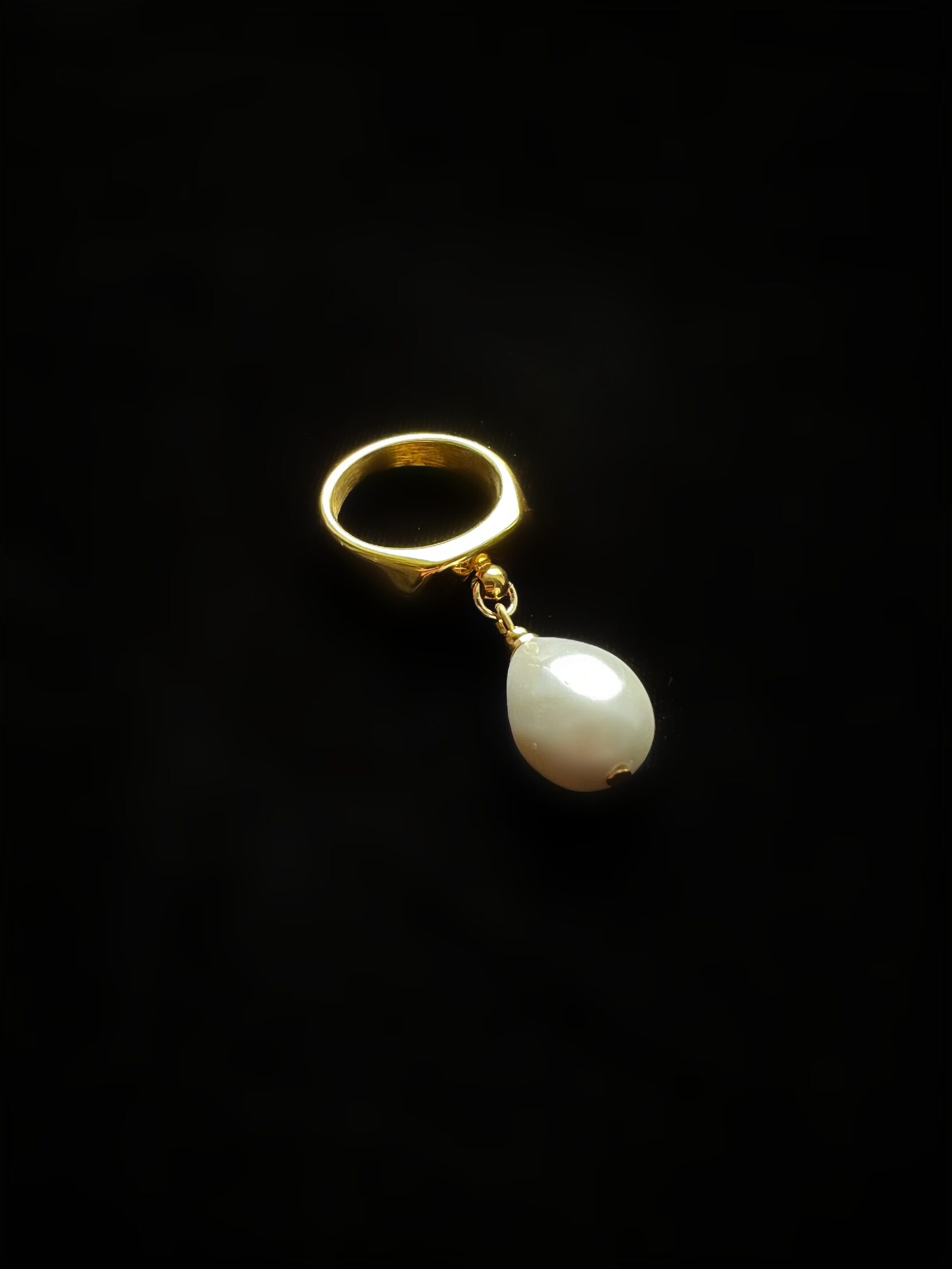 Кольцо из стали с позолотой украшено подвеской-каплей жемчуга майорка. Размер 18,5 нерегулируемый